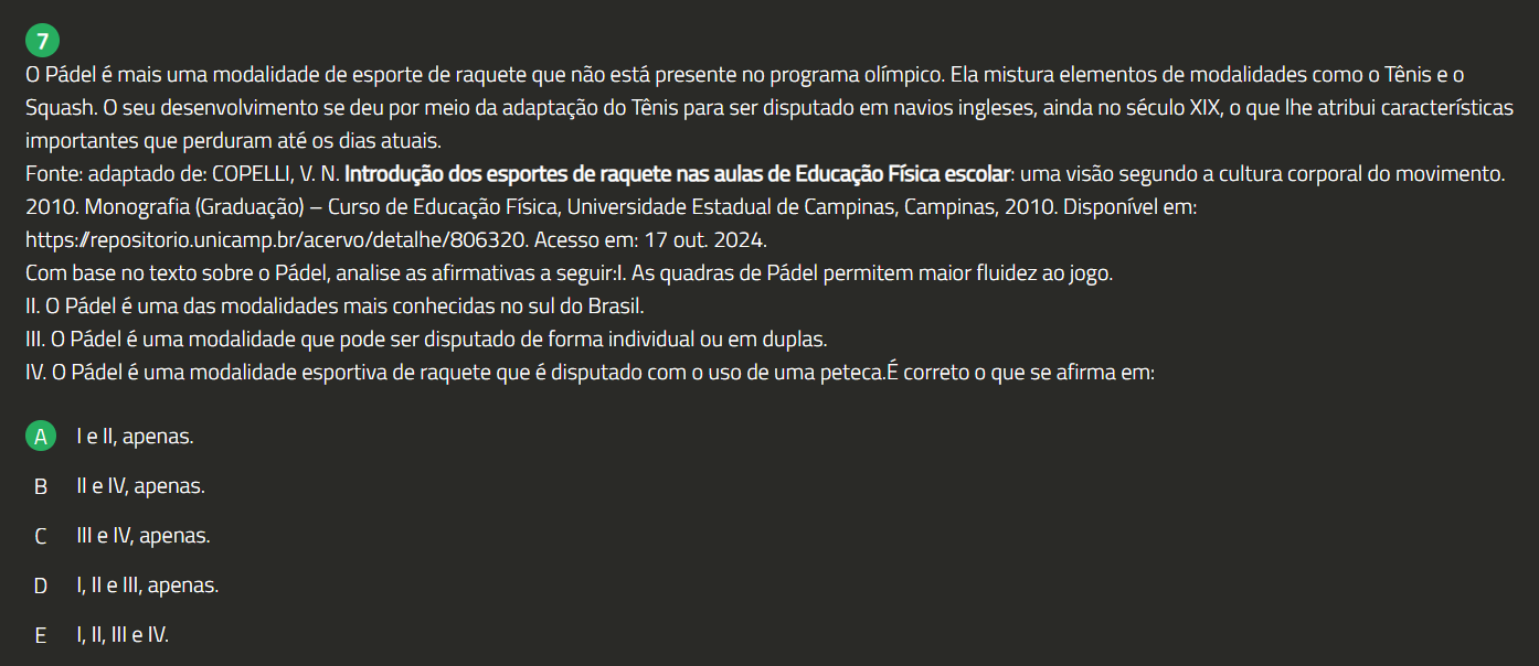 7 0 Pádel é mais uma modalidade de esporte de raquete que não está presente no programa olímpico. Ela mistura elementos de modalidades como 0 Tênis e 0 Squash. 0 seu desenvolvimento se deu por meio da adaptação do Tênis para ser disputado em navios ingleses, ainda no século XIX, 0 que lhe atribui características importantes que perduram até dias atuais. Fonte: adaptado de: COPELLI, V.N. Introdução dos esportes de raquete nas aulas de Educação Física escolar: uma visão segundo a cultura corporal do movimento. 2010. Monografia (Graduação) - Curso de Educação Física, Universidade Estadual de Campinas, Campinas, 2010. Disponível em: https:/repositorio.unicamp.br/acervo/detalhe/806320. Acesso em: 17 out. 2024. Com base no texto sobre 0 Pádel, analise as afirmativas a seguir:l. As quadras de Pádel permitem maior fluidez ao jogo. II. Pádel é uma das modalidades mais conhecidas no sul do Brasil. III. 0 Pádel é uma modalidade que pode ser disputado de forma individual ou em duplas. IV. 0 Pádel é uma modalidade esportiva de raquete que é disputado com 0 uso de uma peteca.É correto 0 que se afirma em: A I e II, apenas. B e IV, apenas. III e IV, apenas. D I, e III, apenas. E I, II, III e IV.