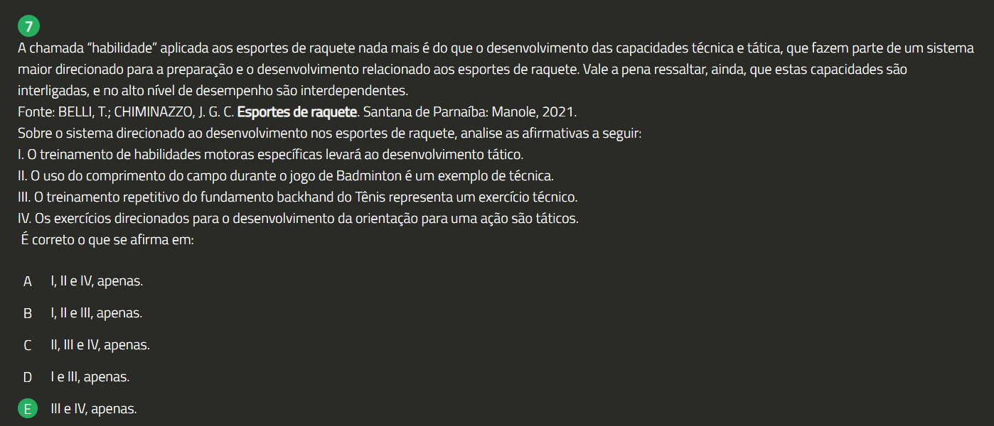 7 A chamada "habilidade" aplicada aos esportes de raquete nada mais é do que 0 desenvolvimento das capacidades técnica e tática, que fazem parte de um sistema maior direcionado para a preparação e 0 desenvolvimento relacionado aos esportes de raquete. Vale a pena ressaltar, ainda, que estas capacidades são interligadas, e no alto nível de desempenho são interdependentes. Fonte: BELLI, T.; CHIMINAZZO, J. G.C. Esportes de raquete. Santana de Manole, 2021. Sobre 0 sistema direcionado ao desenvolvimento nos esportes de raquete, analise as afirmativas a seguir: 0 treinamento de habilidades motoras específicas levará ao desenvolvimento tático. II. 0 uso do comprimento do campo durante 0 jogo de Badminton é um exemplo de técnica. III. treinamento repetitivo do fundamento backhand do Tênis representa um exercício técnico. IV. Os exercícios direcionados para desenvolvimento da orientação para uma ação são táticos. É correto 0 que se afirma em: A I, e IV, apenas. B I, e III, apenas. II, III e IV, apenas. D e III, apenas. E III e IV, apenas.