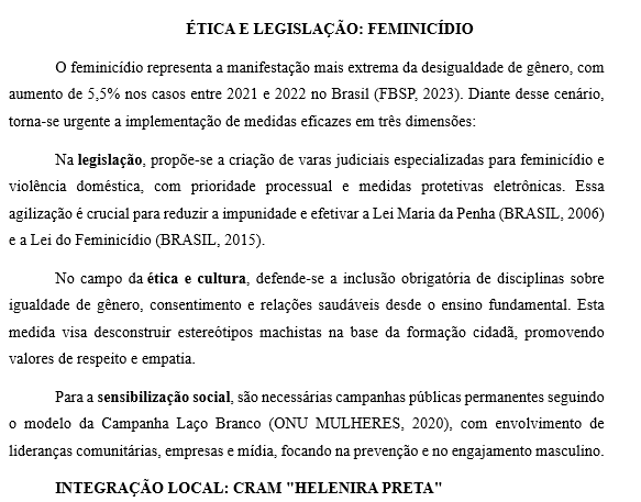 ÉTICAE LEGISLAÇÃO: FEMINICÍDIO O feminicidio representa a manifestação mais extrema da desigualdade de gênero, com aumento de 5,5% nos casos entre 2021 e 2022 no Brasil (FBSP, 2023). Diante desse torna-se urgente a implementação de medidas eficazes em três dimensões: Na legislação, a criação de varas judiciais especializadas para feminicidio e com prioridade processual e medidas protetivas Essa agilização é crucial para reduzir a impunidade e efetivar a Lei Maria da Penha (BRASIL, 2006) e a Lei do Feminicidio (BRASIL, 2015). No campo da e cultura, defende-se a inclusão obrigatoria de disciplinas sobre igualdade de consentimento e relações saudaveis desde 0 ensino fundamental. Esta medida visa desconstruir machistas na base da formação cidada, promovendo valores de respeito e empatia. Para a sensibilização social, são necessárias campanhas públicas permanentes seguindo 0 modelo da Campanha Laço Branco (ONU MULHERES, 2020), com envolvimento de lideranças empresas e midia, focando na prevenção e no engajamento masculino. INTEGRAÇÃO LOCAL: CRAM "HELENIRA PRETA"