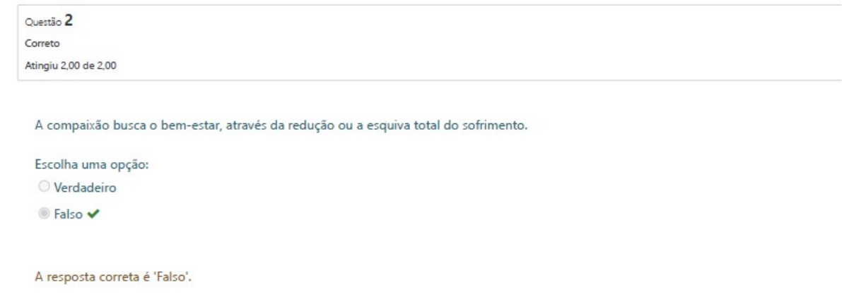 Questão 2 Correto Atingiu 2,00 de 2,00 A compaixão busca o bem-estar, através da redução ou a esquiva total do sofrimento. Escolha uma opção: Verdadeiro Falso A resposta correta é 'Falso'.