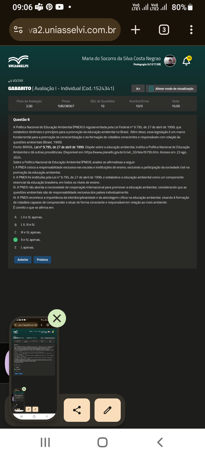09:06 LTE1 LTE2 80% va2.uniasselvi.com.br + 3 Maria do Socorro da Silva Costa Negrao 15 UNLASSELVI Pedagogia (4121128) VOLTAR GABARITO Avaliação Individual A+ Alterar modo de visualização Peso da Avaliação Prova Qtd. de Questões Acertos/Erros Nota 2,00 108238307 10 10/0 10,00 Questão 6 A Nacional de Educação Ambiental (PNEA) é regulamentada pela Lei Federal n° 9.795, de 27 de abril de 1999, que estabelece diretrizes e para a promoção da educação ambiental no Brasil. Além disso, essa legislação é um marco fundamental para a promoção da conscientização e da formação de cidadãos conscientes e responsáveis com relação às questões ambientais (Brasil, 1999). Fonte: Lei n° 9.795, de 27 de abril de 1999. Dispõe sobre a educação ambiental, institui a Nacional de Educação Ambiental e outras providências. Disponível em: https:/www.planalto.gov.br/ccivil_03/leis/19795.htm Acesso em: 23 ago. 2024. Sobre a Nacional de Educação Ambiental (PNEA), analise as afirmativas a seguir: A PNEA coloca a responsabilidade exclusiva nas escolas e instituições de ensino, excluindo a participação da sociedade civil na promoção da educação ambiental. II. A PNEA foi pela Lei n° 9.795, de 27 de abril de 1999, e estabelece a educação ambiental como um componente essencial da educação brasileira, em todos niveis de ensino. III. A PNEA não aborda a necessidade de cooperação internacional para promover a educação ambiental, considerando que as questões ambientais são de responsabilidade exclusiva dos países individualmente. IV. A PNEA reconhece a importância da interdisciplinaridade e da abordagem critica na educação ambiental, visando à formação de cidadãos capazes de compreender e atuar de forma consciente e responsável em relação ao meio ambiente. É correto que se afirma em: A e III, apenas. B III IV. C III e IV, apenas. II apenas. E apenas. Anterior Próxima X +