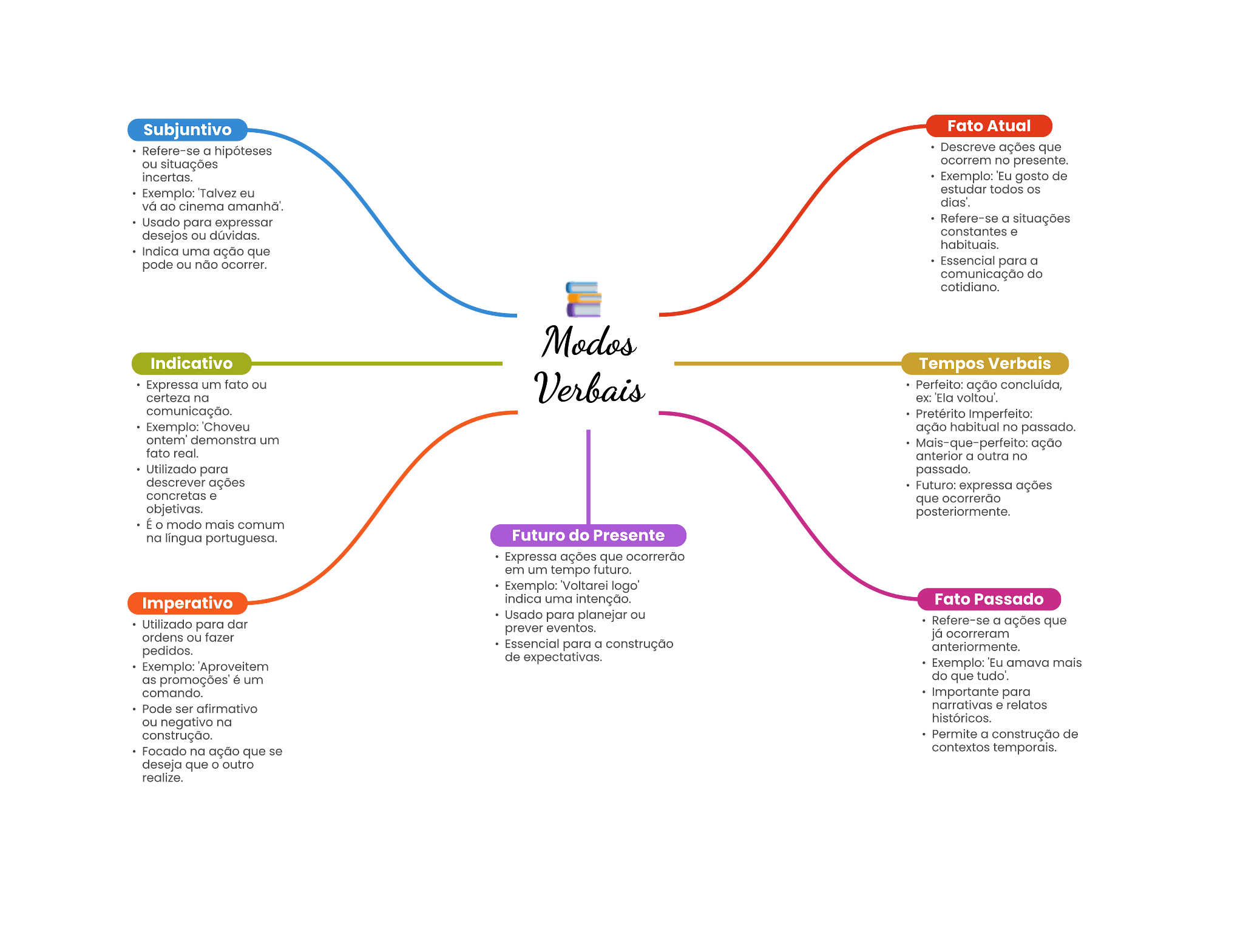 Subjuntivo Fato Atual Refere-se a Descreve ações que ou no presente. Exemplo: gosto de Exemplo: Talvez estudar todos OR vá cinema Usado para expressor Refere-se a situações desejos ou constantes . habituals. Indica uma ação que pode ou não Essencial para a comunicação do Indicativo Tempos Verbais Expresed um fato ou Perfeito: ação certeza na comunicação. Pretérito Exemplo: ação habitual no passado. ontern' demonstra um ação fato real. anterior a outra no Utilizado para passado. descrever ações Futuro: ações que ocorrerão É modo mais comum na lingua Futuro do Presente Expressa ações que em um tempo futuro. Exemplo: logo' Imperativo uma intenção. Fato Passado Usado para ou Utilizado para dar prever eventos. Refere-se a ações que ordens ou fazer ocorreram pedidos. Essencial para a construção de Exemplo: Exemplo: amova as um do que comando. Importante para Pode ser afirmativo narrativas relatos ou negativo na construção. Permite a construção de Focado na ação que deseja que outro