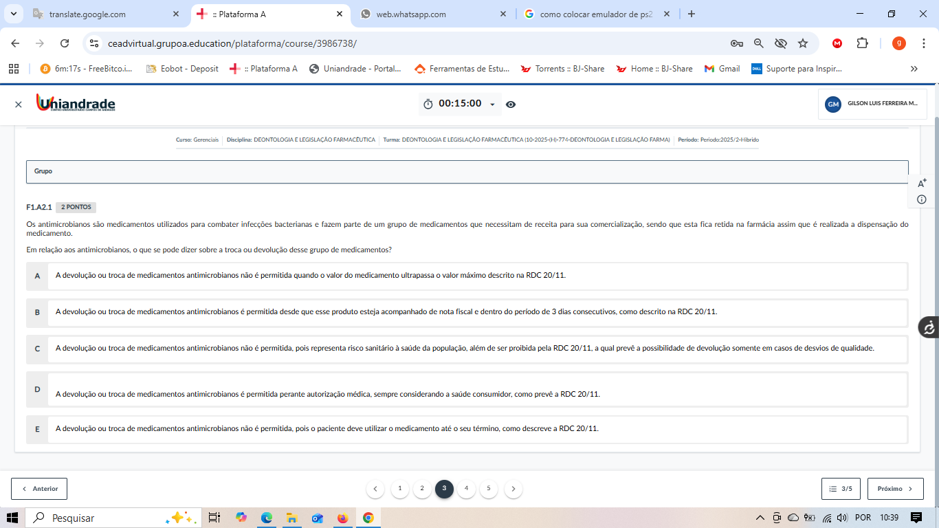 translate.google.com X Plataforma A web.whatsapp.com como colocar emulador de ps2 + X ceadvirtual.grupoa.education/plataforma/course/3986738/ g 6m:17s Eobot Deposit Plataforma A Uniandrade Portal... Ferramentas de Estu... Torrents BJ-Share Home BJ-Share Gmail Suporte para Inspir... Uniandrade 00:15:00 GM GILSON LUIS FERREIRA Curso: Gerenciais Disciplina: DEONTOLOGIA E LEGISLAÇÃO Turma: DEONTOLOGIA E LEGISLAÇÃO FARMA) Grupo i F1.A2.1 2 PONTOS Os antimicrobianos são medicamentos utilizados para combater infecções bacterianas e fazem parte de um grupo de medicamentos que necessitam de receita para sua comercialização, sendo que esta fica retida na assim que é realizada a dispensação do Em relação aos antimicrobianos, que se pode dizer sobre a troca ou devolução desse grupo de medicamentos? A A devolução ou troca de medicamentos antimicrobianos não é permitida quando valor do medicamento ultrapassa valor descrito na RDC 20/11. B A devolução ou troca de medicamentos antimicrobianos é permitida desde que esse produto esteja acompanhado de nota fiscal e dentro do de 3 dias como descrito na RDC 20/11. C A devolução ou troca de medicamentos antimicrobianos não é permitida, pois representa risco sanitário à saúde da população, além de ser proibida pela RDC a qual a possibilidade de devolução somente em casos de desvios de qualidade. D A devolução ou troca de medicamentos antimicrobianos é permitida perante autorização sempre considerando a saúde consumidor, como a RDC 20/11. E A devolução ou troca de medicamentos antimicrobianos não é permitida, pois paciente deve utilizar medicamento até seu como descreve a RDC 20/11. 3/5 > Pesquisar POR 10:39