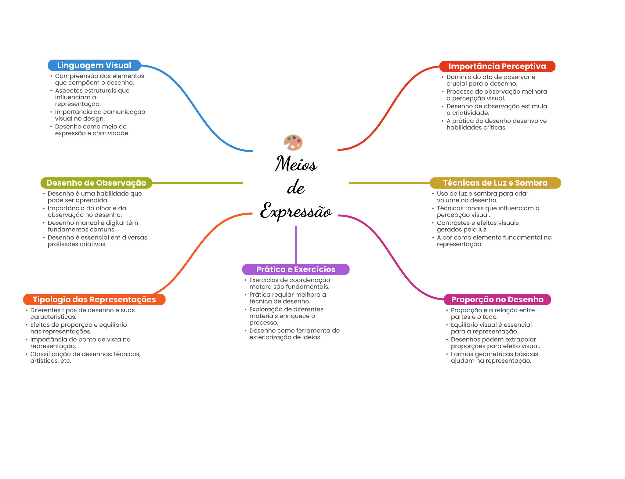 Linguagem Visual Importância Perceptiva dos elementos Domínio do ato de é que compõem o desenho. crucial para desenho. Aspectos que Processo de observação melhora a a percepção visual. representação. Desenho de observação estimula da comunicação a criatividade. visual no design. A prática do desenho desenvolve Desenho como melo de habilidades Desenho de Observação Técnicas de Luz e Sombra Desenho uma habilidade que Uso de luz sombra para criar pode ser aprendida. volume no desenho. do olhar da Técnicas que a observação no desenho. percepção visual. Desenho manual digital Contrastes efeitos fundamentos gerados pela Desenho em diverage A cor como elemento fundamental na criativas. representação. Prática e Exercícios Exercícios de coordenação motora são regular melhora a Tipologia das Representações técnica de desenho. Proporção no Desenho tipos de desenho Exploração de diferentes Proporção é a relação entre materials enriquece partes todo. Efeitos de proporção equilibrio processo. visual é essencial representações. Desenho como ferramenta de para a representação. do ponto de vista na exteriorização de Desenhos podem representação. proporções para efeito visual. de desenhos: técnicos, Formas etc. ajudam na representação.