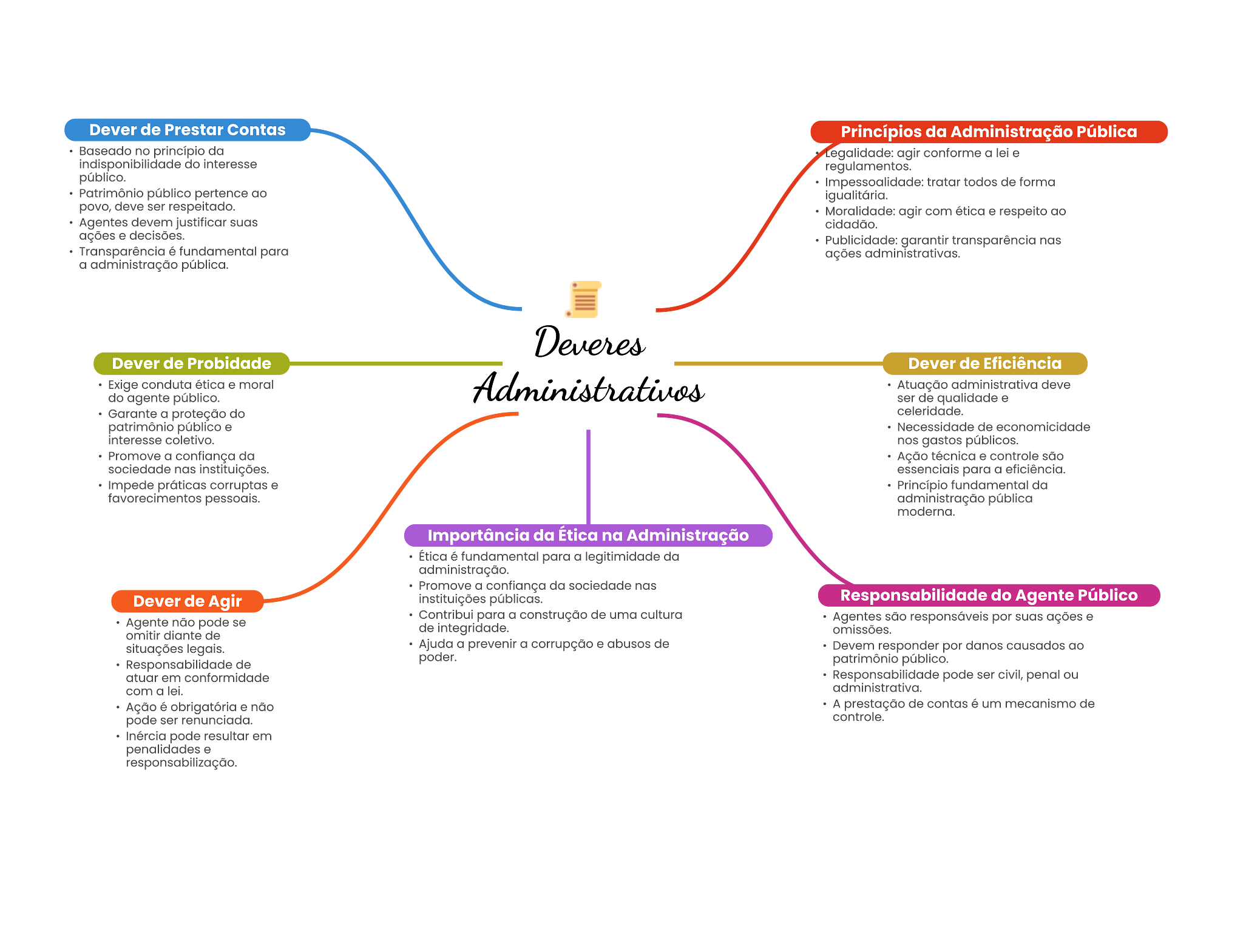 Dever de Prestar Contas Princípios da Administração Pública no Legalidade: agir conforme a do regulamentos. público. tratar todos de forma Patrimônio público pertence povo, deve ser Moralidade: agir com ética Agentes devem justificar cidadão. ações decisões. Publicidade: garantir transparência nas Transparência . para ações administrativas. a administração pública. Dever de Probidade Dever de Eficiência Exige conduta ética e moral administrativa deve do público. ser de qualidade Garante a proteção do patrimônio público Necessidade de economicidade coletivo. nos gastos públicos. Promove a confiança da sociedade nas instituições. para a eficiência. práticas corruptas fundamental da favorecimentos administração pública modema. Importância da Ética na Administração Ética é fundamental para a legitimidade da administração. Promove a da sociedade nas Dever de Agir instituições públicas. Responsabilidade do Agente Público Agents não pode se para a construção de uma cultura Agentee são responsávele por ações omitir de de integridade. omissões. situações Ajuda a a corrupção abusos de responder por dance causados Responsabilidade de poder. patrimônio público. atuar em conformidade Responsabilidade pode ser civil, penal ou com a administrativa. Ação obrigatória . não A prestação de contas um de pode ser controle. pode resultar em penalidades