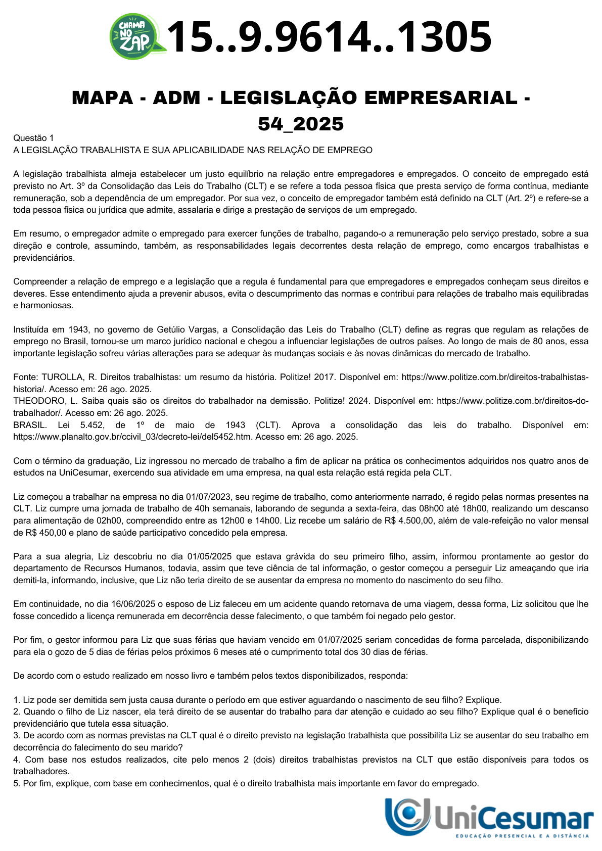 Questão 1 A LEGISLAÇÃO TRABALHISTA E SUA APLICABILIDADE NAS RELAÇÃO DE EMPREGO A legislação trabalhista almeja estabelecer um justo equilíbrio na relação entre empregadores e empregados. O conceito de empregado está previsto no Art. 3º da Consolidação das Leis do Trabalho (CLT) e se refere a toda pessoa física que presta serviço de forma contínua, mediante remuneração, sob a dependência de um empregador. Por sua vez, o conceito de empregador também está definido na CLT (Art. 2º) e refere-se a toda pessoa física ou jurídica que admite, assalaria e dirige a prestação de serviços de um empregado. Em resumo, o empregador admite o empregado para exercer funções de trabalho, pagando-o a remuneração pelo serviço prestado, sobre a sua direção e controle, assumindo, também, as responsabilidades legais decorrentes desta relação de emprego, como encargos trabalhistas e previdenciários. Compreender a relação de emprego e a legislação que a regula é fundamental para que empregadores e empregados conheçam seus direitos e deveres. Esse entendimento ajuda a prevenir abusos, evita o descumprimento das normas e contribui para relações de trabalho mais equilibradas e harmoniosas. Instituída em 1943, no governo de Getúlio Vargas, a Consolidação das Leis do Trabalho (CLT) define as regras que regulam as relações de emprego no Brasil, tornou-se um marco jurídico nacional e chegou a influenciar legislações de outros países. Ao longo de mais de 80 anos, essa importante legislação sofreu várias alterações para se adequar às mudanças sociais e às novas dinâmicas do mercado de trabalho. Fonte: TUROLLA, R. Direitos trabalhistas: um resumo da história. Politize! 2017. Disponível em: https://www.politize.com.br/direitos-trabalhistas- historia/. Acesso em: 26 ago. 2025. THEODORO, L. Saiba quais são os direitos do trabalhador na demissão. Politize! 2024. Disponível em: https://www.politize.com.br/direitos-do- trabalhador/. Acesso em: 26 ago. 2025. BRASIL. Lei 5.452, de 1º de maio de 1943 (CLT). Aprova a consolidação das leis do trabalho. Disponível em: https://www.planalto.gov.br/ccivil_03/decreto-lei/del5452.htm. Acesso em: 26 ago. 2025. Com o término da graduação, Liz ingressou no mercado de trabalho a fim de aplicar na prática os conhecimentos adquiridos nos quatro anos de estudos na UniCesumar, exercendo sua atividade em uma empresa, na qual esta relação está regida pela CLT. Liz começou a trabalhar na empresa no dia 01/07/2023, seu regime de trabalho, como anteriormente narrado, é regido pelas normas presentes na CLT. Liz cumpre uma jornada de trabalho de 40h semanais, laborando de segunda a sexta-feira, das 08h00 até 18h00, realizando um descanso para alimentação de 02h00, compreendido entre as 12h00 e 14h00. Liz recebe um salário de R$ 4.500,00, além de vale-refeição no valor mensal de R$ 450,00 e plano de saúde participativo concedido pela empresa. Para a sua alegria, Liz descobriu no dia 01/05/2025 que estava grávida do seu primeiro filho, assim, informou prontamente ao gestor do departamento de Recursos Humanos, todavia, assim que teve ciência de tal informação, o gestor começou a perseguir Liz ameaçando que iria demiti-la, informando, inclusive, que Liz não teria direito de se ausentar da empresa no momento do nascimento do seu filho. Em continuidade, no dia 16/06/2025 o esposo de Liz faleceu em um acidente quando retornava de uma viagem, dessa forma, Liz solicitou que lhe fosse concedido a licença remunerada em decorrência desse falecimento, o que também foi negado pelo gestor. Por fim, o gestor informou para Liz que suas férias que haviam vencido em 01/07/2025 seriam concedidas de forma parcelada, disponibilizando para ela o gozo de 5 dias de férias pelos próximos 6 meses até o cumprimento total dos 30 dias de férias. De acordo com o estudo realizado em nosso livro e também pelos textos disponibilizados, responda: 1. Liz pode ser demitida sem justa causa durante o período em que estiver aguardando o nascimento de seu filho? Explique. 2. Quando o filho de Liz nascer, ela terá direito de se ausentar do trabalho para dar atenção e cuidado ao seu filho? Explique qual é o benefício previdenciário que tutela essa situação. 3. De acordo com as normas previstas na CLT qual é o direito previsto na legislação trabalhista que possibilita Liz se ausentar do seu trabalho em decorrência do falecimento do seu marido? 4. Com base nos estudos realizados, cite pelo menos 2 (dois) direitos trabalhistas previstos na CLT que estão disponíveis para todos os trabalhadores. 5. Por fim, explique, com base em conhecimentos, qual é o direito trabalhista mais importante em favor do empregado. MAPA - ADM - LEGISLAÇÃO EMPRESARIAL - 54_2025 15..9.9614..1305 https://www.instagram.com/excellenceeducacional/p/DG1XaOaREOS/ https://www.instagram.com/excellenceeducacional/p/DG1XaOaREOS/