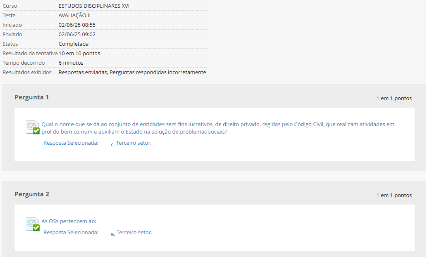 Curso ESTUDOS DISCIPLINARES XVI Teste AVALIAÇÃO Iniciado 02/06/25 08:55 Enviado 02/06/25 09:02 Status Completada Resultado da tentativa 10 em 10 pontos Tempo decorrido 6 minutos Resultados exibidos Respostas enviadas, Perguntas respondidas incorretamente Pergunta 1 1 em 1 pontos Qual o nome que se dá ao conjunto de entidades sem fins lucrativos, de direito privado, regidas pelo Código Civil, que realizam atividades em prol do bem comum e auxiliam o Estado na solução de problemas sociais? Resposta Selecionada: C. Terceiro setor. Pergunta 2 1 em 1 pontos As OSs pertencem ao: Resposta Selecionada: e. Terceiro setor.Pergunta 3 1 em 1 pontos Considerando os termos da lei que disciplinam trabalho voluntário, analise as afirmações e assinale a alternativa correta: I. Ele é entendido como a atividade não remunerada, prestada por pessoa física à entidade pública de qualquer natureza ou à instituição privada de fins não lucrativos, que tenha objetivos cívicos, culturais, educacionais, científicos, recreativos ou de assistência social, inclusive mutualidade. II. serviço voluntário será exercido mediante a celebração de termo de adesão entre a entidade pública ou privada e o prestador do serviço voluntário, nele devendo constar o objeto e as condições de seu exercício. III. prestador do serviço voluntário poderá ser ressarcido pelas despesas que comprovadamente realizar no desempenho das atividades voluntárias, desde que expressamente autorizadas pela entidade a que for prestado 0 serviço voluntário. IV. A União pode conceder auxilio-financeiro ao prestador de serviço voluntário com idade entre 16 e 24 anos integrante de família de baixa renda. V. Embora não gere vínculo empregatício, serviço voluntário gera obrigação providenciária. Resposta Selecionada: d. I, e III estão corretas. Pergunta 4 1 em 1 pontos Qual das alternativas corresponde a uma pessoa jurídica de direito privado, sem fins lucrativos, que se forma pela reunião de pessoas em prol de um objetivo comum? Resposta Selecionada: b. Associação.Pergunta 5 1 em 1 pontos Complete a lacuna com uma das alternativas. Caso se pretenda criar uma a documentação deve ser submetida ao Ministério Público previamente para Resposta Selecionada: d. Fundação. Pergunta 6 1 em 1 pontos Qual das alternativas corresponde ao certificado que possibilita a isenção da cota patronal do INSS às organizações detentoras dele? Resposta Selecionada: a. Cebas. Pergunta 7 1 em 1 pontos Assinale a alternativa que corresponde a uma pessoa jurídica constituída por patrimônio (bem imóvel, dinheiro ou créditos) aprovado pelo Ministério Público. Resposta Selecionada: e. Fundação.Pergunta 8 1 em 1 pontos A respeito do terceiro setor, analise as afirmativas, classificando-as como verdadeiras ou falsas. Ao final, assinale a opção que contenha a sequência correta. () Integram terceiro setor as pessoas jurídicas de direito privado, sem fins lucrativos, que exercem atividades de interesse público, não exclusivas de Estado, recebendo fomento do Poder Público. () As entidades do terceiro setor integram a Administração Pública em sentido formal. O terceiro setor coexiste com o primeiro setor, que é o próprio Estado, e com segundo setor, que é mercado. () Integram o terceiro setor as organizações sociais de interesse público e as organizações sociais. Resposta Selecionada: b. V,F,V,V.Pergunta 9 1 em 1 pontos Qual é nome genérico que se usa para identificar uma associação, ONG, instituição, instituto, fundação etc.? Resposta Selecionada: a. Terceiro setor. Pergunta 10 1 em 1 pontos Qual das alternativas corresponde ao sinônimo de entidade, sendo muito utilizado no Brasil? Resposta Selecionada: e. ONG.