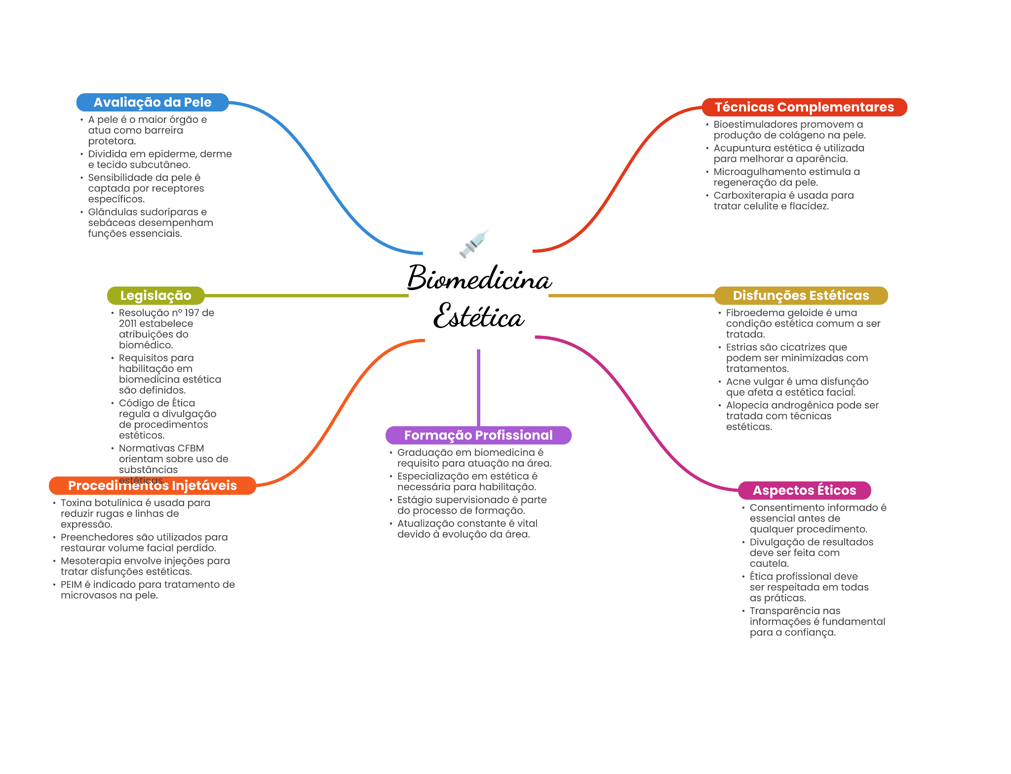 Avaliação da Pele Técnicas Complementares A pele malor órgão . atua como barreira promovem a protetora. produção de na Dividida em Acupuntura estática é utilizada subcutâneo. para melhorar a aparência. Sensibilidade da pele estimula a captada por receptores regeneração da pele. usada para tratar audoriparas desempenham funções essencials. Legislação Disfunções Estéticas Resolução 197 de é uma 2011 condição comum a ser atribuições do tratada. são cicatrizes que Requisitos para podem ser minimizadas com em biomedicina Acne vulgar é uma disfunção são que a Código de Ética androgênica pode ser regula a tratada com técnicas de procedimentos Formação Profissional Normativas CFBM orientam sobre de Graduação em requisito para atuação na Especialização em é Procedimentos Injetáveis necessária para habilitação. Aspectos Éticos Taxina é usada para é parte reduzir rugas e linhas de do processo de formação. Consentimento é Atualização constante vital antes de devido evolução da qualquer procedimento. Preenchedores utilizados para restaurar volume facial perdido. Divulgação de resultados deve ser feita com Mesoterapia envolve Injeções para tratar disfunções Ética deve PEIM indicado para tratamento de ser em todas microvasos na pele. as Transparência nas informações é para a conflança.
