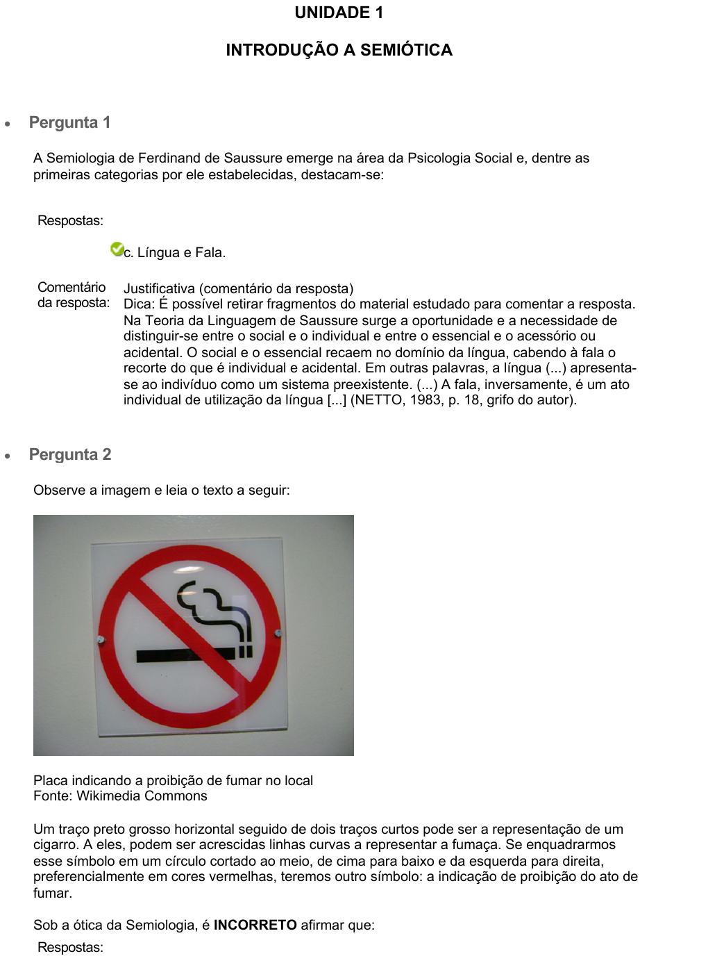 UNIDADE 1 INTRODUÇÃO A SEMIÓTICA • Pergunta 1 A Semiologia de Ferdinand de Saussure emerge na área da Psicologia Social e, dentre as primeiras categorias por ele estabelecidas, destacam-se: Respostas: c. Língua e Fala. Comentário da resposta: Justificativa (comentário da resposta) Dica: É possível retirar fragmentos do material estudado para comentar a resposta. Na Teoria da Linguagem de Saussure surge a oportunidade e a necessidade de distinguir-se entre o social e o individual e entre o essencial e o acessório ou acidental. O social e o essencial recaem no domínio da língua, cabendo à fala o recorte do que é individual e acidental. Em outras palavras, a língua (...) apresenta- se ao indivíduo como um sistema preexistente. (...) A fala, inversamente, é um ato individual de utilização da língua [...] (NETTO, 1983, p. 18, grifo do autor). • Pergunta 2 Observe a imagem e leia o texto a seguir: Placa indicando a proibição de fumar no local Fonte: Wikimedia Commons Um traço preto grosso horizontal seguido de dois traços curtos pode ser a representação de um cigarro. A eles, podem ser acrescidas linhas curvas a representar a fumaça. Se enquadrarmos esse símbolo em um círculo cortado ao meio, de cima para baixo e da esquerda para direita, preferencialmente em cores vermelhas, teremos outro símbolo: a indicação de proibição do ato de fumar. Sob a ótica da Semiologia, é INCORRETO afirmar que: Respostas: e. O significado é a parte física do signo. Comentário da resposta: Justificativa (comentário da resposta) Dica: É possível retirar fragmentos do material estudado para comentar a resposta. O conceito, o que a coisa física representa, o conteúdo, sua imagem mental é o seu significado. Nossa mente vê o sinal (significante entende que lá é proibido fumar (significado). Um signo é, portanto, constituído de significado e significante. E mais, não há signo que não os tenha. • Pergunta 3 De que forma o ser humano começa a se diferenciar dos diversos animais? Respostas: b. Refinando recursos para sua sobrevivência. Comentário da resposta: Justificativa (comentário da resposta) Dica: É possível retirar fragmentos do material estudado para comentar a resposta. O ser humano começa a se diferenciais dos outros animais refinando os recursos para sua sobrevivência. Ele cria utensílios como facas, potes, roupas, constrói abrigos, aprende a cultivar e a criar animais para sua alimentação, transporte e auxílio na caça. • Pergunta 4 Assinale a alternativa que corresponde à CORRETA correspondência entre as colunas. Coluna A I – Fala II – Língua III – Esquema IV – Uso Coluna B A – Código preexistente B – Ato individual de utilização da Língua C – Sistema social D – Modo de apropriação Respostas: a. I-B. II-C. III-A. IV-D. Comentário da resposta: Justificativa (comentário da resposta) Dica: É possível retirar fragmentos do material estudado para comentar a resposta. A Língua aponta para o sistema social historicamente construído, enquanto a Fala indica o ato de cada indivíduo na utilização da Língua. Louis Hjelmslev propõe o par mais geral de esquema, como um código preexistente e partilhado entre indivíduos, e uso como o modo particular que cada indivíduo se apropria e utiliza um esquema. Pergunta 1 A regra dos terços, na Linguagem Fotográfica, está relacionada a qual conceito semiológico? Respostas: a. Esquema. Comentário da resposta: Justificativa (comentário da resposta) Dica: É possível retirar fragmentos do material estudado para comentar a resposta. Se quisermos transpor as ideias de Saussure para a fotografia, podemos utilizar o conceito em sua reelaboração, de Louis Hjelmslev (1899-1965). Ao invés de Língua, utilizamos Esquema, e ao invés de Fala, Uso. O novo par esquema/uso transcende o limite da linguística e nos permite analisar outros objetos culturais. O esquema é o código, como a regra dos terços, e o uso é o modo como cada grupo ou indivíduo a utiliza. Pergunta 2 Analise as afirmações a seguir: I – Pode ser descrito como algo que está no lugar de outro algo. II – Um signo tem significado invariável. III – Significado e significante são como as duas faces da moeda de um signo. IV – Nem todos os signos são constituídos de significado e significante. Estão CORRETAS as afirmações: Respostas: b. I e III. Comentário da resposta: Justificativa (comentário da resposta) Dica: É possível retirar fragmentos do material estudado para comentar a resposta. Um signo pode ser descrito como algo que está no lugar de outro algo e, em Semiologia, é constituído de significado e significante, sendo que não há signo que não os tenha. Pergunta 3 As raízes da Semiologia apontam para qual outro campo de estudos? Respostas: c. Linguística. Comentário da resposta: Justificativa (comentário da resposta) Dica: É possível retirar fragmentos do material estudado para comentar a resposta. Apesar de oferecer bases significativas para o estudo da linguagem fotográfica, a Semiologia esbarra na questão de suas raízes. A Ciência proposta por Saussure nasce da Linguística e esta, como a própria denominação indica, está relacionada ao estudo das Línguas (em sua extensa complexidade), um objeto muito diferente da fotografia. Por mais que os signos estudados pela Semiologia não sejam exclusivamente linguísticos, seus métodos e conceitos têm lá sua origem. Nas palavras da semioticista Lúcia Santaella, “[...] fica aí em falta, contudo, uma fundação teórica consistente e homogênea capaz de plantar uma Ciência Semiótica a partir de raízes próprias” (SANTAELLA, 2006, p. 81-2). UNIDADE 2 TEORIA GERAL DOS SIGNOS • Pergunta 1 Analise as afirmações a seguir: I – O ser humano é um categorizador, e tanto a Ciência quanto a Filosofia se valem da categorização. Há, inclusive, pensadores que entraram para a História justamente pela qualidade das cate