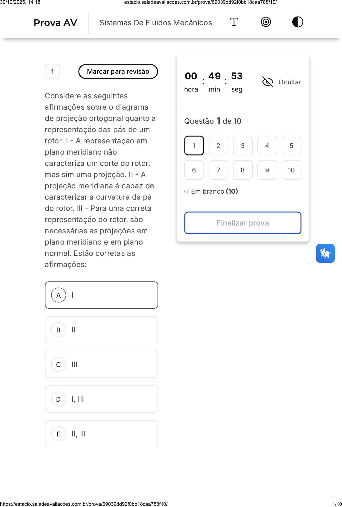 A B C D E 1 Marcar para revisão Considere as seguintes afirmações sobre o diagrama de projeção ortogonal quanto a representação das pás de um rotor: I - A representação em plano meridiano não caracteriza um corte do rotor, mas sim uma projeção. II - A projeção meridiana é capaz de caracterizar a curvatura da pá do rotor. III - Para uma correta representação do rotor, são necessárias as projeções em plano meridiano e em plano normal. Estão corretas as afirmações: I II III I, III II, III 00 hora : 49 min : 53 seg Ocultar Questão 1 de 10 Em branco (10) Finalizar prova 1 2 3 4 5 6 7 8 9 10 Prova AV Sistemas De Fluidos Mecânicos 30/10/2025, 14:18 estacio.saladeavaliacoes.com.br/prova/69039dd92f0bb18caa788f10/ https://estacio.saladeavaliacoes.com.br/prova/69039dd92f0bb18caa788f10/ 1/10 A B C D E 2 Marcar para revisão Escoamentos bidimensionais são caracterizados por um campo de velocidade variante em duas coordenadas espaciais, como por exemplo, as coordenadas x e y em um sistema cartesiano. Suponha que uma partícula de um líquido esteja escoando por esse campo bidimensional e que ela esteja rotacionando sobre o seu próprio eixo, além da sua velocidade ser transiente e possuir flutuações. As condições descritas acima caracterizam um escoamento: Laminar e permanente Laminar e transiente Uniforme e permanente Uniforme e transiente Turbulento e transiente 3 Marcar para revisão 30/10/2025, 14:18 estacio.saladeavaliacoes.com.br/prova/69039dd92f0bb18caa788f10/ https://estacio.saladeavaliacoes.com.br/prova/69039dd92f0bb18caa788f10/ 2/10 A B C D E Conhecer sistemas fluidos mecânicos é essencial para um profissional de engenharia. Projetar sistemas de bombeamento, selecionar bombas ou entender a relação entre a altura manométrica e a vazão volumétrica fazem parte do escopo do dia a dia do engenheiro. Uma bomba centrífuga contendo um rotor fechado opera com uma rotação de 1000 rpm e vazão volumétrica de 3 m³/h. Se a rotação for aumentada para 1500 rpm, a nova vazão volumétrica é: 4,5 m³/s 5,5 m³/s 6,5 m³/s 7,5 m³/s 8,5 m³/s 4 Marcar para revisão A escolha de uma turbobomba depende de muitos fatores, entre eles a vazão volumétrica na descarga da bomba e na altura manométrica que ela 30/10/2025, 14:18 estacio.saladeavaliacoes.com.br/prova/69039dd92f0bb18caa788f10/ https://estacio.saladeavaliacoes.com.br/prova/69039dd92f0bb18caa788f10/ 3/10 A B C D E deve proporcionar ao fluido. A altura manométrica produzida por uma bomba centrífuga no escoamento de um óleo mineral é de 55 metros. Sabendo que o coeficiente de correção para esse parâmetro é de 0,88, a altura manométrica corresponde em água é: 62,5 m 65,5 m 70,5 m 72,5 m 74,5 m 5 Marcar para revisão Uma máquina pode ser definida como um transformador de energia. Nas máquinas de fluido ocorre a troca de energia entre um sistema mecânico e um fluido, ou seja, a transformação de energia mecânica em energia de fluido ou energia de fluido em energia mecânica. Considere as afirmações a seguir sobre as Turbinas Francis, Kaplan e Pelton: I. A Turbina Pelton é 30/10/2025, 14:18 estacio.saladeavaliacoes.com.br/prova/69039dd92f0bb18caa788f10/ https://estacio.saladeavaliacoes.com.br/prova/69039dd92f0bb18caa788f10/ 4/10 A B C D E empregada em condições com baixa elevação de água. II. A Turbina Francis é indicada para elevações de água acima de 700 metros. III. A Turbina Kaplan é indicada para baixas alturas de elevação. I. I e II. III. II e III. II. 6 Marcar para revisão Uma máquina pode ser definida como um transformador de energia. Nas máquinas de fluido ocorre a troca de energia entre um sistema mecânico e um fluido, ou seja, a transformação de energia mecânica em energia de fluido ou energia de fluido em energia mecânica. Uma empresa energética planeja construir uma turbina para obtenção de energia elétrica. Sendo a altura de elevação de água igual a 200 metros e a vazão de 30/10/2025, 14:18 estacio.saladeavaliacoes.com.br/prova/69039dd92f0bb18caa788f10/ https://estacio.saladeavaliacoes.com.br/prova/69039dd92f0bb18caa788f10/ 5/10 A B C D E projeto 5m³/s, quais turbinas podem ser escolhidas por esta empresa? Turbina Kaplan ou Turbina Francis Turbina Francis ou Turbina Pelton Turbina Dériaz ou Turbina Francis Turbina Kaplan e Turbina Pelton Apenas Turbina Francis 7 Marcar para revisão Conhecer sistemas fluidos mecânicos é essencial para um profissional de engenharia. Projetar sistemas de bombeamento, selecionar bombas ou entender a relação entre a altura manométrica e a vazão volumétrica fazem parte do escopo do dia a dia do engenheiro. Uma bomba centrífuga contendo um rotor fechado opera com uma rotação de 1000 rpm e uma altura manométrica de 4 metros. Se a rotação for 30/10/2025, 14:18 estacio.saladeavaliacoes.com.br/prova/69039dd92f0bb18caa788f10/ https://estacio.saladeavaliacoes.com.br/prova/69039dd92f0bb18caa788f10/ 6/10 A B C D E aumentada para 1800 rpm, a nova altura manométrica é: 10,96 m 11,96 m 12,96 m 13,96 m 14,96 m 8 Marcar para revisão A escolha de uma turbobomba depende de muitos fatores, entre eles a vazão volumétrica na descarga da bomba e na altura manométrica que ela deve proporcionar ao fluido. Uma polpa homogênea não newtoniana contendo carvão e água apresenta uma densidade relativa de 1,139. Uma bomba centrífuga deverá bombear 12 litros por segundo dessa polpa. Utilizando a figura abaixo, determine a eficiência da bomba? 30/10/2025, 14:18 estacio.saladeavaliacoes.com.br/prova/69039dd92f0bb18caa788f10/ https://estacio.saladeavaliacoes.com.br/prova/69039dd92f0bb18caa788f10/ 7/10 A B C D E Fonte: WALKER, C. I. and GOULAS, A. "Performance Characteristics of Centrifugal Pumps When Handling Non- Newtonian Homogeneous Slurries." Proceedings of the Institution of Mechanical Engineers, Part A: Journal of Power and Energy 198, 1984, pág. 41 - 49. 30% 32% 36% 40% 42% 9 Marcar para revisão Uma máquina pode ser de