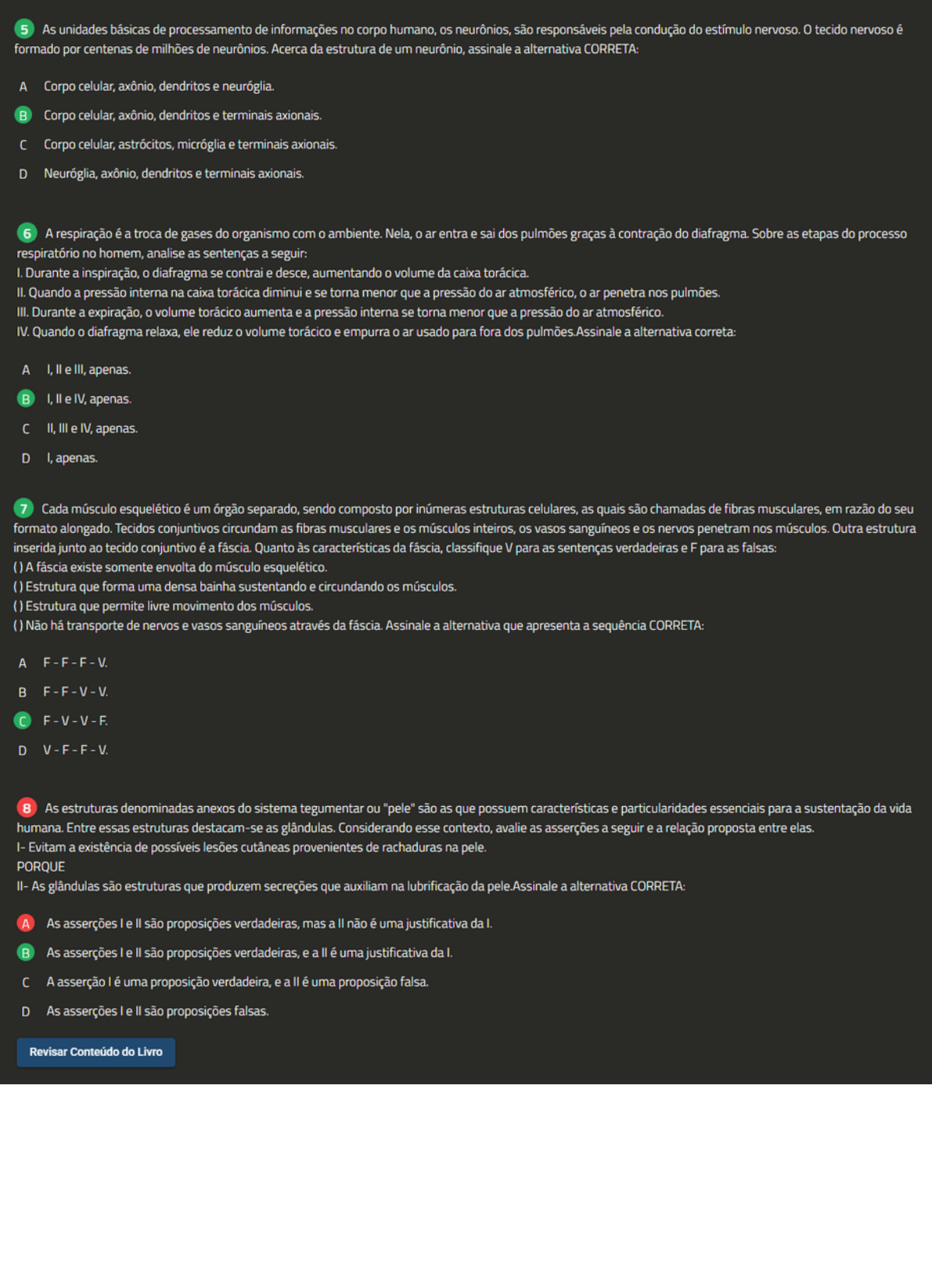 5 As unidades básicas de processamento de informações no corpo humano, os neurônios, são responsáveis pela condução do estímulo nervoso. 0 tecido nervoso é formado por centenas de milhões de neurônios. Acerca da estrutura de um neurônio, assinale a alternativa CORRETA: A Corpo celular, axônio, dendritos e neuróglia. Corpo celular, axônio, dendritos e terminais axionais. Corpo celular, astrócitos, micróglia e terminais axionais. D Neuróglia, axônio, dendritos e terminais axionais. 6 A respiração é a troca de gases do organismo com 0 ambiente. Nela, ar entra e sai dos pulmões graças à contração do diafragma. Sobre as etapas do processo respiratório no homem, analise as sentenças a seguir: I. Durante a inspiração, diafragma se contrai e desce, aumentando volume da caixa torácica. II. Quando a pressão interna na caixa torácica diminui e se torna menor que a pressão do ar atmosférico, ar penetra nos pulmões. III. Durante a expiração, 0 volume torácico aumenta e a pressão interna se torna menor que a pressão do ar atmosférico. IV. Quando diafragma relaxa, ele reduz 0 volume torácico e empurra ar usado para fora dos pulmões.Assinale a alternativa correta: A I, e III, apenas. I, e IV, apenas. II, III e IV, apenas. D I, apenas. 7 Cada músculo esquelético é um órgão separado, sendo composto por inúmeras estruturas celulares, as quais são chamadas de fibras musculares, em razão do seu formato alongado. Tecidos conjuntivos circundam as fibras musculares e músculos inteiros, vasos sanguíneos e os nervos penetram nos músculos. Outra estrutura inserida junto ao tecido conjuntivo é a fáscia. Quanto às características da fáscia, classifique V para as sentenças verdadeiras e F para as falsas: () A fáscia existe somente envolta do músculo esquelético. () Estrutura que forma uma densa bainha sustentando e circundando os músculos. () Estrutura que permite livre movimento dos músculos. () Não há transporte de nervos e vasos sanguíneos através da fáscia. Assinale a alternativa que apresenta a sequência CORRETA: A F-F-F-V. F-F-V-V. D V-F-F-V. 8 As estruturas denominadas anexos do sistema tegumentar ou "pele" são as que possuem características e particularidades essenciais para a sustentação da vida humana. Entre essas estruturas destacam-se as glândulas. Considerando esse contexto, avalie as asserções a seguir e a relação proposta entre elas. I- Evitam a existência de possíveis lesões cutâneas provenientes de rachaduras na pele. PORQUE II- As glândulas são estruturas que produzem secreções que auxiliam na lubrificação da pele.Assinale a alternativa CORRETA: A As asserções e são proposições verdadeiras, mas a não é uma justificativa da As asserções e são proposições verdadeiras, e a é uma justificativa da I. A asserção é uma proposição verdadeira, e a II é uma proposição falsa. D As asserções e são proposições falsas. Revisar Conteúdo do Livro
