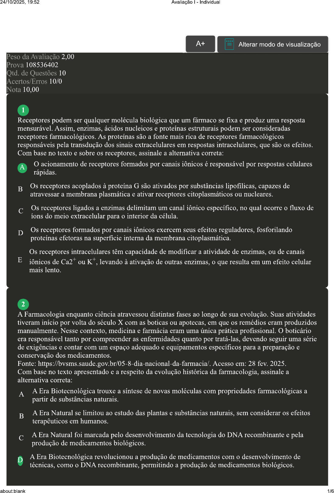 24/10/2025, 19:52 Avaliação I Individual A+ Alterar modo de visualização Peso da Avaliação 2,00 Prova 108536402 Qtd. de Questões 10 Acertos/Erros 10/0 Nota 10,00 1 Receptores podem ser qualquer molécula biológica que um fármaco se fixa e produz uma resposta mensurável. Assim, enzimas, ácidos nucleicos e proteínas estruturais podem ser consideradas receptores farmacológicos. As proteínas são a fonte mais rica de receptores farmacológicos responsáveis pela transdução dos sinais extracelulares em respostas intracelulares, que são os efeitos. Com base no texto e sobre os receptores, assinale a alternativa correta: A acionamento de receptores formados por canais iônicos é responsável por respostas celulares rápidas. Os receptores acoplados à proteína G são ativados por substâncias lipofílicas, capazes de atravessar a membrana plasmática e ativar receptores citoplasmáticos ou nucleares. Os receptores ligados a enzimas delimitam um canal iônico específico, no qual ocorre o fluxo de íons do meio extracelular para o interior da célula. D Os receptores formados por canais iônicos exercem seus efeitos reguladores, fosforilando proteínas e efetoras na interna da membrana citoplasmática. Os receptores intracelulares têm capacidade de modificar a atividade de enzimas, ou de canais E iônicos de Ca2⁺ ou K⁺, levando à ativação de outras enzimas, o que resulta em um efeito celular mais lento. 2 A Farmacologia enquanto ciência atravessou distintas fases ao longo de sua evolução. Suas atividades tiveram início por volta do século X com as boticas ou apotecas, em que os remédios eram produzidos manualmente. Nesse contexto, medicina e farmácia eram uma única prática profissional. boticário era responsável tanto por compreender as enfermidades quanto por tratá-las, devendo seguir uma série de exigências e contar com um espaço adequado e equipamentos específicos para a preparação e conservação dos medicamentos. Fonte: https://bvsms.saude.gov.br/05-8-dia-nacional-da-farmacia/.Acesso em: 28 fev. 2025. Com base no texto apresentado e a respeito da evolução histórica da farmacologia, assinale a alternativa correta: A A Era Biotecnológica trouxe a síntese de novas moléculas com propriedades farmacológicas a partir de substâncias naturais. A Era Natural se limitou ao estudo das plantas e substâncias naturais, sem considerar os efeitos terapêuticos em humanos. A Era Natural foi marcada pelo desenvolvimento da tecnologia do DNA recombinante e pela produção de medicamentos biológicos. D A Era Biotecnológica revolucionou a produção de medicamentos com o desenvolvimento de técnicas, como o DNA recombinante, permitindo a produção de medicamentos biológicos. about:blank 1/624/10/2025, 19:52 Avaliação - Individual E A Era Sintética teve como foco o conhecimento popular e o uso plantas medicinais, sem utilizar métodos científicos. 3 A biodisponibilidade é um conceito fundamental na farmacocinética, que descreve a fração de uma dose administrada de um fármaco que alcança a circulação sistêmica na sua forma inalterada. Esse parâmetro é crucial para determinar a eficácia terapêutica de um medicamento, pois a concentração do fármaco no local de ação está diretamente relacionada à sua biodisponibilidade. Considerando as informações apresentadas, avalie as asserções a seguir e a relação proposta entre elas: I. A biodisponibilidade de um fármaco administrado por via intravenosa é considerada de 50%, pois o fármaco é introduzido diretamente na circulação sistêmica, sem sofrer o efeito de primeira passagem. PORQUE II. efeito de primeira passagem pode reduzir significativamente a biodisponibilidade de um fármaco administrado por via oral, pois uma parte da dose é metabolizada pelo fígado antes de atingir a circulação sistêmica. A respeito dessas asserções, assinale a opção correta: A A asserção I é uma proposição falsa, e a II é uma proposição verdadeira. As asserções I e II são falsas. A asserção I é uma proposição verdadeira, e a II é uma proposição falsa. D As asserções I e II são verdadeiras, mas a II não é uma justificativa correta da I. E As asserções I e II são verdadeiras, e a II é uma justificativa correta da I. 4 As propriedades farmacológicas de muitos fármacos podem mudar de acordo com o tempo e frequência de administração, pois os receptores, também, estão sujeitos aos controles homeostáticos que envolvem síntese ou degradação de receptores por diferentes tipos de mecanismos. As proteínas transdutoras e efetoras são reguladas de modo semelhante aos receptores. As variações na sensibilidade do receptor a um fármaco agonista podem ocorrer tanto no sentido de diminuição (dessensibilização ou tolerância) como de aumento (hipersensibilização). Com base no texto e sobre as variações na sensibilidade do receptor, analise as afirmativas a seguir: I. A hipersensibilização é caracterizada pela perda de responsividade do receptor ao agonista. II. A tolerância é associada a receptores, sendo caracterizada pela hipersensibilidade do efetor à ação do fármaco. III. A dessensibilização pode ocorrer pela presença permanente do agonista ou pela dissociação lenta do complexo fármaco-receptor. IV. A relação dose-resposta de um fármaco agonista, é determinada pela dose do fármaco administrado, pela afinidade do fármaco ao receptor e por fatores característicos do perfil farmacocinético do fármaco. É correto o que se afirma em: A I, apenas. B III e IV, apenas. I, II e III, apenas. about:blank 2/624/10/2025, 19:52 Avaliação - Individual D II e IV, apenas. E I, II, III e IV. 5 Os primeiros passos para a criação de um novo medicamento ocorrem na etapa de pesquisa, na qual grandes empresas farmacêuticas trabalham muitas vezes em conjunto com startups, universidades e centros de pesquisa. trabalho consiste inicialmente em achar uma mo