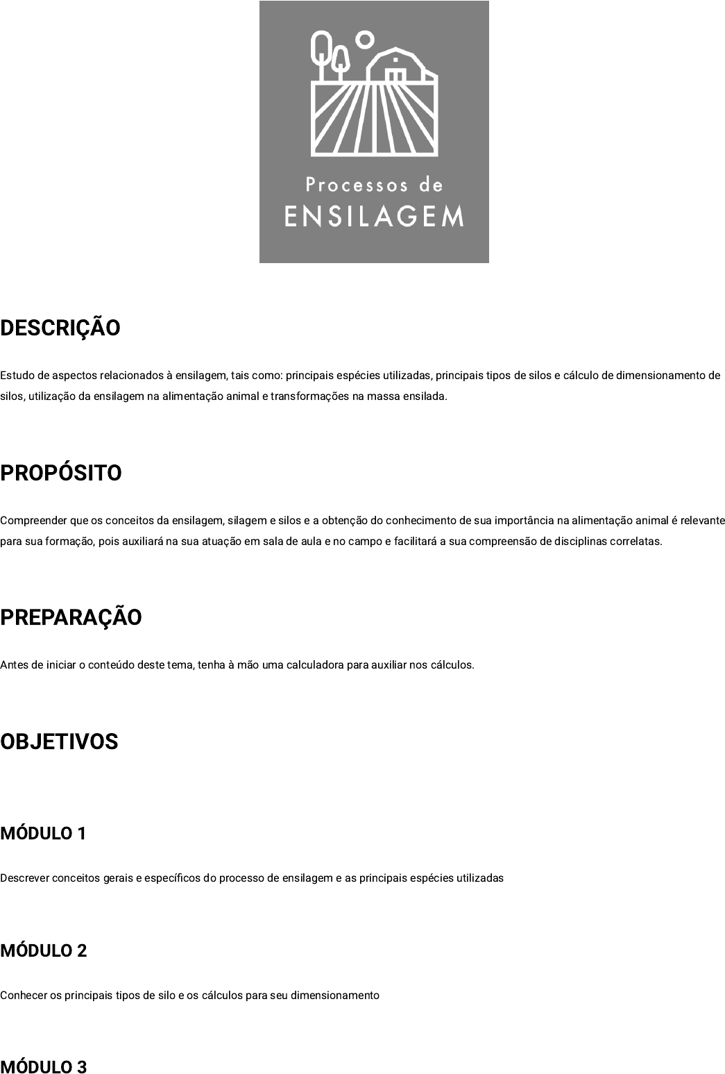 DESCRIÇÃO Estudo de aspectos relacionados à ensilagem, tais como: principais espécies utilizadas, principais tipos de silos e cálculo de dimensionamento de silos, utilização da ensilagem na alimentação animal e transformações na massa ensilada. PROPÓSITO Compreender que os conceitos da ensilagem, silagem e silos e a obtenção do conhecimento de sua importância na alimentação animal é relevante para sua formação, pois auxiliará na sua atuação em sala de aula e no campo e facilitará a sua compreensão de disciplinas correlatas. PREPARAÇÃO Antes de iniciar o conteúdo deste tema, tenha à mão uma calculadora para auxiliar nos cálculos. OBJETIVOS MÓDULO 1 Descrever conceitos gerais e específicos do processo de ensilagem e as principais espécies utilizadas MÓDULO 2 Conhecer os principais tipos de silo e os cálculos para seu dimensionamento MÓDULO 3 Descrever os fundamentos da ensilagem aplicados na alimentação animal e as transformações na massa ensilada INTRODUÇÃO Neste tema, vamos aprender sobre os processos de ensilagem, as diferentes etapas, fases e seus conceitos, reconhecendo as principais espécies utilizadas. Realizaremos cálculos de dimensionamento de silos, adequando aos diferentes tipos de silos utilizados. Vamos relacionar a ensilagem, que é um processo de conservação da forragem, com a alimentação animal, principalmente, de ruminantes, que precisam de suprimento contínuo de boa qualidade para que possam expressar seu potencial de produção. MÓDULO 1  Descrever conceitos gerais e específicos do processo de ensilagem e as principais espécies utilizadas CONCEITOS GERAIS Ensilagem é o processo de conservação que envolve corte da forragem no campo, armazenamento no silo, compactação e proteção com a vedação do silo para que haja fermentação para a produção de silagem. Na conservação de forragens, busca-se criar condições em que o valor nutritivo seja preservado. Processos de conservação como a ensilagem buscam minimizar os efeitos das diferentes estações do ano sobre a produção de pastagens, fazendo com que forragens produzidas na estação chuvosa sejam armazenadas e conservadas, para serem utilizadas na estação seca, onde há escassez de alimento. A silagem é o material produzido por meio de um processo de fermentação anaeróbica da forragem. O silo, por sua vez, é o local onde é armazenado o material vegetal para formar a silagem, durante o processo de ensilagem. ENSILAGEM Em virtude das condições climáticas do nosso país, em certas épocas do ano, ocorre escassez de pastagem e em outras, mais favoráveis, temos excesso, tornando a produção bastante irregular. Portanto, a produção de silagem torna-se bastante relevante no campo. Podemos definir a ensilagem como um processo de conservação de forragens em meio ácido e anaeróbico. O processo da ensilagem, que dura, no mínimo, 21 dias, baseia-se na redução do pH da forragem, de 6,5 para valores abaixo de 4,0, por meio da conversão de açúcares a ácidos, especialmente, ácido lático, mediante o desenvolvimento de bactérias láticas. Para obter sucesso na produção de silagem, durante o processo de ensilagem, precisamos respeitar as seguintes etapas: COLHEITA DO MATERIAL VEGETAL A etapa da colheita é muito importante e possui grande impacto na qualidade do material a ser produzido. Esta etapa possui como objetivo a obtenção de alta produtividade da cultura vegetal, com a manutenção da qualidade da silagem. A colheita depende, dentre outros fatores, do estágio de maturidade vegetal. Plantas muito novas quando colhidas podem desencadear uma fermentação indesejada com produção de efluentes na silagem causando perdas na produtividade vegetal. Por outro lado, quando são colhidas muito maduras, também podemos observar consequências negativas, como menor digestibilidade, grande perda de material e dificuldades na compactação, podendo propiciar o surgimento de mofos na silagem. Estas perdas de material vegetal ocorrem devido ao processo de respiração das células vegetais, que continua após a colheita, processo este permitido pela presença de pH alto, oxigênio e açúcares disponíveis. Portanto, altas taxas de respiração celular podem representar perdas de nutrientes do material, reduzindo a qualidade da silagem. Precisamos, então, reduzir ao máximo o tempo entre colheita e compactação. Fonte: Shutterstock.com O momento do corte depende da fisiologia, que é afetada pela umidade, temperatura, fertilidade do solo etc. O ponto de corte do milho, um dos principais materiais utilizados para produção de silagem e do sorgo dependerá do grau de maturidade dos grãos. Nos capins, como o elefante, observam-se a digestibilidade e a produtividade vegetal para se obter o melhor aproveitamento do material. Para gramíneas tropicais, este equilíbrio ocorre entre 45 e 60 dias. PICAGEM A etapa da picagem ocorre após a colheita, sendo relevante para a compactação do material vegetal. O tamanho padrão das partículas situa-se entre 8 e 25 mm. Partículas menores, resultantes de picagem excessiva, prejudicam o animal, que necessita de certa quantidade de fibra longa na dieta. Por outro lado, partículas grandes dificultam a compactação do material vegetal no silo, prejudicando o processo de ensilagem, e permitem que os animais selecionem o alimento, causando prejuízos na nutrição, podendo ocasionar doenças como a acidose. A picagem promove o rompimento celular, provocando a degradação de amido e de hemicelulose (componente da parede celular vegetal), aumentando a porcentagem de açúcar no material a ser ensilado. Fonte: Shutterstock.com TRANSPORTE ATÉ O SILO Após a picagem, o material deve ser transportado até os silos. Nesta etapa, precisamos considerar a distância a ser percorrida e a capacidade dos carros transportadores, a fim de permitir que o espaço de tempo entre o corte e a compactação seja o menor possíve