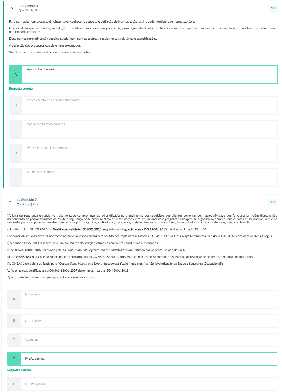Questão 1 1 Questão objetiva Para normatizar um processo éindispensável conhecer conceito e definição de assim, podemosdizer que normatização é: É a atividade que emrelação a problemas existentes ou potenciais, prescrições destinadas comum e repetitiva com vistas à obtenção do grau ótimo de ordem emum determinado Documentos normativos são aqueles quedefinem normas técnicas, relatórios e especificações. A definição dos processos que devemser executados. São documentos estabelecidos porconsenso entre as partes. Apenas está A Resposta correta está correta e as demais Apenas III estão IV está correta e esta errada: D e IV estão corretas. E Questão 2 1/1 Questão objetiva "A falta de segurança e saúde no trabalho pode comprometernão só a eficácia no atendimento dos requisitos dos clientes como também aprodutividade dos funcionários. Além disso, não atendimento de de saúde e segurança pode criar um clima de insatisfação entre osfuncionários e prejudicar a imagem da organização perante seus clientes que no médio/longo prazo pode ter um efeito devastador para aorganização. a organização deve atender às normas e regulamentosrelacionados a saúde e segurança no L. M. Gestão da qualidade ISO9001:2015: requisitos e integração com a ISO São p. 81. Por conta da situação exposta no trecho muitasempresas têm optado por implementar a norma OHSAS A respeito danorma OHSAS considere os itens a seguir: I) A norma OHSAS 18001 incentiva uso consciente daenergia elétrica nos ambientes produtivos e II. A OHSAS 18001:2007 foi criada pela ISO (International Organization situada em no ano de III. A OHSAS 18001:2007 está cancelada e foi ISO A primeira foca na Gestão Ambiental e a segunda na prevençãode acidentes e doenças IV. OHSAS é uma sigla utilizada para "Occupational Health and Safety Assessment Series ". que significa "SérieValorização da Saúde e Segurança V. As empresas certificadas na OHSAS 18001:2007 devemmigrar para a ISO Agora, assinale a alternativa que apresenta as asserções corretas: apenas. A apenas. V. apenas D IV V. apenas. Resposta correta E IV. apenas.Questão 3 1 Questão objetiva "A evolução dos conceitos da qualidadetrouxe consigo a necessidade de utilização de um tipo especial de documentos:os documentos normativos. Este é um termo genérico que denomina documentos amplamente e arranjos modernos de produção, tais como aprodução seriada com uso de partes intercambiáveis e consórcios modulares, sósão possíveis com a existência de documentos M., & PALADINI, E.Gestão da Qualidade teoria e casos. Rio de Janeiro: p. 157. Existem diversos tipos de documentosnormativos ou, normas. Julgue as alternativas seguintes e marqueS, de caso represente um documento normativos e N. de caso não sejaum documento normativo: Regra de utilização da piscina do clube Especificações internacionais para produtos ( ISO 9001:2015 Artigos em jornais e revistas acadêmicas Texto de um blog sobre normatização. Agora, selecione a alternativa com asequência correta. A SSSNN Resposta correta SNSNS NSNSN D SSNNS E NSSSN Questão 4 Questão objetiva Já naRevolução Industrial no século XVIII as empresas buscaram formas de padronizaras peças e matérias com simples objetivo de reduzir tempo de fabricação e oretrabalho. na ótica da Gestão da Qualidade padronizar significa: Técnica que busca a redução da variabilidade descrevendo suas atividades sequencialmente para auxiliar suaexecução. A Resposta correta Manter fluxodo processo como foi criado, para evitar desvios de Na Gestãoda Qualidade principal objetivo é aumentar a variabilidade do processo paragarantir maior produtividade: A falta depadronização nos processos possibilita maior previsibilidade e manutenção D Apadronização representa muitas vezes um retrocesso na organização. EQuestão 5 1 Questão objetiva Um sistemade normatização eficiente e eficaz possibilita a uniformidade e padronização deprodutos reduzindo os riscos. Por isso, hoje existe uma grande quantidade deorganizações voltadas à é claro, de uma grande quantidadede normas. Diante desse conceito podemos afirmar que: São objetivos diários danormatização: Gerar economia pela redução na variedade de produtos e A Resposta correta Equilibrar barreiras técnicas entrefabricantes e Desmembrar as políticas deatendimento ao cliente e Proteger cliente no aspectoqualidade do produto independente do D Reduzir a segurança nos produtos deacordo com a política de redução de custos. E Questão 6 1/1 Questão objetiva Após a década de 1990. com a chegada da globalizaçãono as empresas passaram por mudanças radicais no processo de gestão eprincipalmente na área de Gestão da Qualidade. Com um mercado mais competitivo asexigências dos clientes aumentaram e obrigaram os fornecedores a adotaremnormas e procedimentos para continuidade no fornecimento dos materiais eprodutos, sobretudo as normas do grupo ISO (InternationalOrganization for Standardization). para é importante conhecer aimportância da implementação dessas normas e quanto ao seuobjetivo. responda a alternativa correta. A implementação da Norma ISO 9001 visa obter umacertificação com o objetivo de garantir mais segurança ao demonstrandoque a empresa é confiável. A Resposta correta Determinara ordem sequencial das operações apenas com Determinara ordem sequencial das operações apenas com fornecedor: Determinasa ordem sequencial das operações com o cliente e fornecedor: D Melhorar de atendimento com cliente e fornecedor. EQuestão 7 1/1 Questão objetiva "O fim último da série ISO 9000:2015consiste em introduzir abordagem integrada com as demais normas que tratam dagestão da qualidade dentro das organizações. Além levar a questão daqualidade para centro das preocupações organizacionais e promover oenvolvimento cada vez maior e mais intenso das equipes de gestão e assim, aos clientes que produtos e/ou servi