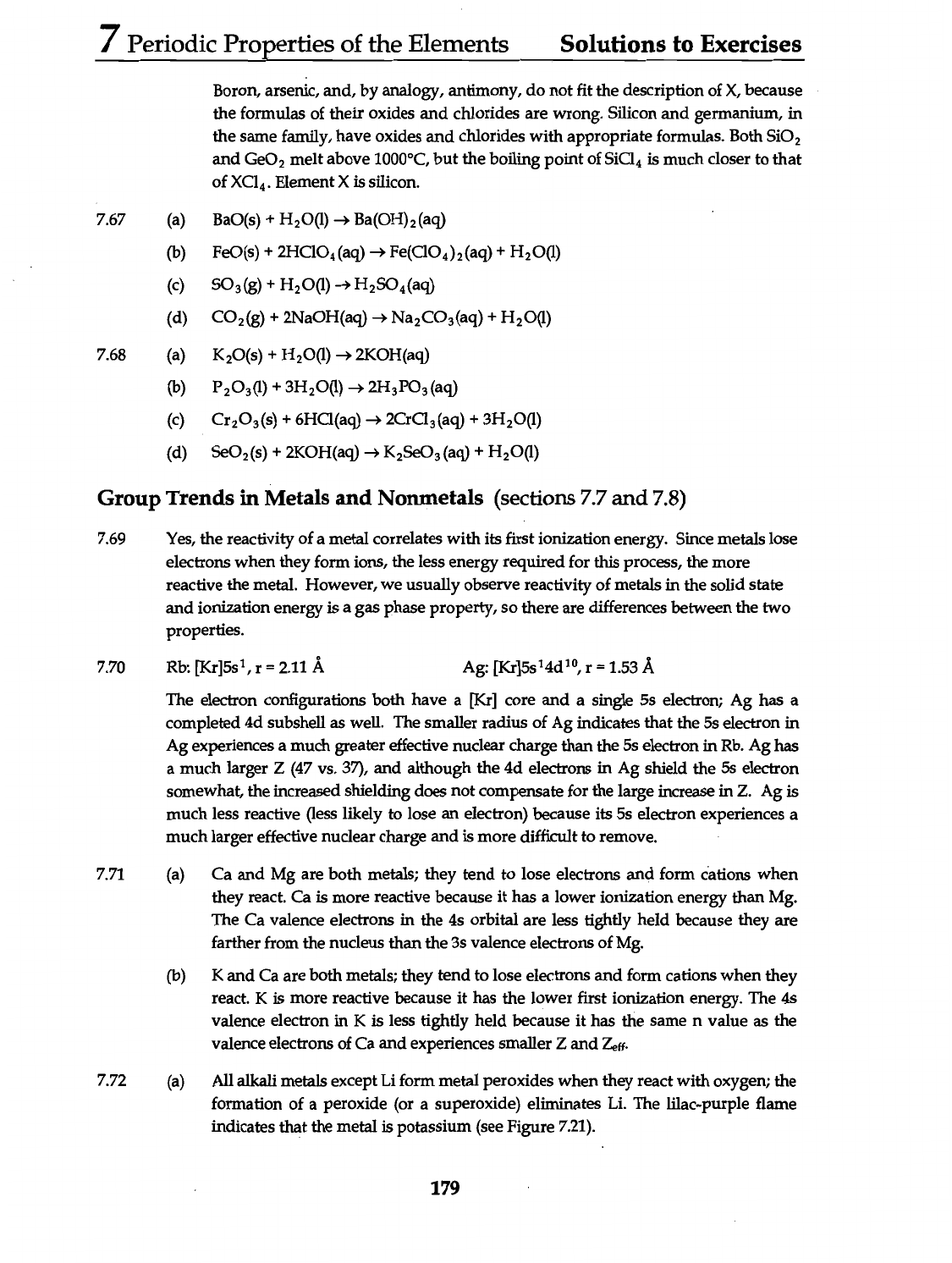7 Periodic Properties of the Elements Solutions to Exercises Boron, arsenic, and, by analogy, antimony, do not fit the description of X, because the formulas of their oxides and chlorides are wrong. Silicon and germanium, in the same family, have oxides and chlorides with appropriate formulas. Both SiO₂ and GeO₂ melt above 1000°C, but the boiling point of SiCl₄ is much closer to that of Element X is silicon. 7.67 (a) BaO(s) + Ba(OH)₂(aq) (b) FeO(s) + + (c) SO₃(g) + (d) CO₂(g) + 2NaOH(aq) + 7.68 (a) K₂O(s) + 2KOH(aq) (b) + 2H₃PO₃(aq) (c) Cr₂O₃(s) + 6HCl(aq) 2CrCl₃(aq) + (d) SeO₂(s) + 2KOH(aq) K₂SeO₃(aq) + Group Trends in Metals and Nonmetals (sections 7.7 and 7.8) 7.69 Yes, the reactivity of a metal correlates with its first ionization energy. Since metals lose electrons when they form ions, the less energy required for this process, the more reactive the metal. However, we usually observe reactivity of metals in the solid state and ionization energy is a gas phase property, so there are differences between the two properties. 7.70 Rb: r = 2.11 Å Ag: r = 1.53 Å The electron configurations both have a [Kr] core and a single 5s electron; Ag has a completed 4d subshell as well. The smaller radius of Ag indicates that the 5s electron in Ag experiences a much greater effective nuclear charge than the 5s electron in Rb. Ag has a much larger Z (47 37), and although the 4d electrons in Ag shield the 5s electron somewhat, the increased shielding does not compensate for the large increase in Z. Ag is much less reactive (less likely to lose an electron) because its 5s electron experiences a much larger effective nuclear charge and is more difficult to remove. 7.71 (a) Ca and Mg are both metals; they tend to lose electrons and form cations when they react. Ca is more reactive because it has a lower ionization energy than Mg. The Ca valence electrons in the 4s orbital are less tightly held because they are farther from the nucleus than the 3s valence electrons of Mg. (b) K and Ca are both metals; they tend to lose electrons and form cations when they react. K is more reactive because it has the lower first ionization energy. The 4s valence electron in K is less tightly held because it has the same n value as the valence electrons of Ca and experiences smaller Z and Zeff. 7.72 (a) All alkali metals except Li form metal peroxides when they react with oxygen; the formation of a peroxide (or a superoxide) eliminates Li. The lilac-purple flame indicates that the metal is potassium (see Figure 7.21). 179