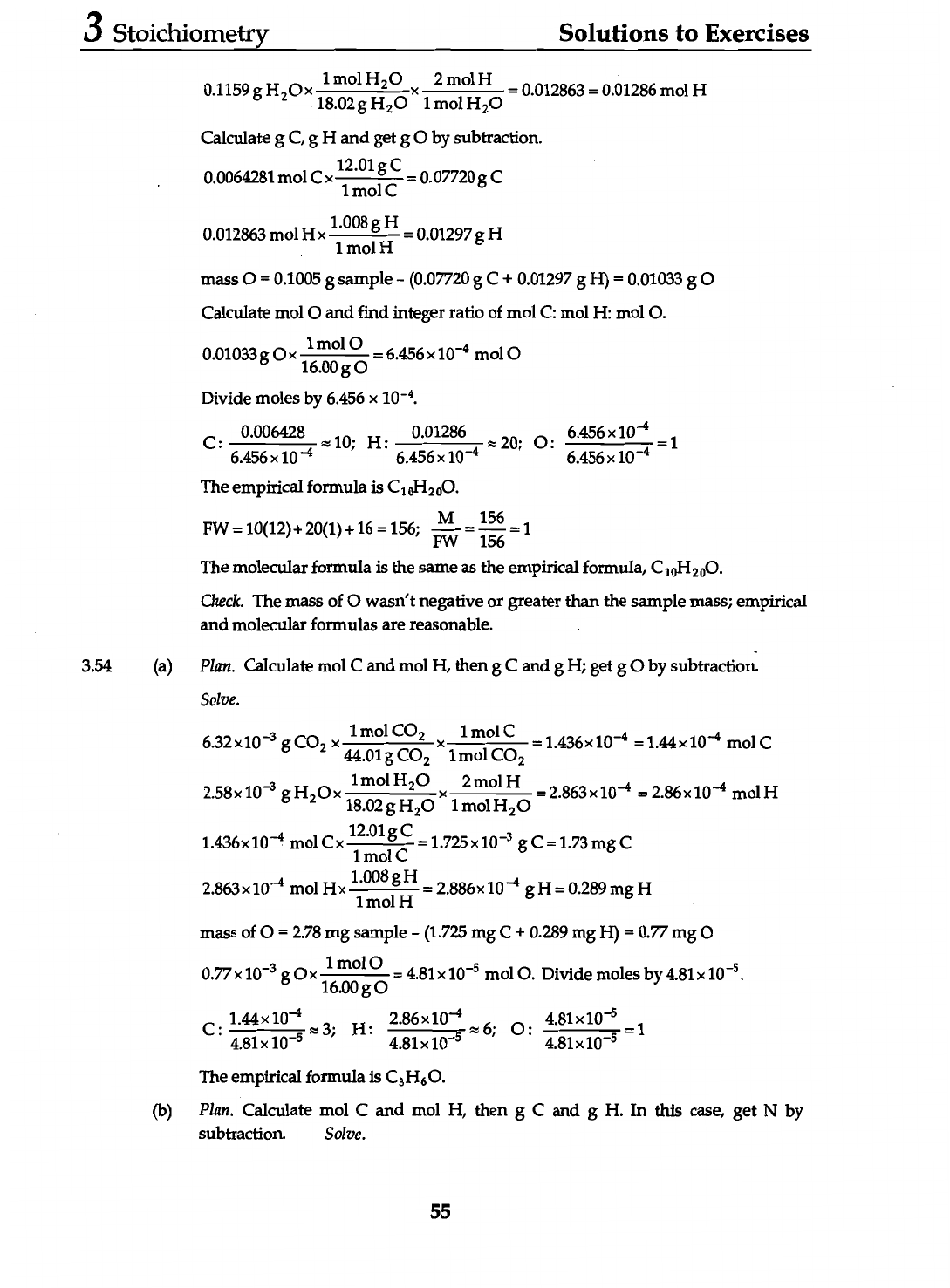 3 Stoichiometry Solutions to Exercises 0.1159 g 18.02 1 mol g H₂O 1 mol 2 mol H = 0.012863 = 0.01286 mol H Calculate g C,g H and get g by subtraction. 0.0064281 mol 1 mol C C 0.012863 mol Hx H mass = 0.1005 g sample (0.07720 g C + 0.01297 g H) = 0.01033 g Calculate mol and find integer ratio of mol C: mol H: mol O. 0.01033 1 mol = X 10⁻⁴ mol Divide moles by 6.456 C: ≈ The empirical formula is C₁₀H₂₀O. FW = FW = 156 The molecular formula is the same as the empirical formula, C₁₀H₂₀O. Check. The mass of wasn't negative or greater than the sample mass; empirical and molecular formulas are reasonable. 3.54 (a) Plan. Calculate mol C and mol H, then g C and g H; get g by subtraction. Solve. 6.32 1 mol 1 mol C = X = 1.44 10⁻⁴ mol C 2.58x 10⁻³ H₂ 1 mol = = X mol H mass of = 2.78 mg sample (1.725 mg C + 0.289 mg H) = 0.77 mg 0.77 = mol O. Divide moles by 4.81x10⁻⁵. C: 1.44x10⁻⁴ H: O: The empirical formula is C₃H₆O. (b) Plan. Calculate mol C and mol H, then g C and g H. In this case, get N by subtraction. Solve. 55