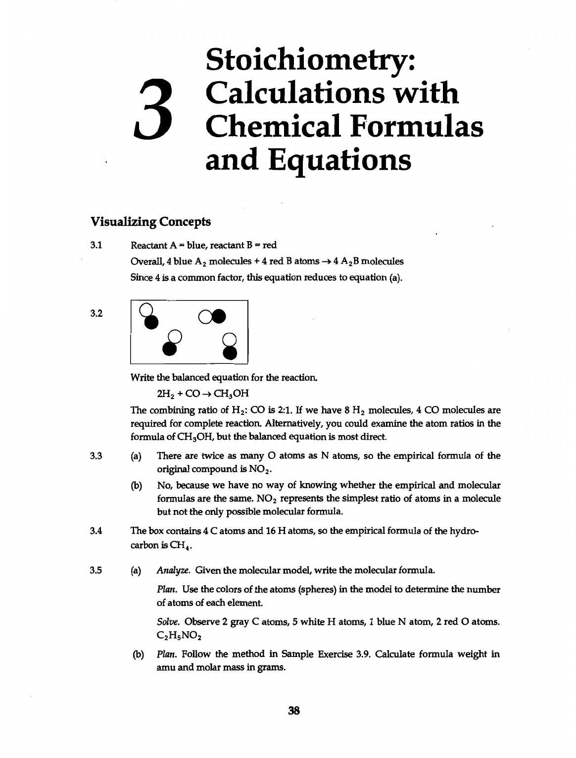 Stoichiometry: 3 Calculations with Chemical Formulas and Equations Visualizing Concepts 3.1 Reactant A = blue, reactant B = red Overall, 4 blue molecules + 4 red atoms 4 molecules Since 4 is a common factor, this equation reduces to equation (a). 3.2 Write the balanced equation for the reaction. 2H₂ + CO The combining ratio of CO is 2:1. If we have 8 molecules, 4 CO molecules are required for complete reaction. Alternatively, you could examine the atom ratios in the formula of but the balanced equation is most direct. 3.3 (a) There are twice as many o atoms as N atoms, so the empirical formula of the original compound is (b) No, because we have no way of knowing whether the empirical and molecular formulas are the same. NO₂ represents the simplest ratio of atoms in a molecule but not the only possible molecular formula. 3.4 The box contains 4 atoms and 16 H atoms, so the empirical formula of the hydro- carbon is 3.5 (a) Analyze. Given the molecular model, write the molecular formula. Plan. Use the colors of the atoms (spheres) in the model to determine the number of atoms of each element. Solve. Observe 2 gray C atoms, 5 white H atoms, 1 blue N atom, 2 red o atoms. C₂H₅NO₂ (b) Plan. Follow the method in Sample Exercise 3.9. Calculate formula weight in amu and molar mass in grams. 38