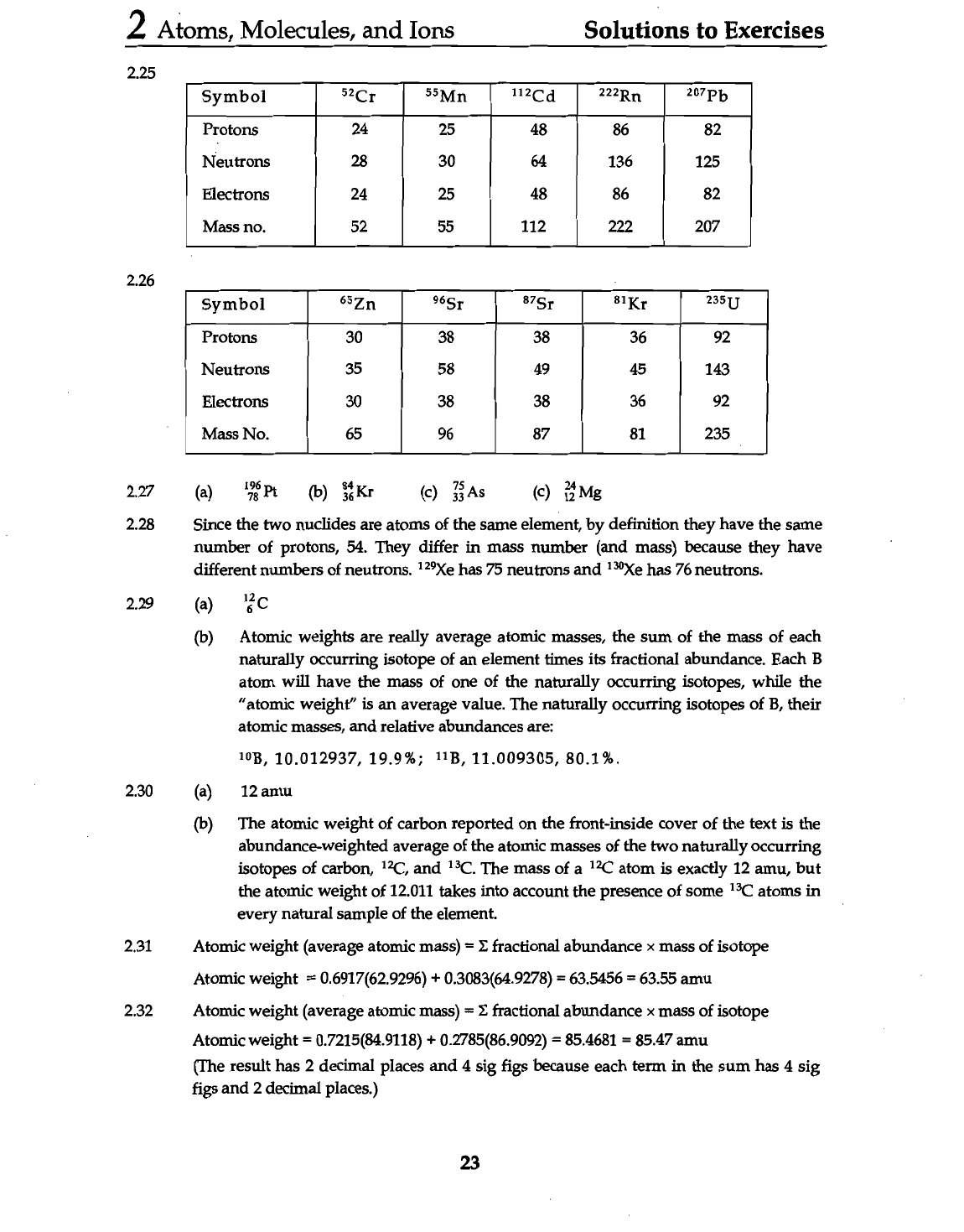 2 Atoms, Molecules, and Ions Solutions to Exercises 2.25 Symbol 52 Cr 55 Mn 112 Cd 207 Pb Protons 24 25 48 86 82 Neutrons 28 30 64 136 125 Electrons 24 25 48 86 82 Mass no. 52 55 112 222 207 2.26 Symbol 65 Zn ⁸¹Kr 235 U Protons 30 38 38 36 92 Neutrons 35 58 49 45 143 Electrons 30 38 38 36 92 Mass No. 65 96 87 81 235 2.27 (a) 196 78 Pt (b) 84 36 Kr (c) 75 33 As (c) 12 24 Mg 2.28 Since the two nuclides are atoms of the same element, by definition they have the same number of protons, 54. They differ in mass number (and mass) because they have different numbers of neutrons. has 75 neutrons and has 76 neutrons. 2.29 (a) 12 6 C (b) Atomic weights are really average atomic masses, the sum of the mass of each naturally occurring isotope of an element times its fractional abundance. Each B atom will have the mass of one of the naturally occurring isotopes, while the "atomic weight" is an average value. The naturally occurring isotopes of B, their atomic masses, and relative abundances are: ¹⁰B, 10.012937, 19.9%; ¹¹B, 11.009305, 80.1%. 2.30 (a) 12 amu (b) The atomic weight of carbon reported on the front-inside cover of the text is the abundance-weighted average of the atomic masses of the two naturally occurring isotopes of carbon, ¹²C, and The mass of a atom is exactly 12 amu, but the atomic weight of 12.011 takes into account the presence of some atoms in every natural sample of the element. 2.31 Atomic weight (average atomic mass) = Σ fractional abundance mass of isotope Atomic weight = 0.6917(62.9296) + 0.3083(64.9278) = 63.5456 = 63.55 amu 2.32 Atomic weight (average atomic mass) = Σ fractional abundance mass of isotope Atomic weight = 0.7215(84.9118) + 0.2785(86.9092) = 85.4681 = 85.47 amu (The result has 2 decimal places and 4 sig figs because each term in the sum has 4 sig figs and 2 decimal places.) 23