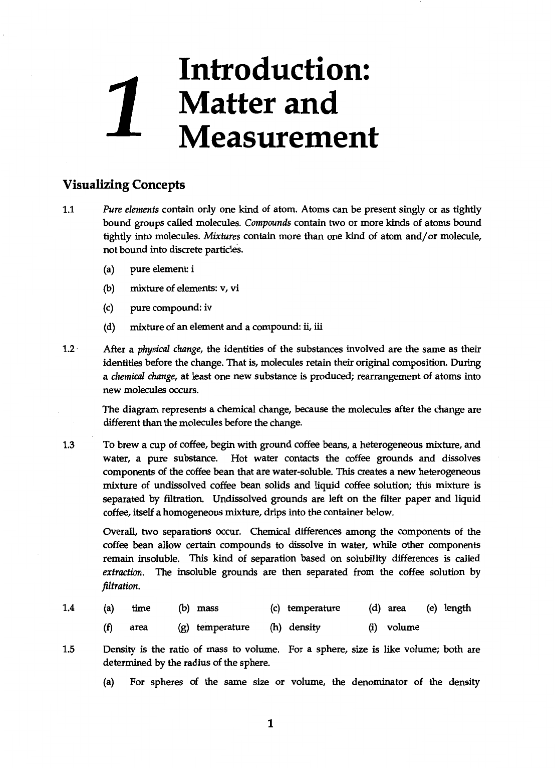 Introduction: 1 Matter and Measurement Visualizing Concepts 1.1 Pure elements contain only one kind of atom. Atoms can be present singly or as tightly bound groups called molecules. Compounds contain two or more kinds of atoms bound tightly into molecules. Mixtures contain more than one kind of atom and/or molecule, not bound into discrete particles. (a) pure element: i (b) mixture of elements: vi (c) pure compound: iv (d) mixture of an element and a compound: ii, iii 1.2 After a physical change, the identities of the substances involved are the same as their identities before the change. That is, molecules retain their original composition. During a chemical change, at least one new substance is produced; rearrangement of atoms into new molecules occurs. The diagram represents a chemical change, because the molecules after the change are different than the molecules before the change. 1.3 To brew a cup of coffee, begin with ground coffee beans, a heterogeneous mixture, and water, a pure substance. Hot water contacts the coffee grounds and dissolves components of the coffee bean that are water-soluble. This creates a new heterogeneous mixture of undissolved coffee bean solids and liquid coffee solution; this mixture is separated by filtration. Undissolved grounds are left on the filter paper and liquid coffee, itself a homogeneous mixture, drips into the container below. Overall, two separations occur. Chemical differences among the components of the coffee bean allow certain compounds to dissolve in water, while other components remain insoluble. This kind of separation based on solubility differences is called extraction. The insoluble grounds are then separated from the coffee solution by filtration. 1.4 (a) time (b) mass (c) temperature (d) area (e) length (f) area (g) temperature (h) density (i) volume 1.5 Density is the ratio of mass to volume. For a sphere, size is like volume; both are determined by the radius of the sphere. (a) For spheres of the same size or volume, the denominator of the density 1