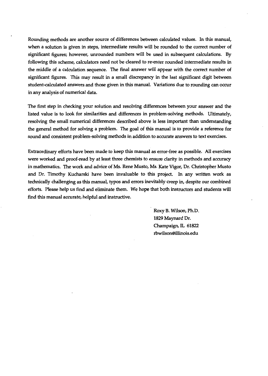 Rounding methods are another source of differences between calculated values. In this manual, when a solution is given in steps, intermediate results will be rounded to the correct number of significant figures; however, unrounded numbers will be used in subsequent calculations. By following this scheme, calculators need not be cleared to re-enter rounded intermediate results in the middle of a calculation sequence. The final answer will appear with the correct number of significant figures. This may result in a small discrepancy in the last significant digit between student-calculated answers and those given in this manual. Variations due to rounding can occur in any analysis of numerical data. The first step in checking your solution and resolving differences between your answer and the listed value is to look for similarities and differences in problem-solving methods. Ultimately, resolving the small numerical differences described above is less important than understanding the general method for solving a problem. The goal of this manual is to provide a reference for sound and consistent problem-solving methods in addition to accurate answers to text exercises. Extraordinary efforts have been made to keep this manual as error-free as possible. All exercises were worked and proof-read by at least three chemists to ensure clarity in methods and accuracy in mathematics. The work and advice of Ms. Rene Musto, Ms. Kate Vigor, Dr. Christopher Musto and Dr. Timothy Kucharski have been invaluable to this project. In any written work as technically challenging as this manual, typos and errors inevitably creep in, despite our combined efforts. Please help us find and eliminate them. We hope that both instructors and students will find this manual accurate, helpful and instructive. Roxy B. Wilson, Ph.D. 1829 Maynard Dr. Champaign, IL 61822
