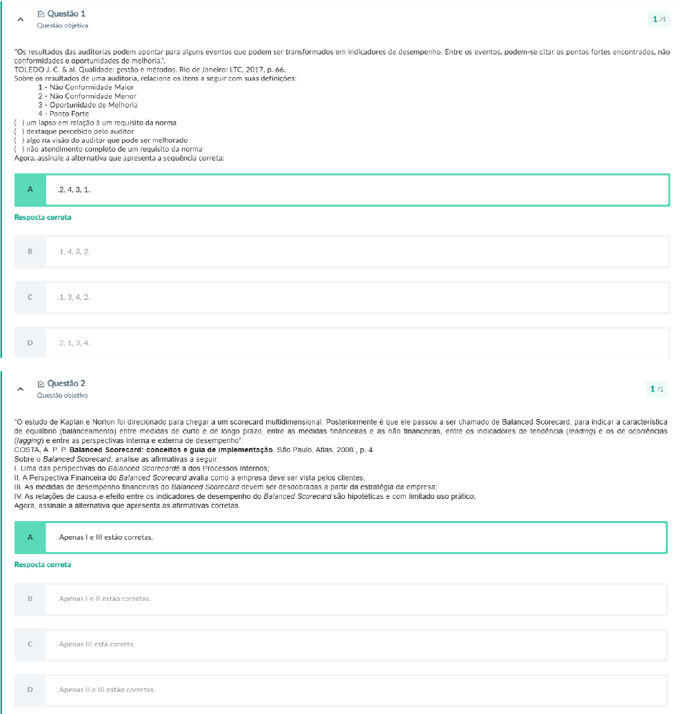 Questão 1 1/1 Questão objetiva "Os resultados das auditorias podem apontar para alguns eventos que podem ser transformados em indicadores de desempenho. Entre os eventos, podem-se citar os pontos fortes encontrados, não conformidades e oportunidades de melhoria.". TOLEDO J. C. & al. Qualidade: gestão e métodos. Rio de Janeiro: LTC, 2017, p. 66. Sobre resultados de uma auditoria, relacione os itens a seguir com suas definições: 1 Não Conformidade Maior 2 Não Conformidade Menor 3 Oportunidade de Melhoria 4 Ponto Forte um lapso em relação à um requisito da norma destaque percebido pelo auditor algo na visão do auditor que pode ser melhorado não atendimento completo de um requisito da norma Agora, assinale a alternativa que apresenta a sequência correta: A Resposta correta D Questão 2 1/1 Questão objetiva "O estudo de Kaplan e Norton foi direcionado para chegar a um scorecard Posteriormente é que ele passou a ser chamado de Balanced Scorecard, para indicar a característica de equilíbrio (balanceamento) entre medidas de curto e de longo prazo, entre as medidas financeiras e as não financeiras, entre os indicadores de tendência (leading) e de ocorrências (lagging) e entre as perspectivas interna e externa de COSTA, A. P. P. Balanced Scorecard: conceitos e guia de São Paulo, Atlas, 2008., p. 4. Sobre Balanced Scorecard, analise as afirmativas a seguir: Uma das perspectivas do Balanced Scorecardé a dos Processos Internos; II. A Perspectiva Financeira do Balanced Scorecard avalia como a empresa deve ser vista pelos clientes; III. As medidas de desempenho financeiras do Balanced Scorecard devem ser desdobradas a partir da estratégia da empresa; IV. As relações de causa-e-efeito entre os indicadores de desempenho do Balanced Scorecard são hipotéticas e com limitado uso prático; Agora, assinale a alternativa que apresenta as afirmativas corretas. A Apenas le III estão corretas. Resposta correta B Apenas e estão corretas. Apenas III está correta. D Apenas e III estão corretas.Questão 3 Questão objetiva "O desenvolvimento das práticas de gestão da qualidade vem sendo fomentado, entre outras formas, pelo estabelecimento, em diversos países, de premiações em gestão da qualidade. Esses prêmios são geridos por órgãos governamentais, como é caso dos EUA, ou por organizações não governamentais, como é 0 caso do Brasil, Japão e União Europeia." CARPINETTI, L.C.R. Gestão da qualidade: conceitos e técnicas. São Paulo: Atlas, 2016. p. 43. primeiro país a estabelecer um prêmio nacional de qualidade foi Japão, em 1951. prêmio da qualidade japonês é chamado de: A Prêmio Deming. Resposta correta Prêmio Juran. Prêmio Ishikawa. D Prêmio Hiroshima. E Prêmio Malcom Baldrige. Questão 4 1/1 Questão objetiva "Alguns modelos de avaliação formais muito conhecidos mundo afora são os que conduzem os prêmios de qualidade em empresas, dos quais se destacam: EFQM Excellence Award, Malcolm Baldrige National Quality Award (MBNQA), Prêmio Deming e 0 Prêmio Nacional da Qualidade (PNQ), sendo este último reconhecimento máximo à excelência de gestão das organizações no CHIROLI, D.M. G. Avaliação de Sistemas de Intersaberes. 2016. p. 221. Sobre prêmios de qualidade, pode-se dizer que: A são baseados nos conceitos da Gestão da Qualidade Total. Resposta correta principais critérios de avaliação são os requisitos das normas ISO 9000. .0 principal atrativo para a participação nacional é a recompensa financeira para os ganhadores. D empresas privadas com fins lucrativos podem participar da premiação. E empresa com menor percentual de defeitos por quantidade de produtos produzidos é premiada.Questão 5 1/1 Questão objetiva "O processo de formulação de uma medida de desempenho é importante e precisa levar em conta alguns aspectos. primeiro deles é a definição do título da medida de desempenho, da fórmula de cálculo do e da frequência da coleta, compilação e disseminação dos Outro passo é a determinação da fonte de dados, bem como a verificação de sua confiabilidade." TOLEDO. J.C. et al. Qualidade: gestão e métodos. Rio de Janeiro: LTC, 2017, p. 353. Uma forma simples e bastante utilizada para desenvolvimento de indicadores de desempenho adequados e de qualidade é SMART, onde cada uma das letras é associada a um aspecto importante para indicador de desempenho. Analise as definições a seguir, atribuindo a letra a do SMART correspondente à cada definição: objetivo deve ser realista e capaz de ser alcançável; deve estar alinhado com objetivos da empresa; ( ) estabelecer exatamente 0 que será medido; ( ) como vai ser medido; ( ) ter um prazo para alcance do objetivo. Agora, assinale a alternativa que indique a sequência correta: A Resposta correta D Questão 6 1/1 Questão objetiva "Os organismos certificadores, as empresas que emitem os certificados, são normalmente credenciados (ou acreditados, do inglês accredited) para a emissão de um certificado ISO 9001 ou ISO 14001. credenciamento (ou a creditação) dos organismos certificadores é feito, no Brasil, pelo INMETRO, Instituto Nacional de Metrologia, Normalização e Qualidade Industrial (ver), uma autarquia federal que tem entre as suas responsabilidades credenciamento de laboratórios, organismos certificadores, inspeção de produtos, entre outras. o INMETRO, que coordena O sistema nacional de certificação no Brasil, é reconhecido internacionalmente como organismo de credenciamento brasileiro, seguindo a tendência internacional atual de apenas um credenciador por país ou economia.". CARPINETTI, L.C.R. Gestão da qualidade: conceitos e técnicas. São Paulo: Atlas, 2016, 69. A auditoria feita por órgãos certificadores é um dos tipos de auditoria possíveis. Demonstre que você conhece os tipos de auditoria relacionando os tipos de auditoria com alguma de suas características: (1) Auditoria Externa (2) Auditoria Interna (3) Auditoria de Sistemas (4) Au