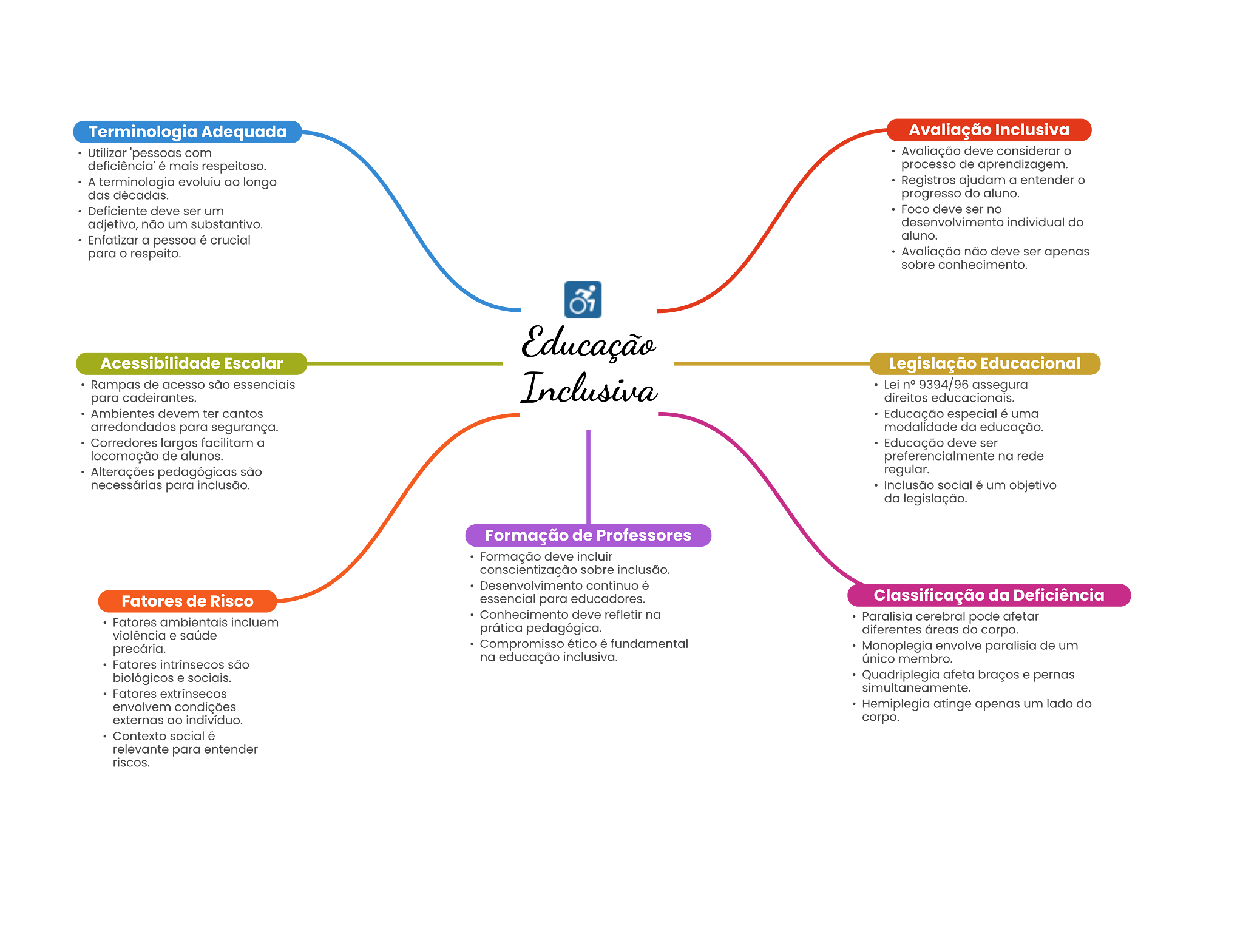 Terminologia Adequada Avaliação Inclusiva Utilizar com Avaliação deve considerar mais processo de aprendizagem. A terminologia evolutu longo Registros ajudam a entender das décadas. progresso do aluno. Deficiente deve ser um Fooo deve ser no adjetivo, não um substantivo. individual do Enfatizar a pessoa crucial aluno. para não deve ser sobre conhecimento. Acessibilidade Escolar Legislação Educacional de acesso Lei assegura para cadeirantes. direitos Ambientes devem ter cantos Educação especial é uma para segurança. modalidade da educação. Corredores largos facilitam a Educação deve ser de alunos. preferencialmente na rede Alterações são regular. para social é um objetivo da Formação de Professores Formação deve sobre é Fatores de Risco essencial para educadores. Classificação da Deficiência Conhecimento deve refletir na Fatores incluem cerebral pode afetar violência saúde pedagógica. diferentes do corpo. ético é fundamental envolve de um Fatores são na educação único membro. biológicos . socials. afeta braços Fatores envolvem condições atinge um lado do externas corpo. social é relevante para entender