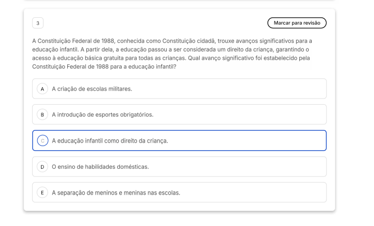 3 Marcar para revisão A Constituição Federal de 1988, conhecida como Constituição trouxe avanços significativos para a educação infantil. A partir dela, a educação passou a ser considerada um direito da criança, garantindo acesso à educação basica gratuita para todas as crianças. Qual avanço significativo foi estabelecido pela Constituição Federal de 1988 para a educação infantil? A A criação de escolas militares. B A introdução de esportes C A educação infantil como direito da criança. D O ensino de habilidades E A separação de meninos e meninas nas escolas.