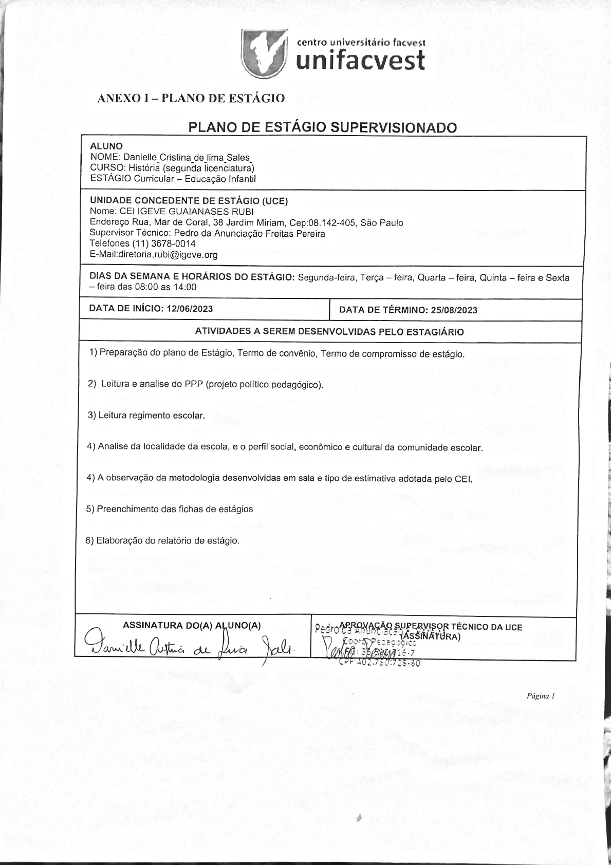 centro universitário facvest unifacvest ANEXO I PLANO DE ESTÁGIO PLANO DE ESTÁGIO SUPERVISIONADO ALUNO NOME: Danielle Cristina de lima Sales CURSO: História (segunda licenciatura) ESTÁGIO Curricular Educação Infantil UNIDADE CONCEDENTE DE ESTÁGIO (UCE) Nome: CEI IGEVE GUAIANASES RUBI Endereço Rua, Mar de Coral, 38 Jardim Miriam, Cep:08.142-405, São Paulo Supervisor Técnico: Pedro da Anunciação Freitas Pereira Telefones (11) 3678-0014 DIAS DA SEMANA E HORÁRIOS DO ESTÁGIO: Segunda-feira, Terça feira, Quarta feira, Quinta - feira e Sexta feira das 08:00 as 14:00 DATA DE INÍCIO: 12/06/2023 DATA DE TÉRMINO: 25/08/2023 ATIVIDADES A SEREM DESENVOLVIDAS PELO ESTAGIÁRIO 1) Preparação do plano de Estágio, Termo de convênio, Termo de compromisso de estágio. 2) Leitura e analise do PPP (projeto político pedagógico). 3) Leitura regimento escolar. 4) Analise da localidade da escola, e o perfil social, econômico e cultural da comunidade escolar. 4) A observação da metodologia desenvolvidas em sala e tipo de estimativa adotada pelo CEI. 5) Preenchimento das fichas de estágios 6) Elaboração do relatório de estágio. ASSINATURA DO(A) ALUNO(A) (ASSINATURA) APROVAÇÃO SUPERVISOR TÉCNICO DA UCE de Página