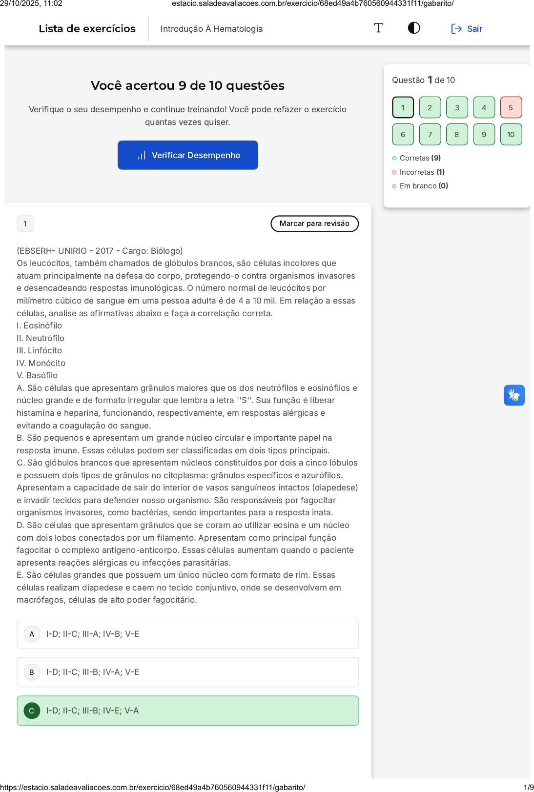 Você acertou 9 de 10 questões Verifique o seu desempenho e continue treinando! Você pode refazer o exercício quantas vezes quiser. Verificar Desempenho A B C 1 Marcar para revisão (EBSERH- UNIRIO - 2017 - Cargo: Biólogo) Os leucócitos, também chamados de glóbulos brancos, são células incolores que atuam principalmente na defesa do corpo, protegendo-o contra organismos invasores e desencadeando respostas imunológicas. O número normal de leucócitos por milímetro cúbico de sangue em uma pessoa adulta é de 4 a 10 mil. Em relação a essas células, analise as afirmativas abaixo e faça a correlação correta. I. Eosinófilo II. Neutrófilo III. Linfócito IV. Monócito V. Basófilo A. São células que apresentam grânulos maiores que os dos neutrófilos e eosinófilos e núcleo grande e de formato irregular que lembra a letra ''S''. Sua função é liberar histamina e heparina, funcionando, respectivamente, em respostas alérgicas e evitando a coagulação do sangue. B. São pequenos e apresentam um grande núcleo circular e importante papel na resposta imune. Essas células podem ser classificadas em dois tipos principais. C. São glóbulos brancos que apresentam núcleos constituídos por dois a cinco lóbulos e possuem dois tipos de grânulos no citoplasma: grânulos específicos e azurófilos. Apresentam a capacidade de sair do interior de vasos sanguíneos intactos (diapedese) e invadir tecidos para defender nosso organismo. São responsáveis por fagocitar organismos invasores, como bactérias, sendo importantes para a resposta inata. D. São células que apresentam grânulos que se coram ao utilizar eosina e um núcleo com dois lobos conectados por um filamento. Apresentam como principal função fagocitar o complexo antígeno-anticorpo. Essas células aumentam quando o paciente apresenta reações alérgicas ou infecções parasitárias. E. São células grandes que possuem um único núcleo com formato de rim. Essas células realizam diapedese e caem no tecido conjuntivo, onde se desenvolvem em macrófagos, células de alto poder fagocitário. I-D; II-C; III-A; IV-B; V-E I-D; II-C; III-B; IV-A; V-E I-D; II-C; III-B; IV-E; V-A Questão 1 de 10 Corretas (9) Incorretas (1) Em branco (0) 1 2 3 4 5 6 7 8 9 10 Lista de exercícios Introdução À Hematologia Sair 29/10/2025, 11:02 estacio.saladeavaliacoes.com.br/exercicio/68ed49a4b760560944331f11/gabarito/ https://estacio.saladeavaliacoes.com.br/exercicio/68ed49a4b760560944331f11/gabarito/ 1/9 D E I-A; II-D; III-E; IV-B; V-C I-A; II-C; III-E; IV-B; V-D Resposta correta Parabéns, você selecionou a alternativa correta. Confira o gabarito comentado! Gabarito Comentado A correlação correta entre os tipos de leucócitos e suas características é a seguinte: I-D, o eosinófilo é uma célula que apresenta grânulos que se coram ao utilizar eosina e um núcleo com dois lobos conectados por um filamento, com a principal função de fagocitar o complexo antígeno-anticorpo; II-C, o neutrófilo é um glóbulo branco que apresenta núcleos constituídos por dois a cinco lóbulos e possui dois tipos de grânulos no citoplasma, sendo responsável por fagocitar organismos invasores; III-B, o linfócito é pequeno e apresenta um grande núcleo circular, desempenhando um importante papel na resposta imune; IV-E, o monócito é uma célula grande que possui um único núcleo com formato de rim, realiza diapedese e se desenvolve em macrófagos no tecido conjuntivo; V-A, o basófilo é uma célula que apresenta grânulos maiores que os dos neutrófilos e eosinófilos e núcleo grande e de formato irregular que lembra a letra ''S'', liberando histamina e heparina em respostas alérgicas e evitando a coagulação do sangue. 2 Marcar para revisão (Adaptado de IDECAN -Farmacêutico -Bioquímico -Pref. Simonésia/MG -2016) Pela análise quantitativa dos eritrócitos de três situações de resultado de hemograma de pacientes mulheres adultas, comparando seus resultados com os dados dos valores de referência, analise os dados laboratoriais, associe adequadamente a coluna da direita de acordo com os dados laboratoriais dos pacientes da coluna da esquerda. 1. Paciente A 2. Paciente B 3. Paciente C 29/10/2025, 11:02 estacio.saladeavaliacoes.com.br/exercicio/68ed49a4b760560944331f11/gabarito/ https://estacio.saladeavaliacoes.com.br/exercicio/68ed49a4b760560944331f11/gabarito/ 2/9 A B C D E A B C D E ( ) Anemia macrocítica ( ) Anemia microcítica e hipocrômica ( ) Anemia normocítica normocrômica A sequência está correta em: 3, 1, 2 2, 3, 1 1, 3, 2 3, 2, 1 1, 2, 3 Resposta correta Parabéns, você selecionou a alternativa correta. Confira o gabarito comentado! Gabarito Comentado A resposta certa é: 3, 1, 2 3 Marcar para revisão (Adaptado de UFPR - Farmacêutico Bioquímico - 2008) A qualidade de uma análise laboratorial inicia com a coleta do material biológico e sua correta preservação até o momento da análise. Assinale a alternativa que apresenta, respectivamente, a amostra, o meio correto de preservação/aditivo da amostra e a análise a que se destina. Sangue total - Heparina - Glicemia Soro - Gel de separação - Coagulação Plasma - Citrato de sódio - Coagulação Soro - Gel de separação - Hemograma Sangue total - Gel de separação - Hemograma 29/10/2025, 11:02 estacio.saladeavaliacoes.com.br/exercicio/68ed49a4b760560944331f11/gabarito/ https://estacio.saladeavaliacoes.com.br/exercicio/68ed49a4b760560944331f11/gabarito/ 3/9 A B C D E Resposta correta Parabéns, você selecionou a alternativa correta. Confira o gabarito comentado! Gabarito Comentado A alternativa correta é "Plasma - Citrato de sódio - Coagulação". Isso porque o plasma é a parte líquida do sangue que contém os fatores de coagulação. O citrato de sódio é um anticoagulante que impede a coagulação do sangue, preservando os fatores de coagulação para análise. Portanto, para análises de coagulação, a amostra correta é o plasma e o aditivo 