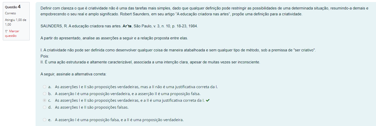 Questão 4 Definir com clareza que é criatividade não é uma das tarefas mais simples, dado que qualquer definição pode restringir as possibilidades de uma determinada situação, resumindo-a demais e Correto empobrecendo seu real e amplo significado. Robert Saunders, em seu artigo educação criadora nas artes", propõe uma definição para a criatividade. Atingiu 1,00 de 1,00 SAUNDERS, R. A educação criadora nas artes. Ar'te, São Paulo, V. 3, n. 10, 18-23, 1984. Marcar questão A partir do apresentado, analise as asserções a seguir e a relação proposta entre elas. I. A criatividade não pode ser definida como desenvolver qualquer coisa de maneira atabalhoada e sem qualquer tipo de método, sob a premissa de "ser criativo". Pois: II. É uma ação estruturada e altamente caracterizável, associada a uma intenção clara, apesar de muitas vezes ser inconsciente. A seguir, assinale a alternativa correta: a. As asserções I e II são proposições verdadeiras, mas a não é uma justificativa correta da I. b. A asserção lé uma proposição verdadeira, e a asserção II é uma proposição falsa. C. As asserções I e II são proposições verdadeiras, e a é uma justificativa correta da I. d. As asserções I e II são proposições falsas. e. A asserção lé uma proposição falsa, e a é uma proposição verdadeira.