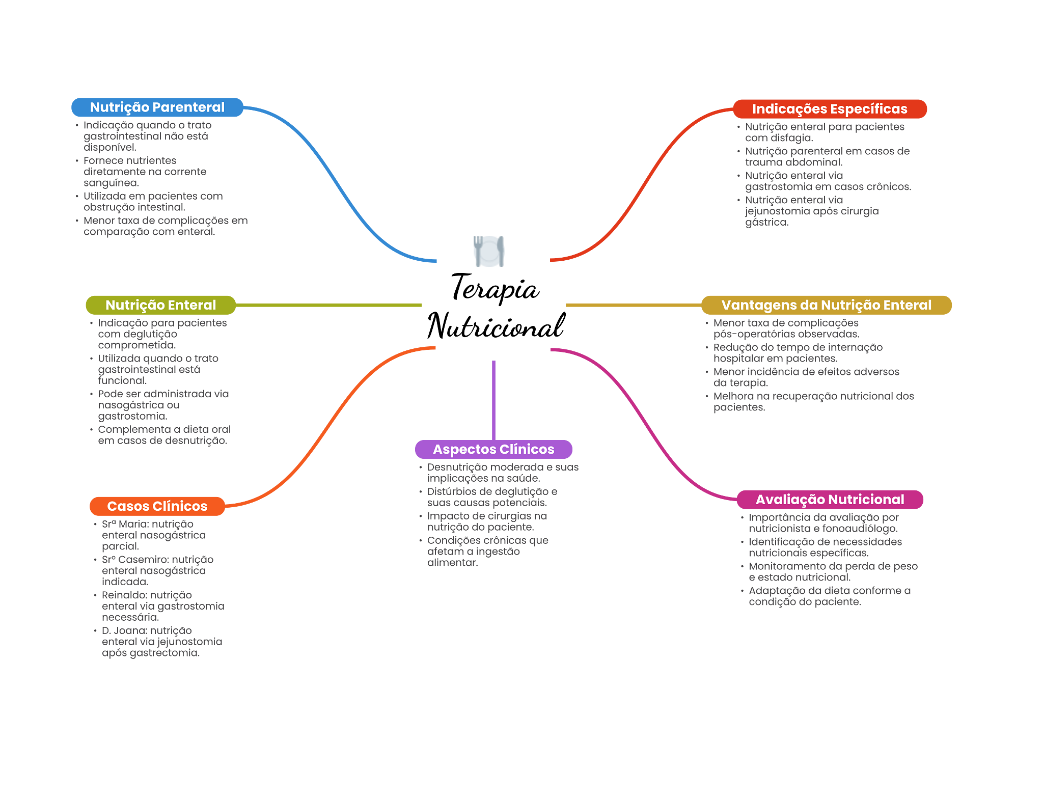Nutrição Parenteral Indicações Específicas indicação quando trato Nutrição enteral para pacientes não está com disponível. Nutrição parenteral em de Fornece nutrientes trauma abdominal. diretamente na corrente Nutrição enteral via gastrostomia em crônicos. Utilizada em pacientes com Nutrição enteral via obstrução jejunostomia cirurgia Menor de complicações em comparação com Nutrição Enteral Vantagens da Nutrição Enteral para pacientes Menor de complicações com deglutição observadas. comprometida. Redução do tempo de internação quando trato hospitalar em pacientes. gastrointeetinal está Menor de efeitos adversos funcional. da Pode ser administrada Melhora na recuperação nutricional dos ou pacientes. Complementa a dieta oral em casos de Aspectos Clínicos Desnutrição moderada na de deglutição Casos Clínicos causas potenciala. Avaliação Nutricional de cirurgias na Maria: nutrição da avaliação por nutrição do enteral nutricionista parcial. Condições que de necessidades afetam a Casemiro: nutrição nutricionals alimentar. enteral Monitoramento da perda de peso . estado nutricional. nutrição Adaptação da conforme a enteral via gastrostomia condição do pacients. D. nutrição enteral via jejunostomia após