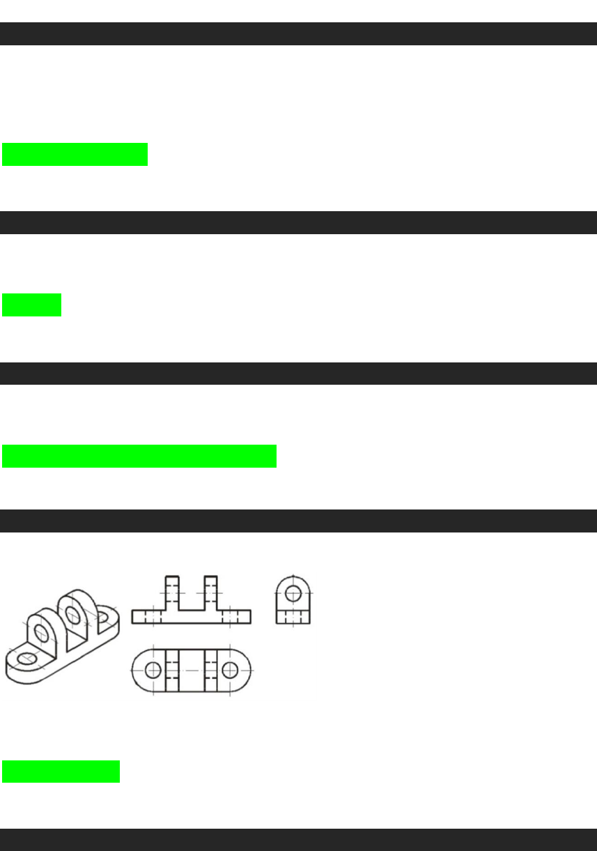 ATIVIDADE DE AUTO APRENDIZADO 01 DESENHO MECÂNICO Pergunta 1 0/0 O método de representação pelo sistema de vistas ortogonais fundamenta-se no método descritivo idealizado por Gaspard Monge. A operação básica deste método é a projeção: Correta: Cilíndrica ortogonal. Resposta correta Pergunta 2 0/0 Que tipo de superfície plana, quando projetada, apresenta uma área menor? Correta: Oblíqua. Resposta correta Pergunta 3 0/0 A teoria da caixa de vidro é usada para descrever: Correta: A posição relativa das múltiplas vistas. Resposta correta Pergunta 4 0/0 O objeto representado na figura está representado em qual diedro? Correta: Primeiro diedro. Resposta correta Pergunta 5 0/0 Na figura a seguir estão projetadas as vistas lateral esquerda e superior de um objeto. Baseado na necessidade de existir correspondência entre as vistas, qual das opções representa a vista frontal deste objeto? Resposta correta: Pergunta 6 0/0 De acordo com o desenho técnico, de acordo com a NBR 10067, as figuras mostram uma perspectiva técnica de um objeto e três de suas vistas ortográficas. Analisando essas figuras, conclui-se que: Correta: Foi desenhada, além das vistas ortogonais, uma perspectiva isométrica que permite uma boa visualização do objeto. Resposta correta. Pergunta 7 0/0 Na figura a seguir estão projetadas as vistas frontal e lateral esquerda de um objeto. Baseado na necessidade de existir correspondência entre as vistas, qual das opções representa a vista superior deste objeto? Resposta Correta. Pergunta 8 0/0 Assinale a opção que representa a vista do observador marcado na figura: Resposta correta. Pergunta 9 0/0 Dadas as afirmações abaixo, analise-as quanto a verdadeiras ou falsas, e escolha a resposta correta. 1. Nos desenhos de múltiplas projeções é sempre necessário usar pelo menos três vistas principais para definir perfeitamente um objeto. 2. Nos desenhos de múltiplas projeções, a vista esquerda sempre deve ser usada, mesmo que possua mais linhas ocultas que a vista direita. 3. Em um desenho representado com três vistas uma superfície plana inclinada sempre aparece como uma linha em duas das vistas principais. 4. Na escolha da vista frontal, deve-se sempre pensar naquela projeção que apresenta maiores detalhes e, preferencialmente, na posição de utilização. F, F, F e V. Resposta correta Pergunta 10 0/0 As vistas ortogonais são uma das formas de representar um objeto através de um desenho, sendo representado do jeito que ele realmente é. Sobre as vistas também podemos afirmar: As principais vistas ortogonais são frontal, superior e lateral direita. Resposta correta