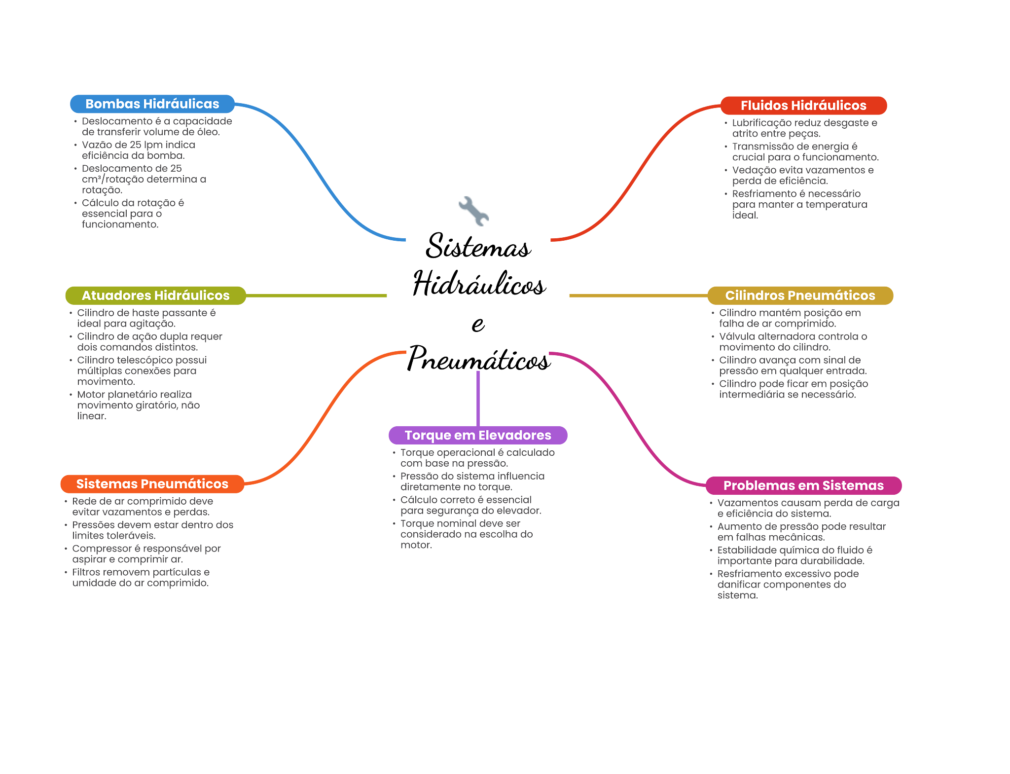 Bombas Hidráulicas Fluidos Hidráulicos é a capacidade reduz de transferir volume de atrito entre Vazão de 25 de energia eficiência da crucial para de Vedação evita determina a perda de eficiência. rotação. Cálculo da rotação é para manter a temperatura para ideal. funcionamento. Atuadores Hidráulicos Cilindros Pneumáticos Clindro de haste passante é mantém posição em ideal para agitação. falha de or comprimido. de ação dupla requer Válvula alternadora controla dois comandos distintos. movimento do possul avança com de para em qualquer entrada. movimento. Cilindro pode em posição Motor realiza se necessário. movimento giratório, não linear. Torque em Elevadores Torque calculado com base na pressão. do sistema Sistemas Pneumáticos diretamente no torque. Problemas em Sistemas Rede de or comprimido deve Cálculo correto é essencial perda de carga evitar vazamentos . perdas. para segurança do elevador. eficiência do Pressões devem estar dentro dos Torque nominal deve Aumento de pressão pode resultar considerado na escolha do em Compressor responsável por motor. Estabilidade química do fluido é aspirar . comprimir importante para Filtros removem excessivo pode umidade do comprimido. danificar componentes do