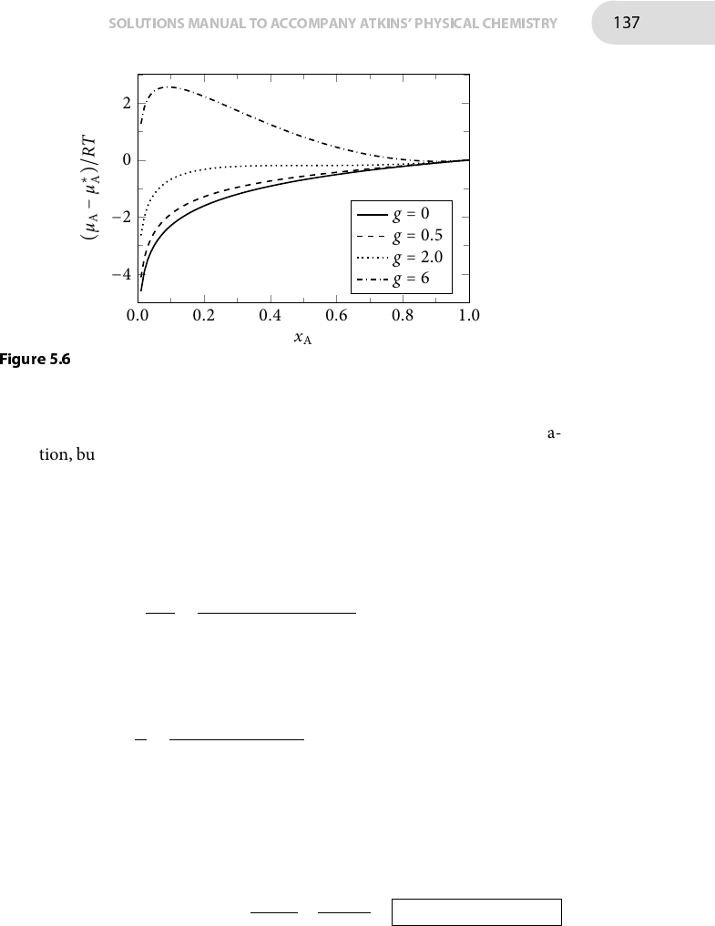 SOLUTIONSMANUAL TO ACCOMPANY ATKINS' PHYSICAL CHEMISTRY 137 0.0 0.2 0.4 0.6 0.8 1.0 −4 −2 0 2 xA (µ A − µ∗ A )/ RT g = 0 g = 0.5 g = 2.0 g = 6.0 Figure 5.6 where R′ = R/g.�e �nal equation is of the form of the van ’t Ho� equa- tion, but with a modi�ed measure of concentration, c/M, and a modi�ed gas constant, R′. �is equation is rearranged to give an expression for R′, and the units of this quantity are then found by inserting the units of the quantities involved R′ = PM cT = (g cm−2) × (g mol−1) (g cm−3) × (K) = g cm K−1 mol−1 �e numerical value of R′ is found from its de�nition R′ = R g = 8.3145 JK −1mol−1 9.8067 ms−2 = 0.84784 kg m K−1 mol−1 �e units of R′ are found by using 1 J = 1 kgm2 s−2. �e �nal step is to convert the numerical value of R′ from (kg m K−1 mol−1) to the required (g cm K−1 mol−1) (0.84784 kg m K−1 mol−1)× 1000 g 1 kg × 100 cm 1 m = 84784 g cm K−1 mol−1 (b) From now on the van ’t Ho� equation is writtenΠ = (c/M)RT where the units ofΠ and c are as described in (a), andR is 84784 g cm K−1 mol−1. As described in Section 5B.2(e) on page 162, if it is assumed that the osmotic pressure is given by a virial-type equation [5B.18–163] where just the �rst two terms are retained, a plot of Π/c against c should give a straight line with intercept RT/M.�e data are plotted in Fig. 5.7.