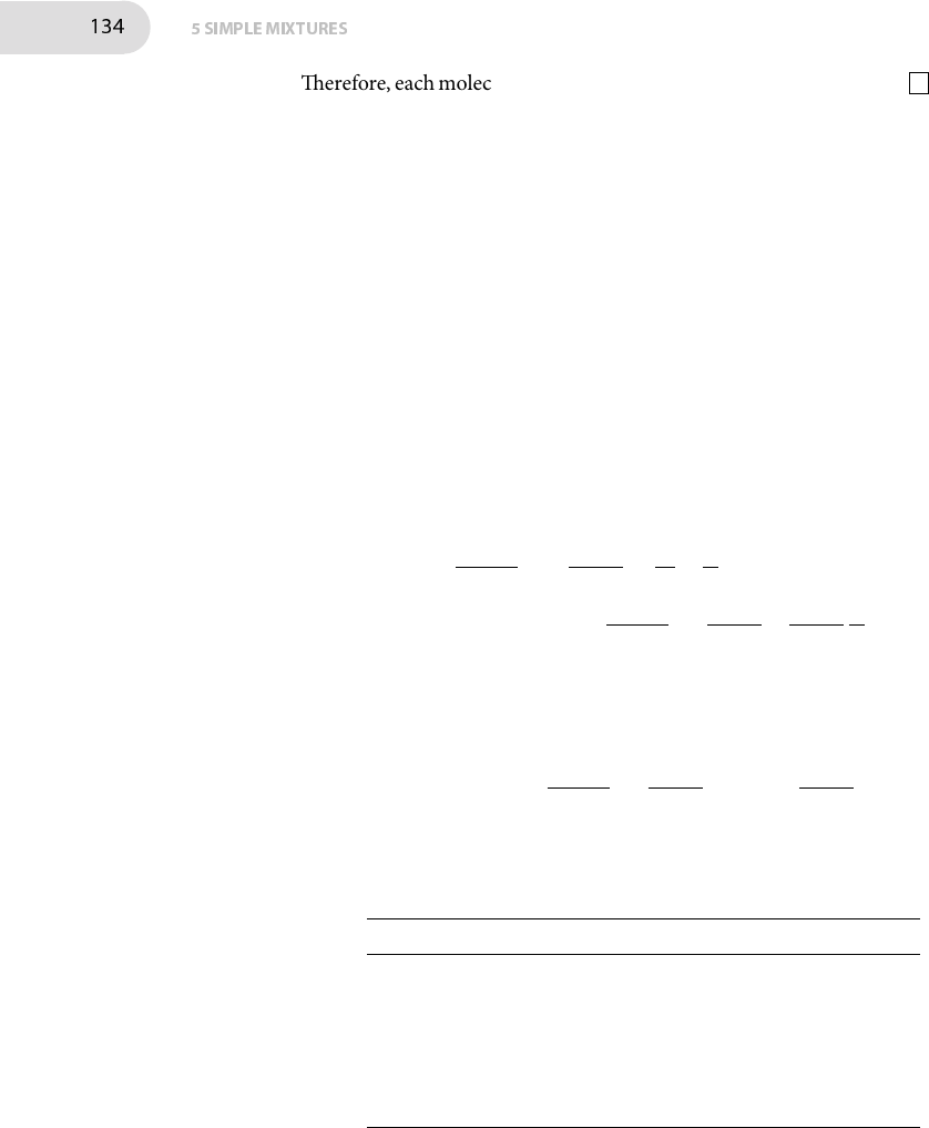 134 5 SIMPLEMIXTURES �erefore, eachmolecule of�(NO3)4 appears to dissociate into about 4 species in solution. P5B.4 �e ideal solubility of solute B at temperature T is given by [5B.14–162], ln xB = (∆fusH/R)(1/Tf − 1/T), where ∆fusH is the enthalpy of fusion of the solute, and Tf is the freezing point of the pure solute. �e �rst task is to relate the quoted solubility to the mole fraction of the solute. �e data gives the solubility in g of solute per 100 g of solvent: let this quantity be S and, for convenience, let the mass of solvent bemA.�e amount in moles of solute is nB = S/MB, where MB is the molar mass of the solute in gmol−1. Likewise, the amount in moles of solvent is nA = mA/MA, where MA is the molar mass of the solvent in gmol−1. For the data given it is invariably the case that nA ≫ nB, so the mole fraction of B is well-approximated as xB = nB/nA = SMA/mAMB. With this the relationship for the ideal solubility is developed as ln( SMA mAMB ) = (∆fusH R )( 1 Tf − 1 T ) ln S = − ln( MA mAMB ) + ∆fusH RTf − ∆fusH R 1 T �e proposed relationship for the solubility, S = S0eτ/T , becomes, on taking logarithms, ln S = ln S0 + τ/T . �is is compared with the last line to identify the terms as ln S0 = − ln( MA mAMB ) + ∆fusH RTf τ = −∆fusH R To test how the data �t to the proposed relationship a plot of ln S against 1/T is made; such a plots is shown in Fig. 5.5. θ/○C S/(g (100 g solv)−1) T/K (103/T)/(K−1) ln S 0 36.4 273 3.66 3.59 20 34.9 293 3.41 3.55 40 33.7 313 3.19 3.52 60 32.7 333 3.00 3.49 80 31.7 353 2.83 3.46 �e data �t to quite a good straight line, the equation of which is ln S/(g (100 g solv)−1) = 0.165 × (103/T)/(K−1) + 2.99 �e immediate problem is that the parameter τ is expected to be negative (be- cause τ = −∆fusH/R, and ∆fusH is positive), but the graph has a positive slope. �e data do not, even at the simplest level, conform to the predictions of the ideal solubility equation.