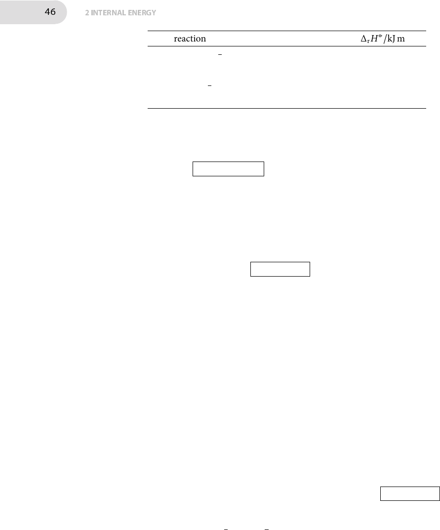 46 2 INTERNAL ENERGY reaction ∆rH−○/kJmol−1 (1) C2H2(g) + 52 O2(g)ÐÐ→ 2CO2(g) + H2O(l) −1300 (2) C2H4(g) + 3O2(g)ÐÐ→ 2CO2(g) + 2H2O(l) −1411 (3) H2(g) + 12 O2(g)ÐÐ→ H2O(l) −285.83 (4) C2H2(g) + H2(g)ÐÐ→ C2H4(g) ∆rH−○(4) ∆rH−○(4) = ∆rH−○(1) + ∆rH−○(3) − ∆rH−○(2) = (−1300 kJmol−1) + (−285.83 kJmol−1) − (−1411 kJmol−1) = −174.83 kJmol−1 �e relationship between ∆rH and ∆rU is given by [2B.3–48], ∆rH = ∆rU + ∆ngRT where ∆ng is the change in the amount of gasmolecules in the reaction. For this reaction ∆ng = 1 mol − 1 mol − 1 mol = −1 mol ∆rU−○(298 K) = ∆rH−○(298 K) − ∆ngRT = (−174.83 × 103 Jmol−1) − (−1.0 mol) × (8.3145 JK−1mol−1) × (298 K) = −172 kJmol−1 �e di�erence of the molar heat capacities of products and reactants is cal- culated using [2C.7b–55] and the corresponding heat capacity data from the Resource section ∆rC −○ p = ∑ products νC−○p ,m − ∑ reactants νC−○p ,m = C−○p ,m(C2H4 , g) − C−○p ,m(C2H2 , g) − C−○p ,m(H2 , g) = (43.56 JK−1mol−1) − (43.93 JK−1mol−1) − (28.824 JK−1mol−1) = −29.1... J K−1mol−1 It is assumed that all heat capacities are constant over the temperature range of interest, therefore the integrated form of Kirchho� ’s Law is applicable, [2C.7d– 56] ∆rH−○(427 K) = ∆rH−○(298 K) + ∆T∆rC−○p = (−174.83 × 103 Jmol−1) + (427 K − 298 K) × (−29.1... J K−1mol−1) = −179 kJmol−1 E2C.8(b) �e reaction equation 12N2(g) + 3 2H2(g) ÐÐ→ NH3(g) represents the forma- tion ofNH3(g) from its elements in their reference states, therefore ∆rH−○(298K) = ∆fH−○(NH3 , g) = −46.11 kJmol−1.�e variation of standard reaction enthalpy with temperature is given by Kirchho� ’s Law, [2C.7a–55] ∆rH−○(T2) = ∆rH−○(T1) + ∫ T2 T1 ∆rC −○ p dT