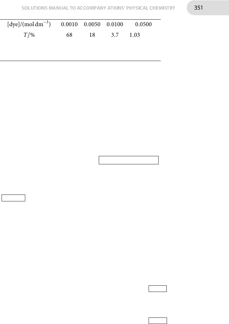 SOLUTIONSMANUAL TO ACCOMPANY ATKINS' PHYSICAL CHEMISTRY 351 [dye]/(mol dm−3) 0.0010 0.0050 0.0100 0.0500 T/% 68 18 3.7 1.03 × 10−5 T 0.68 0.18 0.037 1.03 × 10−7 ε/(dm3mol−1 cm−1) 670 596 573 559 �e molar absorption coe�cient is clearly not independent of the concentra- tion; this may indicate that the dye molecules are interacting with one another at higher concentrations. E11A.6(b) �e transmittance T is the ratio I/I0, hence the Beer–Lambert law [11A.8–421] can be written T = I/I0 = 10−ε[J]L . It follows that logT = −ε[J]L and hence ε = −(logT)/[J]L. With the given data, T = 0.29 and L = 0.500 cm, the molar absorption coe�cient is calculated as ε = −(log 0.29)/[(18.5×10−3moldm−3)×(0.500 cm)] = 58.1... dm3mol−1 cm−1 �e molar absorption coe�cient is therefore ε = 58 dm3mol−1 cm−1 . For a path length of 0.250 cm the transmittance is T = 10−(58.1... dm 3 mol−1 cm−1)×(0.250 cm)×(18.5×10−3 mol dm−3) = 0.538... Hence T = 54% . Note the conversion of the concentration to mol dm−3. E11A.7(b) �e ratio of the incident to the transmitted intensities of light a�er passing through a sample of length L, molar concentration [J], and molar absorption coe�cient ε is given by [11A.8–421], T = I/I0 = 10−ε[J]L . It follows that logT = −ε[J]L, which rearranges to give L = −(logT)/ε[J]. �e missing piece of information (in fact misplaced to Exercise E11A.7(a)) is that the concentration of the absorber is 10 mmol dm−3. �e light intensity is reduced to half when T = 0.5, hence the thickness of the sample is calculated as L = −(log 0.5)/[(30 dm3mol−1 cm−1) × (0.010 mol dm−3)] = 1.0 cm �e light intensity is reduced to one tenth when T = 0.1 L = −(log 0.1)/[(30 dm3mol−1 cm−1) × (0.010 mol dm−3)] = 3.3 cm E11A.8(b) �e integrated absorption coe�cient is given by [11A.10–423],A = ∫band ε(ν̃)dν̃, where the integration is over the band, and ν̃ = λ−1 is the wavenumber. �e band extends from 167 nm, corresponding to ν̃ = (167×10−7 cm)−1 = 5.98...× 104 cm−1, peaking at 200 nm, ν̃ = (200 × 10−7 cm)−1 = 5.00 × 104 cm−1, and ending at 250 nm, ν̃ = (250 × 10−7 cm)−1 = 4.00 × 104 cm−1.