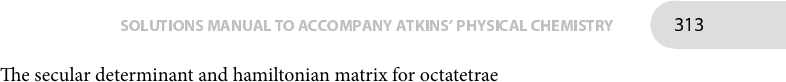 SOLUTIONSMANUAL TO ACCOMPANY ATKINS' PHYSICAL CHEMISTRY 313 �e secular determinant and hamiltonian matrix for octatetraene are RRRRRRRRRRRRRRRRRRRRRRRRRRRRRRRRRRRRR α − E β 0 0 0 0 0 0 β α − E β 0 0 0 0 0 0 β α − E β 0 0 0 0 0 0 β α − E β 0 0 0 0 0 0 β α − E β 0 0 0 0 0 0 β α − E β 0 0 0 0 0 0 β α − E β 0 0 0 0 0 0 β α − E RRRRRRRRRRRRRRRRRRRRRRRRRRRRRRRRRRRRR H = α1+β ⎛ ⎜⎜⎜⎜⎜⎜⎜⎜⎜⎜⎜⎜ ⎝ 0 1 0 0 0 0 0 0 1 0 1 0 0 0 0 0 0 1 0 1 0 0 0 0 0 0 1 0 1 0 0 0 0 0 0 1 0 1 0 0 0 0 0 0 1 0 1 0 0 0 0 0 0 1 0 1 0 0 0 0 0 0 1 0 ⎞ ⎟⎟⎟⎟⎟⎟⎟⎟⎟⎟⎟⎟ ⎠ �is is diagonalized by the matrix ⎛ ⎜⎜⎜⎜⎜⎜⎜⎜⎜⎜⎜⎜ ⎝ 0.161 0.303 0.408 0.464 0.464 0.408 0.303 0.161 0.303 0.464 0.408 0.161 −0.161 −0.408 −0.464 −0.303 0.408 0.408 0 −0.408 −0.408 0 0.408 0.408 0.464 −0.161 −0.408 −0.303 0.303 0.408 −0.161 −0.464 0.464 −0.161 −0.408 0.303 0.303 −0.408 −0.161 0.464 0.408 −0.408 0 0.408 −0.408 0 0.408 −0.408 0.303 −0.464 0.408 −0.161 −0.161 0.408 −0.464 0.303 0.161 −0.303 0.408 −0.464 0.464 −0.408 0.303 −0.161 ⎞ ⎟⎟⎟⎟⎟⎟⎟⎟⎟⎟⎟⎟ ⎠ �e diagonal elements are ±1.88, ±1.53, ±1.00, and ±0.347, implying that the energies are α ± 1.88 β, α ± 1.53 β, α ± 1.00 β, and α ± 0.347 β. Each columnof the diagonalizationmatrices gives the coe�cients of the atomic orbitals for the corresponding molecular orbitals. For each molecule, the �rst column gives the coe�cients for the lowest energy π molecular orbital. All of these coe�cients have positive signs, therefore the lowest energy π molecular orbital has no nodes and the lowest energy π molecular orbital is delocalized over all carbon atoms in the chain. On going to successive columns to the right the energy of the molecular orbital increases and the number of sign changes within a column increases. �ese sign changes correspond to nodes in the molecular molecular orbitals. P9E.6 �e bonding and antibonding e�ects of theHOMOand LUMOhave to be con- sidered to predict the changes in bond strength that accompany the transition. �e ground state electron con�guration of butadiene is 1π2 2π2, therefore the HOMO of butadiene is the 2π molecular orbital. Looking at Fig. 9E.2 on page 376, this molecular orbital is bonding between carbon atoms C1 and C2 and likewise between C3 and C4, but antibonding between C2 and C3.�e LUMO of butadiene is the 3πmolecular orbital, which is antibonding between carbon atoms C1 and C2 and likewise between C3 and C4, but bonding between C2 and C3. �erefore promotion of an electron from the HOMO to the LUMO weakens the bonding between C1 and C2 and likewise between C3 and C4, but strengthens the bonding between C2 and C3. �e HOMO of benzene is the e1g orbital and the LUMO is the e2u orbital. One of the e1g orbitals, the one on the right in Fig. 9E.4 on page 377, is bonding between two pairs of neighbouring carbon atoms, and nonbonding between all