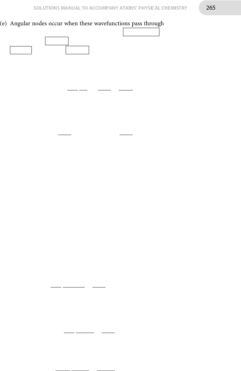 SOLUTIONSMANUAL TO ACCOMPANY ATKINS' PHYSICAL CHEMISTRY 265 (e) Angular nodes occur when these wavefunctions pass through zero, and so for ψa occur when cos ϕ = 0, that is when ϕ = π/2, 3π/2 : this corre- sponds to the yz plane . For ψb they occur when sin ϕ = 0, that is when ϕ = 0, π , which is the xz plane . P7F.10 �e Hamiltonian for a hydrogen atom is Ĥ = − ħ2 2mr ∂2 ∂r2 r + ħ2 l̂ 2 2mr2 − e2 4πε0r �e operators l̂z and l̂ 2 only operate on the angles θ and ϕ, and so commute with the operators that a�ect r only, such that [ l̂z , Ĥ] = ħ2 2mr2 [ l̂z , l̂ 2] [ l̂ 2 , Ĥ] = ħ2 2mr2 [ l̂ 2 , l̂ 2] For the latter, for an arbitrary function f , [ l̂ 2 , l̂ 2] f = l̂ 2 l̂ 2 f − l̂ 2 l̂ 2 f = 0. Hence, [ l̂ 2 , l̂ 2] = 0, and so [ l̂ 2 , Ĥ] = 0, meaning that the total angular momentum operator commutes with the Hamiltonian. For the former, [ l̂z , l̂ 2] f = [ l̂z , l̂ 2x + l̂ 2y + l̂ 2z ] f = [ l̂z , l̂ 2x ] f + [ l̂z , l̂ 2y] f + [ l̂z , l̂ 2z ] f . Using the relation given in the question, [ l̂z , l̂ 2x ] = [ l̂z , l̂x] l̂x+ l̂x[ l̂z , l̂x] = iħ l̂y l̂x+ iħ l̂x l̂y , and [ l̂z , l̂ 2y] = [ l̂z , l̂y] l̂y + l̂y[ l̂z , l̂y] = −[ l̂y , l̂z] l̂y − l̂y[ l̂y , l̂z] = −iħ l̂y l̂x − iħ l̂x l̂y . Finally, [ l̂z , l̂ 2z ] = l̂z l̂ 2z − l̂ 2z l̂z = l̂ 3z − l̂ 3z = 0. Hence, [ l̂z , l̂ 2] = iħ l̂y l̂x + iħ l̂x l̂y − iħ l̂y l̂x − iħ l̂x l̂y + 0 = 0, meaning that the z component of the angular momentum operator commutes with the Hamiltonian. �is is important as it implies that all functions that are eigenfunctions of the Hamiltonian of a H atom are also eigenfunctions of l̂z and l̂ 2. P7F.12 (a) Write the solutions ψ(r, θ , ϕ) = R(r)Y(θ , ϕ), and then the Schrödinger equation, Ĥψ = Eψ becomes − ħ2 2mr ∂2(rRY) ∂r2 − ħ2 2mr2 Λ̂2(RY) = ERY Note that the derivatives in r only a�ects R, and Λ̂2 only operates on Y , such that −ħ 2Y 2mr ∂2(rR) ∂r2 − ħ2R 2mr2 Λ̂2Y = ERY Dividing this equation by the function RY then gives − ħ2 2mrR ∂2(rR) ∂r2 − ħ2 2mr2Y Λ̂2Y = E