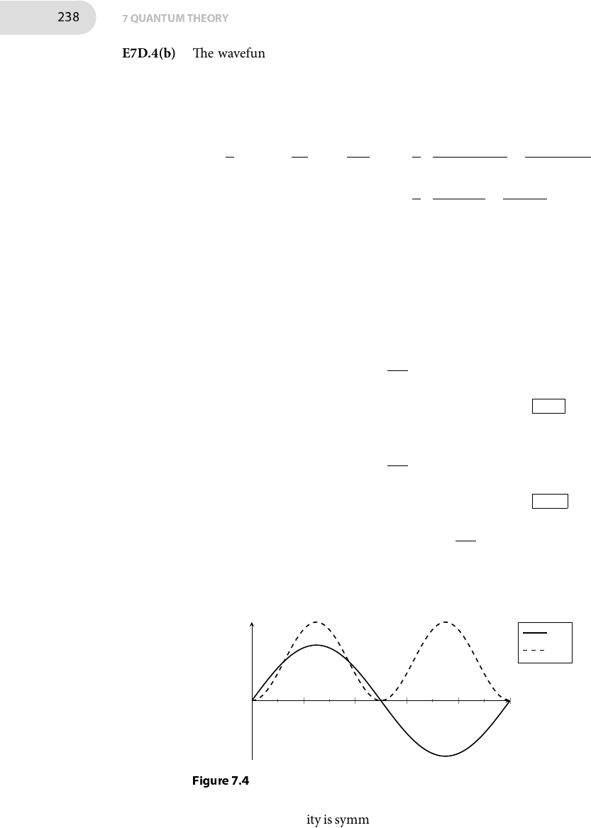 238 7 QUANTUM THEORY E7D.4(b) �e wavefunctions are ψ1(x) = (2/L)1/2 sin(πx/L) and ψ3(x) = (2/L)1/2 × sin(3πx/L). �ey are orthogonal if ∫ ψ∗1ψ2 dτ = 0. In this case the integral is taken from x = 0 to x = L as outside this range the wavefunctions are zero.�e required integral is of the form of Integral T.5, with A = π/L, B = 3π/L, and a = L 2 L ∫ L 0 sin(πx L ) sin(3πx L )dx = 2 L [ sin(−2πL/L) −4π/L − sin(4πL/L) 8π/L ] = 2 L [ sin(−2π) −4π/L − sin(4π) 8π/L ] = 0 where sin nπ = 0 for integer n is used.�e two wavefunctions are orthogonal. E7D.5(b) �e particle in a boxwavefunctionwith quantumnumber n is given byψn(x) = (2/L)1/2 sin(nπx/L)�e probability of �nding the electron in a small region of space δx centred on position x is approximated as ψ2(x)δx. For this Exercise x = 0.66L, δx = 0.02L. For the case where n = 1 ψ1(0.66L)2 × 0.02L = [ √ 2/L sin (π(0.66L)/L)] 2 × 0.02L = (2/L) sin2(0.66π) × 0.02L = 0.031 For the case where n = 2 ψ2(0.66L)2 × 0.02L = [ √ 2/L sin (2 × π(0.66L)L)] 2 × 0.02L = (2/L) sin2(1.32π) × 0.02L = 0.029 E7D.6(b) �e wavefunction with n = 2 and is ψ2(x) = √ 2/L sin(2πx/L), which leads to a probability density P2(x) = ∣ψ2(x)∣2 = (2/L) sin2(2πx/L). Graphs of these functions are shown in Fig 7.4. 0.2 0.4 0.6 0.8 1.0 x/L ψ2 ψ22 Figure 7.4 �e probability density is symmetric about x = L/2.�erefore, there is an equal probability of observing the particle at an arbitrary position x′ and at L− x′, so it follows that the average position of the particle must be at L/2.