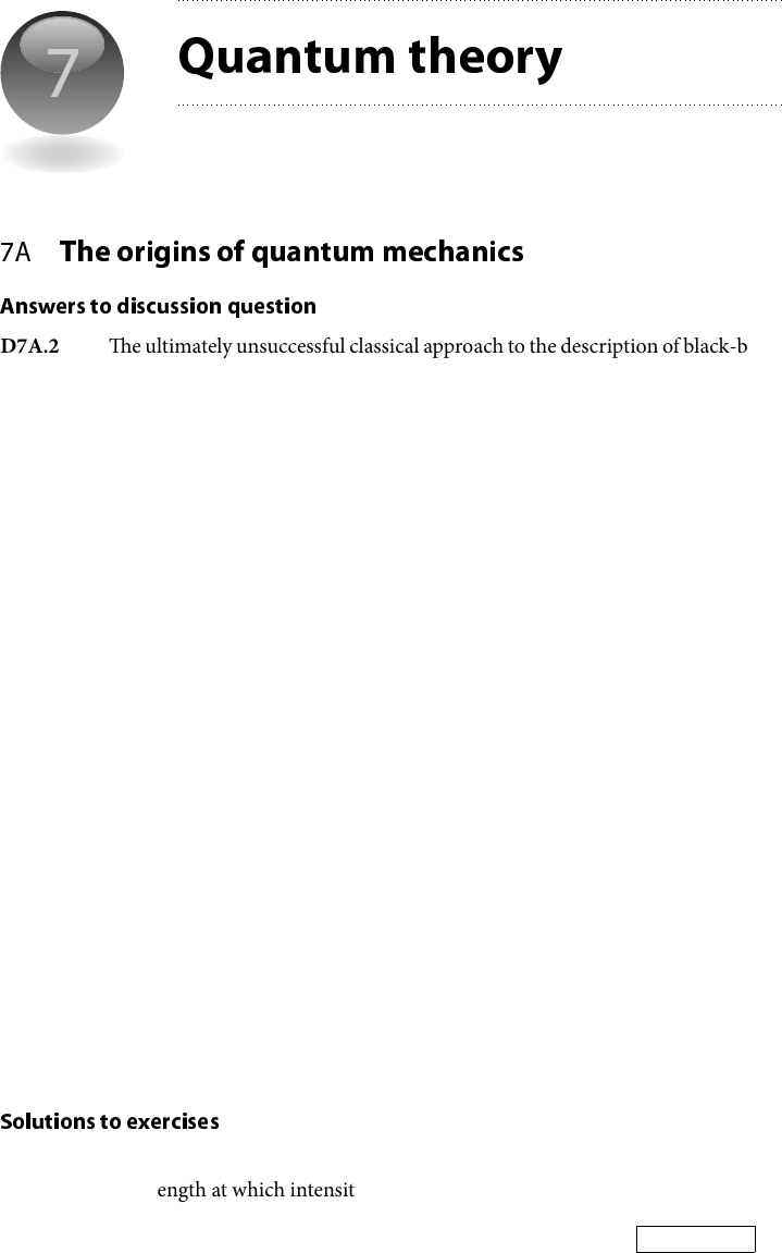 7 Quantum theory 7A The origins of quantummechanics Answers to discussion question D7A.2 �e ultimately unsuccessful classical approach to the description of black-body radiation involved assuming that the radiation resulted fromoscillating electric charges in the walls of the body, and that each oscillator has the same average energy as predicted by the equipartition principle. �is view results in the ultra-violet catastrophe, in which the radiation increases without limit as the wavelength becomes shorter. Planck assumed two things: �rst, that the oscillators could only have energies given by E = nhν, where ν is the frequency and n is 0, 1, 2, . . .; second, that the probability of an individual oscillator having a particular energy is described by the Boltzmann distribution. As the frequency of the oscillator or the value of n increases, so does its energy and the Boltzmann distribution predicts that such a state is less likely. In addition, the highest frequency oscillations may not be excited at all, that is have n = 0, on the grounds that the resulting state has too high an energy to be populated. Planck’s theory therefore avoids the ultraviolet catastrophe by having no excitation of highest frequency oscillators. D7A.4 By wave-particle duality it is meant that in some experiments an entity be- haves as a wave while in other experiments the same entity behaves as a par- ticle. Electromagnetic radiation behaves as a wave in di�raction experiments but it behaves as particulate photons in absorption and emission spectroscopy. Electrons behave as waves in di�raction experiments, but as particles in the photoelectric e�ect. �e development of quantum theory is much concerned with the need to em- brace this wave-particle duality and, as is explained in the following Topics, this is exempli�ed by the introduction of the wavefunction to describe the properties of a particles and the notion of ‘complementary variables’ such as position and momentum. Solutions to exercises E7A.1(b) Wien’s law [7A.1–238], λmaxT = 2.9 × 10−3 mK, is rearranged to give the wavelength at which intensity is maximised λmax = (2.9 × 10−3 mK)/T = (2.9 × 10−3 mK)/(2.7 K) = 1.1 × 10−3 m
