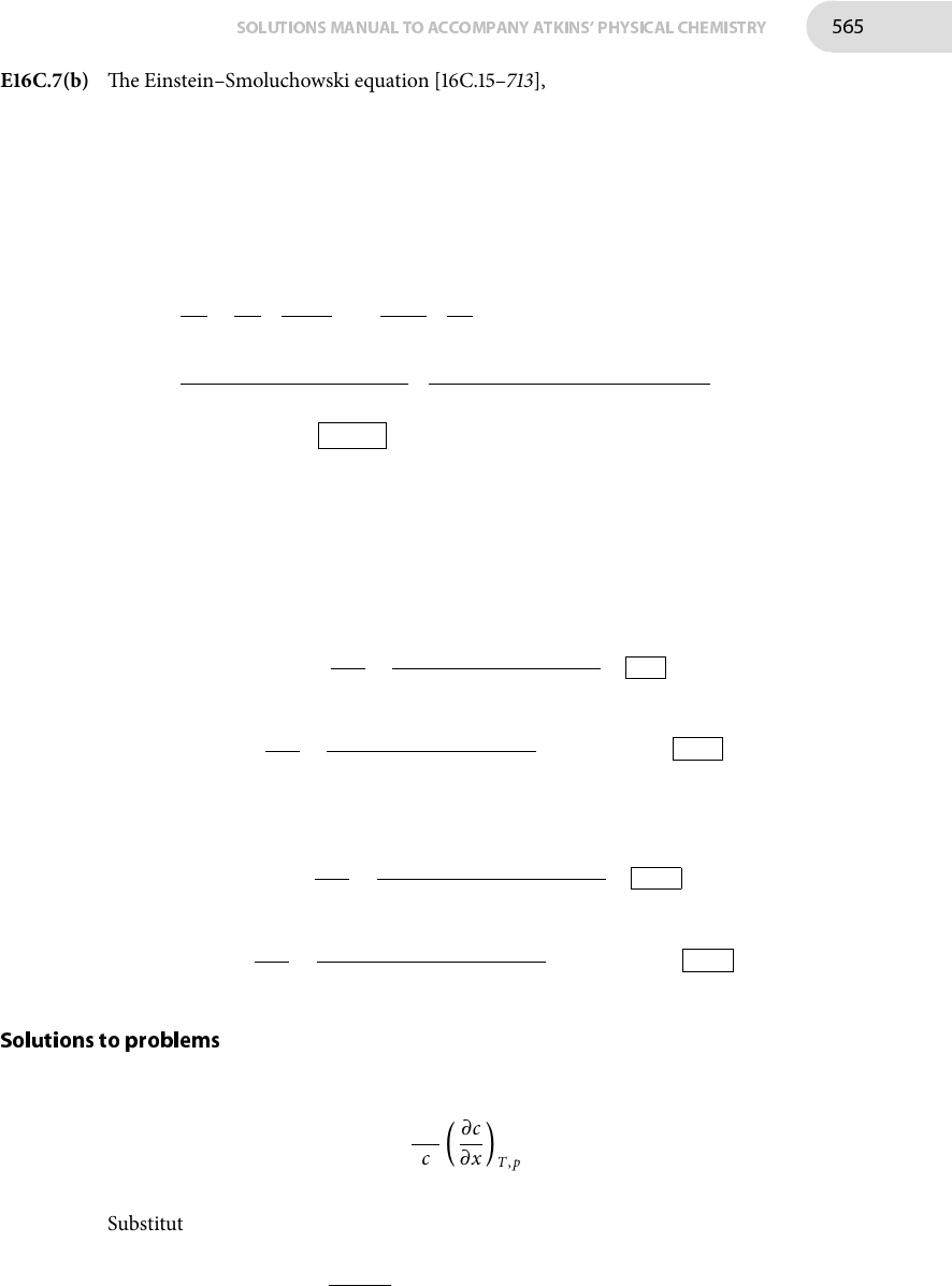 SOLUTIONSMANUAL TO ACCOMPANY ATKINS' PHYSICAL CHEMISTRY 565 E16C.7(b) �e Einstein–Smoluchowski equation [16C.15–713], D = d2/2τ, relates the dif- fusion coe�cient D to the jump distance d and time τ required for a jump. Approximating the jump length as the molecular diameter, then d ≈ 2a where a is the e�ective molecular radius.�is is estimated using the Stokes–Einstein equation [16C.4b–708], D = kT/6πηa, to give 2a = 2kT/6πηD. Combining these expressions and using the value η = 0.386 × 10−3 kgm−1 s−1 for the viscosity of heptane gives τ = d 2 2D = 1 2D ( 2kT 6πηD ) 2 = 1 18D3 ( kT πη ) 2 = 1 18 × (3.17 × 10−9 m2 s−1)3 ((1.3806 × 10−23 JK−1) × (298 K) π × (0.386 × 10−3 kgm−1 s−1) ) 2 = 2.01 × 10−11 s = 20.1 ps E16C.8(b) �e root mean square displacement in three dimensions is given by equation [16C.13b–712], ⟨r2⟩1/2 = (6Dt)1/2, where D is the di�usion coe�cient and t is the time period.�erefore t = ⟨r2⟩/6D. For an iodine molecule in benzene, D = 2.13 × 10−9 m2 s−1 t(1.0 mm) = ⟨r2⟩ 6D = (1.0 × 10−3 m)2 6 × (2.13 × 10−9 m2 s−1) = 78 s t(1.0 cm) = ⟨r2⟩ 6D = (1.0 × 10−2 m)2 6 × (2.13 × 10−9 m2 s−1) = 7.8 × 103 s = 2.2 h For a sucrose molecule in water, D = 0.5216 × 10−9 m2 s−1 t(1.0 mm) = ⟨r2⟩ 6D = (1.0 × 10−3 m)2 6 × (0.5216 × 10−9 m2 s−1) = 320 s t(1.0 cm) = ⟨r2⟩ 6D = (1.0 × 10−2 m)2 6 × (0.5216 × 10−9 m2 s−1) = 3.2 × 104 s = 8.9 h Solutions to problems P16C.2 �e thermodynamic force F is given by [16C.3b–706] F = −RT c ( ∂c ∂x ) T ,p Substituting c(x) = c0e−ax 2 into the above expression gives F = − RT c0e−ax2 (−2ac0xe−ax 2 ) = 2axRT