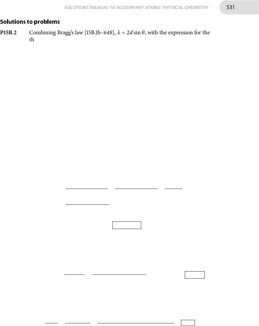 SOLUTIONSMANUAL TO ACCOMPANY ATKINS' PHYSICAL CHEMISTRY 531 Solutions to problems P15B.2 Combining Bragg’s law [15B.1b–648], λ = 2d sin θ, with the expression for the the separation of planes for a cubic lattice [15A.1a–645], dhk l = a/(h2 + k2 + l 2)1/2, gives sin θ = (λ/2a) (h2 + k2 + l 2)1/2. �e di�raction patterns for cubic cells of di�erent types is illustrated in Fig. 15B.10 on page 652. Di�raction is possible for all (hkl) planes for a cubic P lattice, but re�ections corresponding to (h+k+ l) odd are absent for a cubic I lattice. For a cubic F lattice, re�ections are absent where two out of h, k and l are odd.�ese systematic absences in a di�raction pattern allow the lattice type to be assigned. �e observation of a (100) re�ection, for which (h + k + l) is odd, rules out cubic I. �e observation of a (110) re�ection, for which h and k are odd, but l is even, rules out cubic F.�erefore polonium must be cubic P, for which all re�ections are present. �e sequence of re�ections expected for cubic P is shown in Fig. 15B.10 on page 652: the ��h, sixth and seventh re�ections are (210), (211) and (220), respectively.�e sine of the re�ection angle is proportional to (h2+k2+ l 2)1/2, which for these three re�ections is 51/2, 61/2, and 81/2: the separation between the sixth and seventh is indeed larger than that between the ��h and sixth, as described. �e cell dimension is calculated from a = λ(h2 + k2 + l 2)1/2/(2 sin θ); each re�ection allows a separate determination of a. For the (100) re�ection a = λ(h2 + k2 + l 2)1/2 2 sin θ = λ(12 + 02 + 02)1/2 2 sin θ = λ(1)1/2 2 sin θ = (154 pm) × (1)1/2 2 × 0.225 = 3.42... × 102 pm Similar calculations for the other re�ections given a = 3.44... × 102 pm and a = 3.43... × 102 pm.�e average is a = 344 pm . P15B.4 Combining Bragg’s law [15B.1b–648], λ = 2d sin θ, with the expression for the the separation of planes for a cubic lattice [15A.1a–645], dhk l = a/(h2 + k2 + l 2)1/2, gives sin θ = (λ/2a) (h2 + k2 + l 2)1/2. For the same re�ection, a is proportional to 1/ sin θ, therefore aKCl = aNaCl sin θNaCl sin θKCl = (564 pm) × (sin 6.00○) sin 5.38○ = 628.7... pm = 629 pm �e mass density ρ is ρ = m/V , where m is the mass of the unit cell. If there are N formula units per cell then ρ = NM/NAV , where M is the molar mass of a formula unit. Based on the cell parameter a, the ratio of densities of KCl and NaCl is therefore ρKCl ρNaCl = MKCla3NaCl MNaCla3KCl = (74.55 gmol−1) × (564 pm)3 (58.44 gmol−1) × (628.7... pm)3 = 0.921 �e experimentally determined ratio ofmass densities is 1.99 g cm−3/2.17 g cm−3= 0.917, which is close to the value determined from the di�raction data.�e data therefore support the X-ray analysis.