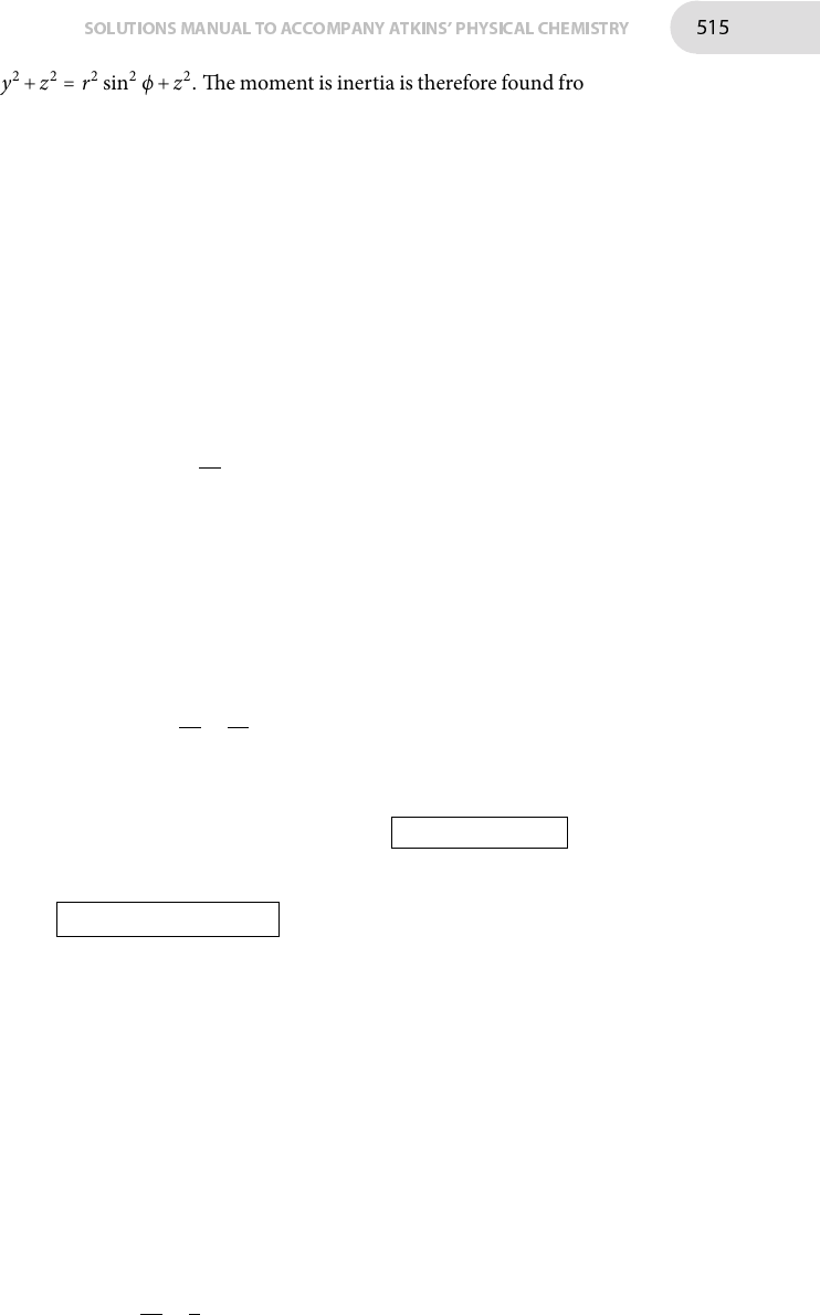 SOLUTIONSMANUAL TO ACCOMPANY ATKINS' PHYSICAL CHEMISTRY 515 y2+z2 = r2 sin2 ϕ+z2.�e moment is inertia is therefore found from the integral I = ∫ cyl. (r2 sin2 ϕ + z2) × ρ dV = ρ∫ cyl. r2 sin2 ϕ dV ´¹¹¹¹¹¹¹¹¹¹¹¹¹¹¹¹¹¹¹¹¹¹¹¹¹¹¹¹¹¹¹¹¹¹¹¹¹¹¹¹¹¹¹¹¹¹¹¹¸¹¹¹¹¹¹¹¹¹¹¹¹¹¹¹¹¹¹¹¹¹¹¹¹¹¹¹¹¹¹¹¹¹¹¹¹¹¹¹¹¹¹¹¹¹¹¹¶ A + ρ∫ cyl. z2 dV ´¹¹¹¹¹¹¹¹¹¹¹¹¹¹¹¹¹¹¹¹¹¹¹¹¹¹¸¹¹¹¹¹¹¹¹¹¹¹¹¹¹¹¹¹¹¹¹¹¹¹¹¹¶ B where the integration is over the complete cylinder. �e integrals A and B are conveniently evaluated separately. A =ρ∫ z=+l/2 z=−l/2 ∫ r=a r=0 ∫ ϕ=2π ϕ=0 r2 sin2 ϕ × r dz dr dϕ =ρ∫ z=+l/2 z=−l/2 dz∫ r=a r=0 r3 dr∫ ϕ=2π ϕ=0 sin2 ϕ dϕ =ρ × l × a 4 4 × π = ρl a4π/4 = mtota2/4 where the integral over ϕ is found using Integral T.2 with k = 1 and a = 2π. B =ρ∫ z=+l/2 z=−l/2 ∫ r=a r=0 ∫ ϕ=2π ϕ=0 z2 × r dz dr dϕ =ρ∫ z=+l/2 z=−l/2 z2 dz∫ r=a r=0 r dr∫ ϕ=2π ϕ=0 dϕ =ρ × l 3 12 × a 2 2 × 2π = ρl 3a2π/12 = mtot l 2/12 �e moment of inertia about the perpendicular axis is therefore I� = A+ B = mtota2/4 +mtot l 2/12 = mtot(a2/4 + l 2/12) A rigid rotor with the same totalmass hasmoment of inertia I = mtotR2g,�, hence Rg,� = (a2/4 + l 2/12)1/2 . (c) Consider the moment of inertia about the z-axis passing through the centre of a solid sphere. �e square of the perpendicular distance of a point to this axis is x2 + y2, hence I = ∫sphere(x 2 + y2)ρ dV . In spherical polar coordinates x2 + y2 = r2 sin2 θ cos2 ϕ + r2 sin2 θ sin2 ϕ = r2 sin2 θ �e integral is therefore evaluated as I =ρ∫ r=a r=0 ∫ θ=π θ=0 ∫ ϕ=2π ϕ=0 (r2 sin2 θ) × r2 sin θ dr dθ dϕ =ρ∫ r=a r=0 r4 dr∫ θ=π θ=0 sin3 θ dθ ∫ ϕ=2π ϕ=0 dϕ =ρ × a 5 5 × 4 3 × 2π