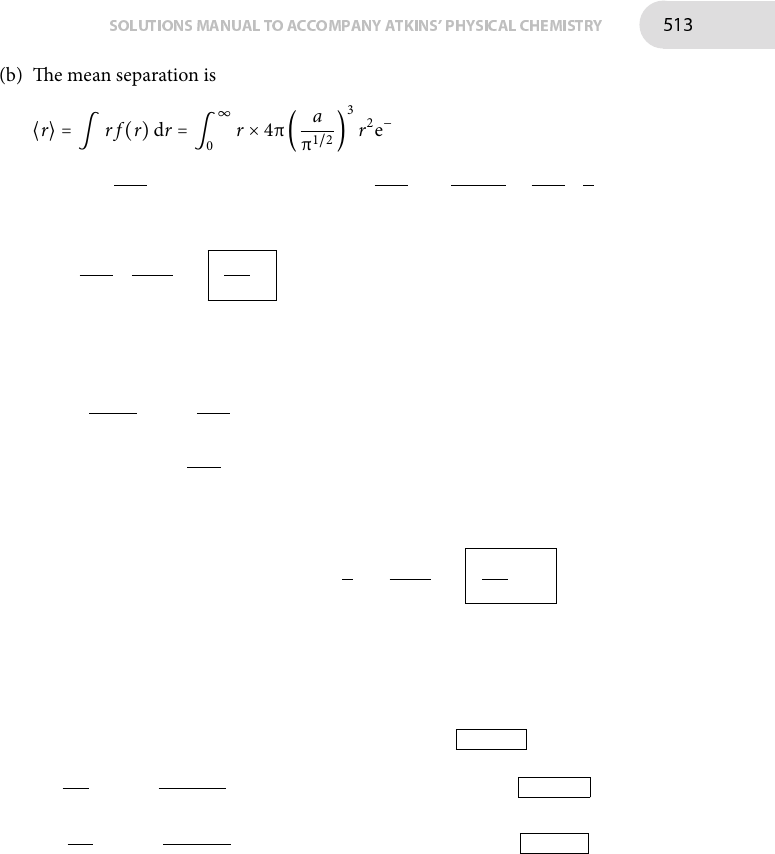 SOLUTIONSMANUAL TO ACCOMPANY ATKINS' PHYSICAL CHEMISTRY 513 (b) �e mean separation is ⟨r⟩ = ∫ r f (r)dr = ∫ ∞ 0 r × 4π ( a π1/2 ) 3 r2e−a 2 r2 = 4π ( a π1/2 ) 3 ∫ ∞ 0 r3e−a 2 r2 ´¹¹¹¹¹¹¹¹¹¹¹¹¹¹¹¹¹¹¹¹¹¹¹¹¹¹¹¹¹¸¹¹¹¹¹¹¹¹¹¹¹¹¹¹¹¹¹¹¹¹¹¹¹¹¹¹¹¹¶ Integral G.4 with k = a2 = 4π ( a π1/2 ) 3 × 1 2(a2)2 = 2 π1/2 ( 1 a ) = 2 π1/2 (2Nl 2 3 ) = (8N 3π ) l (c) �e most probable separation is the value of r for which f (r) is a maxi- mum. Di�erentiating f (r) using the product rule gives d f (r) dr = 4π ( a π1/2 ) 3 × [(2r)(e−a 2 r2) + (r2)(−2a2re−a 2 r2)] = π ( a π1/2 ) 3 × 2re−a 2 r2 [1 − a2r2] At the maximum d f (r)/dr = 0, which implies that r(1 − a2r2) = 0 hence rmp = 1 a = (2Nl 2 3 ) = (2N 3 ) 1/2 l �e solution r = 0 is rejected because this does not correspond to a max- imum, as implied by the fact that f (0) = 0. For the case that N = 4000 and l = 154 pm these expressions give Rrms = N1/2 l = 40001/2 × (154 pm) = 9.73... × 103 pm = 9.74 nm ⟨r⟩ = (8N 3π ) 1/2 l = (8 × 4000 3π ) 1/2 × (154 pm) = 8.97... × 103 pm = 8.97 nm rmp = (2N 3 ) 1/2 l = (2 × 4000 3 ) 1/2 × (154 pm) = 7.95... × 103 pm = 7.95 nm P14D.4 �ere is some lack of clarity in the text over the de�nition of the radius of gyration, Rg. For a polymer consisting of N identical monomer units, Rg is de�ned as R2g = (1/N) N ∑ i=1 r2i (14.1) where r i is the distance of monomer unit i from the centre of mass. In other words, the radius of gyration is the root-mean-square of the distance of the monomer units from the centre of mass. A related quantity is the moment of inertia I about an axis, which is de�ned in the following way I = N ∑ i=1 md2i (14.2)