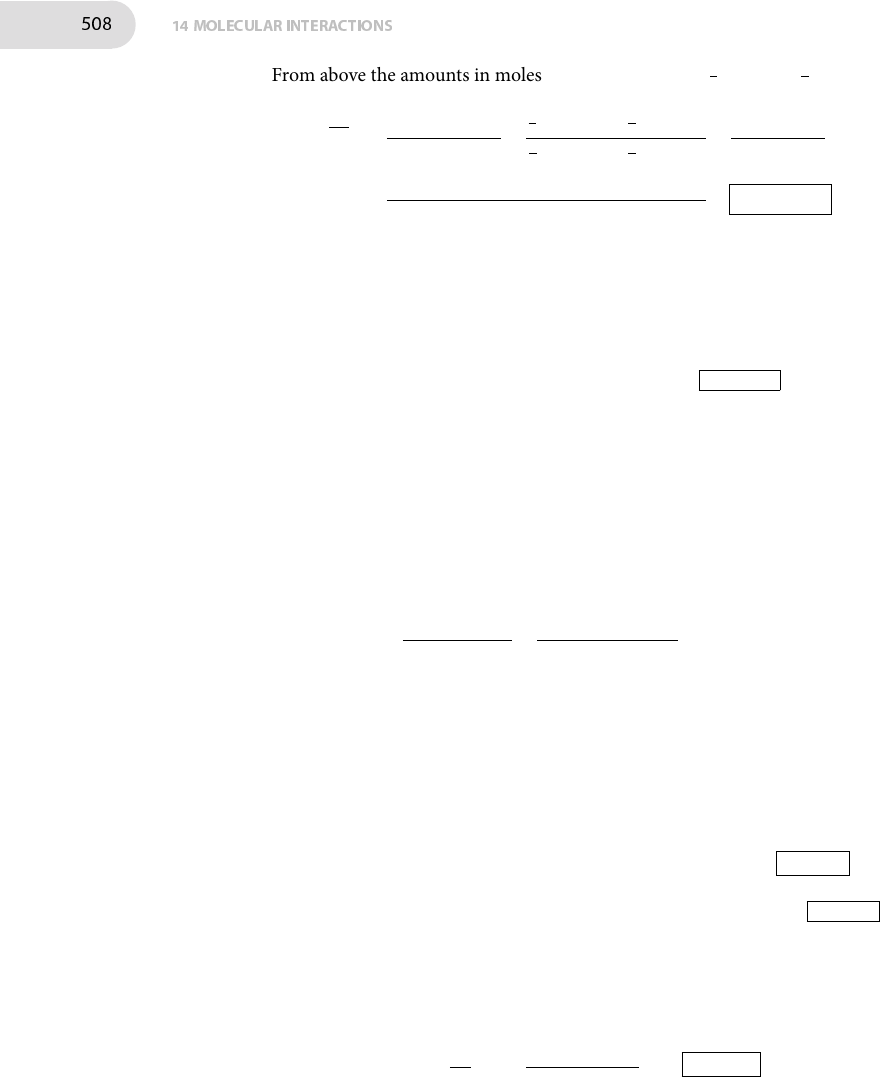 508 14MOLECULAR INTERACTIONS From above the amounts in moles of each polymer are 35ntotal and 2 5ntotal so MW = n1M 2 1 + n2M22 n1M1 + n2M2 = 3 5ntotalM 2 1 + 2 5ntotalM 2 2 3 5ntotalM1 + 2 5ntotalM2 = 3M 2 1 + 2M22 3M1 + 2M2 = 3 × (62 kgmol−1)2 + 2 × (78 kgmol−1)2 3 × (62 kgmol−1) + 2 × (78 kgmol−1) = 69 kgmol−1 E14D.2(b) �e rootmean square separation of the ends of a freely jointed one-dimensional chain is given by [14D.6–617], Rrms = N1/2 l , whereN is the number ofmonomer units and l is the length of each unit. In this case Rrms = N1/2 l = 12001/2 × (1.125 nm) = 38.97 nm E14D.3(b) �e contour length Rc of a polymer is given by [14D.5–617], Rc = Nl , and the root mean square separation of the ends of a freely jointed one-dimensional chain is given by [14D.6–617], Rrms = N1/2 l . In both cases N is the number of monomer units and l is the length of each unit. �emonomer of polypropene –[CH2CH(CH3)]n– is taken to beCH2CH(CH3). �e number of monomers in the chain is given by N = Mpolymer MCH2CH(CH3) = 174 × 10 3 gmol−1 42.0774 gmol−1 = 4.13... × 103 �e length of each CH2CH(CH3) unit is estimated as the length of a two C–C bonds: one C–C bond in the centre and half a bond length either side where the unit connects to carbons in adjacent units. From Table 9C.2 on page 362 in the Resource section a C–C bond length is approximately 154 pm, so the monomer length l is taken as 2× (154 pm) = 308 pm.�e contour length and root mean square separation are then given by Rc = Nl = (4.13... × 103) × (308 pm) = 1.27... × 106 pm = 1.27 µm Rrms = N1/2 l = (4.13... × 103)1/2 × (308 pm) = 1.98... × 104 pm = 19.8 nm E14D.4(b) �e radius of gyrationRg of a one-dimensional randomcoil is given by [14D.7a– 618], Rg = N1/2 l . Rearranging gives N = ( Rg l ) 2 = ( 18.9 × 10 −9 m 450 × 10−12 m ) 2 = 1.8 × 103 E14D.5(b) �e probability that the ends of a one-dimensional random coil are a distance nl apart is given by [14D.3–616], P = (2/πN)1/2e−n 2/2N where N is the total number of monomers in the chain and l is the length of each monomer unit.
