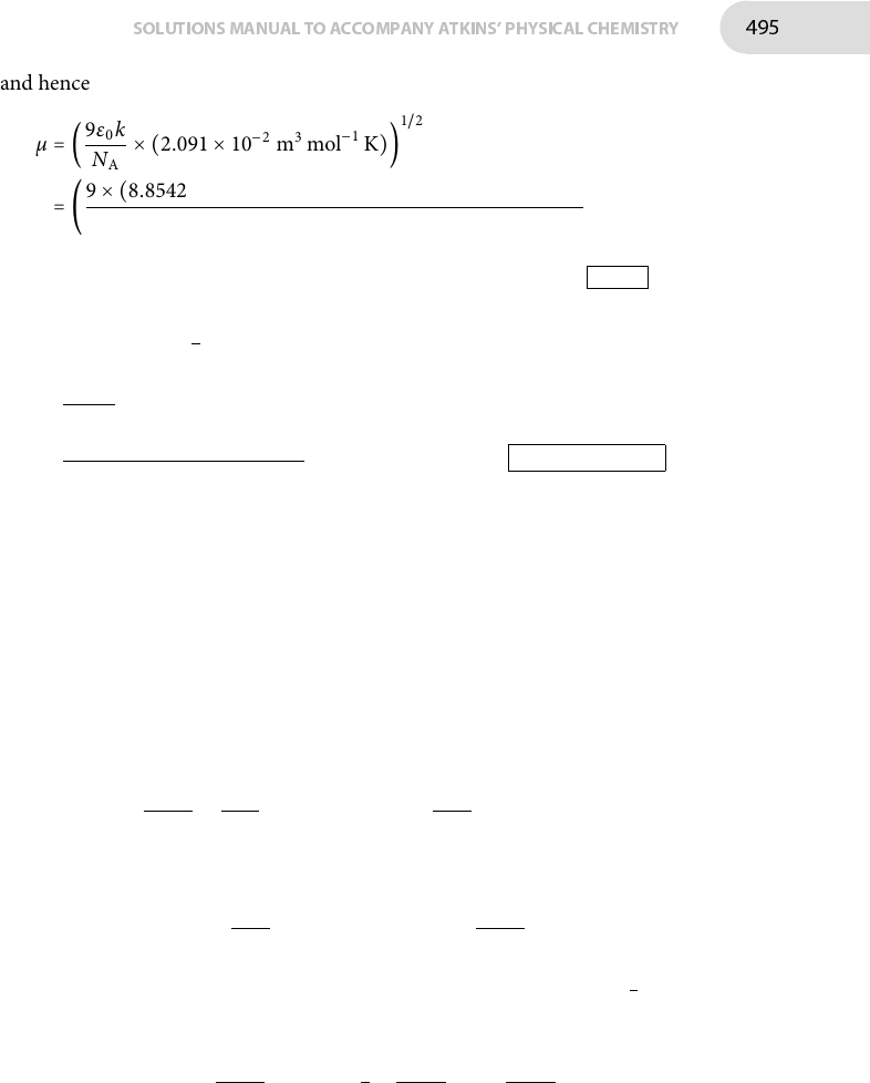 SOLUTIONSMANUAL TO ACCOMPANY ATKINS' PHYSICAL CHEMISTRY 495 and hence µ = (9ε0k NA × (2.091 × 10−2 m3mol−1 K)) 1/2 = (9 × (8.8542 × 10−12 J−1 C2m−1) × (1.3806 × 10−23 JK−1) 6.0221 × 1023mol−1 ×(2.09 × 10−2 m3mol−1 K)) 1/2 = 6.17... × 10−30 Cm = 1.85 D Similarly, identifying 43πNAα′ with the intercept gives α′ = 3 4πNA × (3.27 cm3mol−1) = 3 4π × (6.0221 × 1023mol−1) × (3.27 cm3mol−1) = 1.30 × 10−24 cm3 P14A.12 �e relationship between refractive index and relative permittivity is given by [14A.13–592], nr = ε1/2r . In addition the relationship between relative permit- tivity and the molar polarization is given by the Debye equation [14A.10–590], (εr − 1)/(εr + 2) = ρPm/M where ρ is the mass density and M is the molar mass. �emass density ρ is given byM/Vm, whereVm is themolar volume. Assuming perfect gas behaviour, Vm = RT/p, so ρ = pM/RT and hence the Debye equation becomes εr − 1 εr + 2 = pPm RT hence εr − 1 = pPm RT (εr + 2) If εr ≈ 1 then (εr + 2) ≈ 3 so the equation becomes εr − 1 = pPm RT × 3 hence εr = 1 + 3pPm RT Introducing nr = ε1/2r and using the series expansion (1 + x)1/2 ≈ 1 + 1 2 x for small x gives nr = (1 + 3pPm RT ) 1/2 ≈ 1 + 1 2 × 3pPm RT = 1 + 3pPm 2RT �is expression implies that a plot of nr against p should be a straight line of slope 3Pm/2RT . Hence, by measuring nr as a function of pressure, the molar polarization Pm can be determined. �e molar polarization is given by [14A.11–590], Pm = (NA/3ε0)(α+ µ2/3kT). However, assuming that the frequency of oscillation of the electric �eld is high, as it will be for visible light, there will be no contribution from orientation po- larization because themolecules cannot reorientate themselves quickly enough to follow the �eld. �erefore the term µ2/3kT in the expression for Pm does