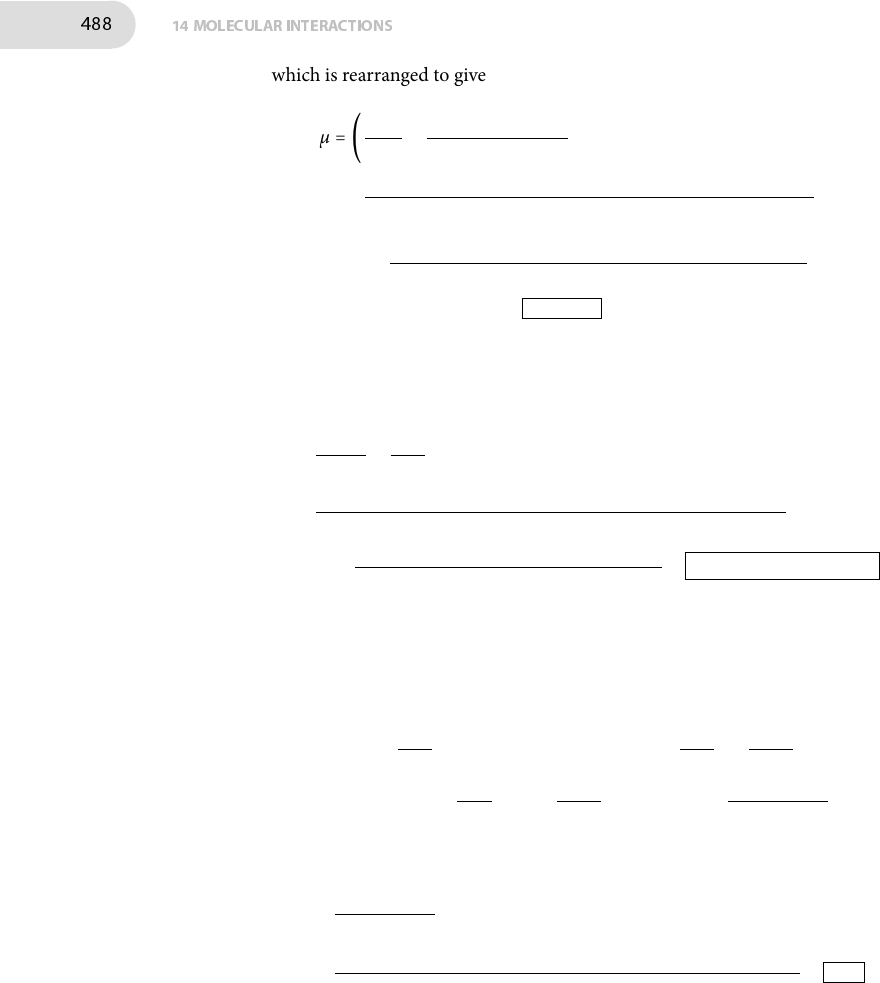 488 14MOLECULAR INTERACTIONS which is rearranged to give µ = (9ε0k NA × Pm(T2) − Pm(T1) 1/T2 − 1/T1 ) 1/2 = (9 × (8.8542 × 10−12 J−1 C2m−1) × (1.3806 × 10−23 JK−1) 6.0221 × 1023mol−1 ×(71.43 × 10−6 m3mol−1) − (75.74 × 10−6 m3mol−1) 1/(421.7 K) − 1/(320.0 K) ) 1/2 = 3.23... × 10−30 Cm = 0.9690 D �e value of α is found using this value of µ together with one of the data points; both give the same answer. Rearranging [14A.11–590], Pm = (NA/3ε0)(α + µ2/3kT), for α and using the data for 320.0 K gives α = 3ε0Pm NA − µ2 3kT = 3 × (8.8542 × 10−12 J−1 C2m−1) × (75.74 × 10−6 m3mol−1) 6.0221 × 1023mol−1 − (3.23... × 10−30 Cm)2 3 × (1.3806 × 10−23 JK−1) × (320.0 K) = 2.552 × 10−39 C2m2 J−1 E14A.6(b) �e relationship between relative permittivity and molar polarization is given by the Debye equation, [14A.10–590], (εr − 1)/(εr + 2) = ρPm/M. Rearranging gives εr − 1 = ρPm M (εr + 2) hence εr − 1 = εr ( ρPm M ) + 2ρPm M hence εr (1 − ρPm M ) = 1 + 2ρPm M hence εr = 1 + 2ρPm/M 1 − ρPm/M Taking the molar mass asM = 85.0 gmol−1 gives εr = 1 + 2ρPm/M 1 − ρPm/M = 1 + 2 × (1.92 g cm−3) × (32.16 cm3mol−1)/(85.0 gmol−1) 1 − (1.92 g cm−3) × (32.16 cm3mol−1)/(85.0 gmol−1) = 8.97 E14A.7(b) �e relationship between the refractive index nr at a speci�ed wavelength and the relative permittivity εr at the same wavelength is given by [14A.13–592], nr = ε1/2r , hence εr = n2r . In addition the relationship between relative per- mittivity and the polarizability α is given by the Clausius–Mossotti equation, [14A.12–590], (εr − 1)/(εr + 2) = ρNAα/3Mε0. In using this equation it is assumed that there are no contributions from permanent electric dipole mo- ments to the polarization, either because themolecules are nonpolar or because