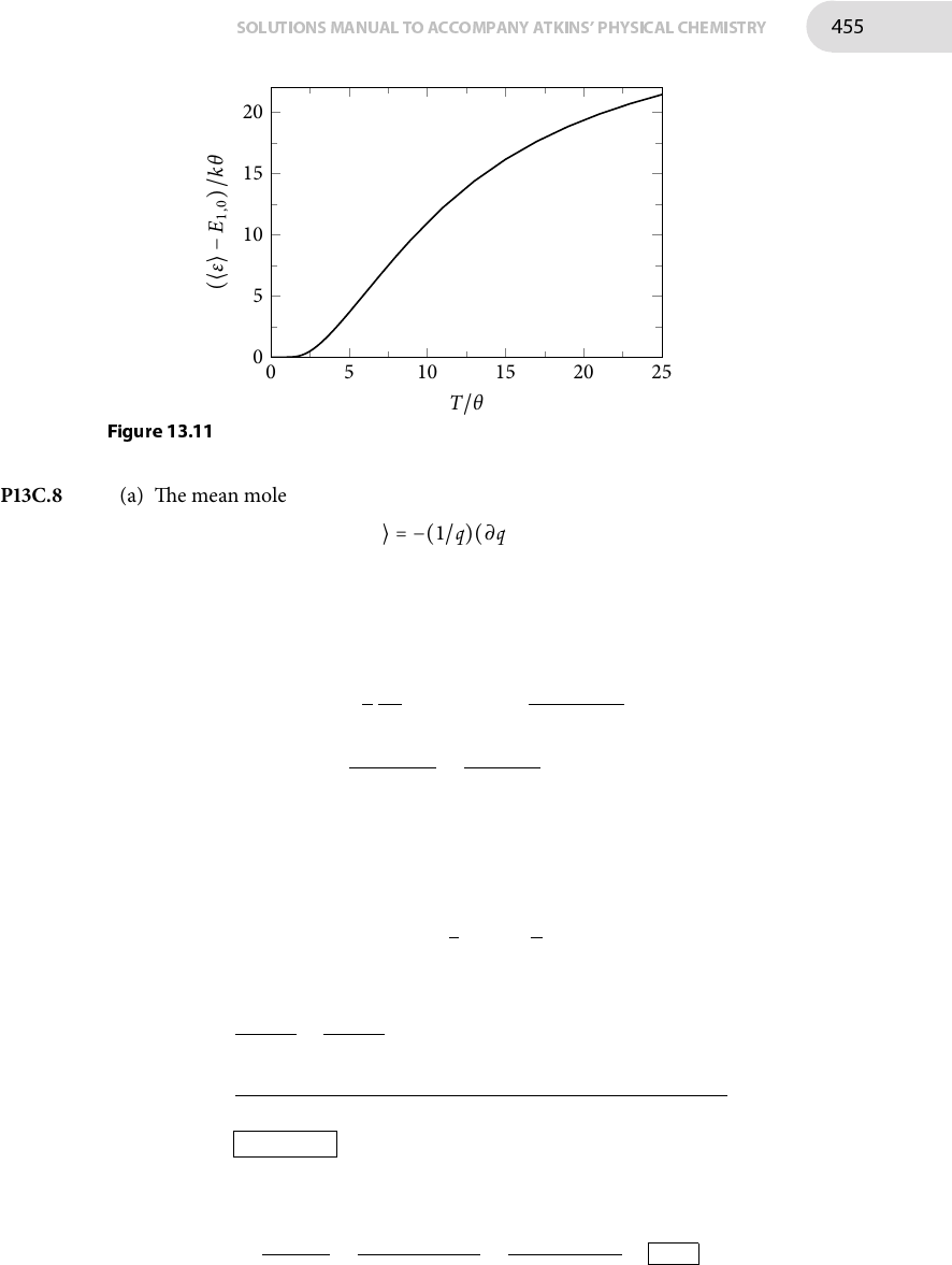 SOLUTIONSMANUAL TO ACCOMPANY ATKINS' PHYSICAL CHEMISTRY 455 0 5 10 15 20 25 0 5 10 15 20 T/θ (⟨ ε⟩ − E 1 ,0 )/ kθ Figure 13.11 P13C.8 (a) �e mean molecular energy is given by [13C.4a–549] ⟨ε⟩ = −(1/q)(∂q/∂β)V where β = 1/kT and q is the partition function given by [13A.11–535], q = ∑i e−βε i . For the uniformly spaced set of energy levels, ε j = jε, the partition function is given by [13B.2a–539], q = ∑ j e−β jε = 1/(1 − e−βε). With these results the mean energy is calculated as ⟨ε⟩ = −1 q dq dβ = −(1 − e−βε) −εe−βε (1 − e−βε)2 = εe−βε (1 − e−βε) = ε (eβε − 1) Setting ⟨ε⟩ = aε aε = ε/(eβε − 1) eβε = 1 + 1/a thus β = 1 ε ln(1 + 1 a ) Given ⟨ε⟩ = ε, it follows that a = 1. Because T = 1/kβ and ε = hcν̃ T = ε k ln(2) = hcν̃ k ln(2) = (6.6261 × 10−34 J s) × (2.9979 × 1010 cms−1) × (50 cm−1) (1.3806 × 10−23 JK−1) × ln(2) = 1.0 × 102 K (b) If ⟨ε⟩ = aε it follows from the above discussion that βε = ln(1 + 1/a), therefore q = 1 1 − e−βε = 1 1 − e− ln(1+1/a) = 1 1 − a/(a + 1) = a + 1