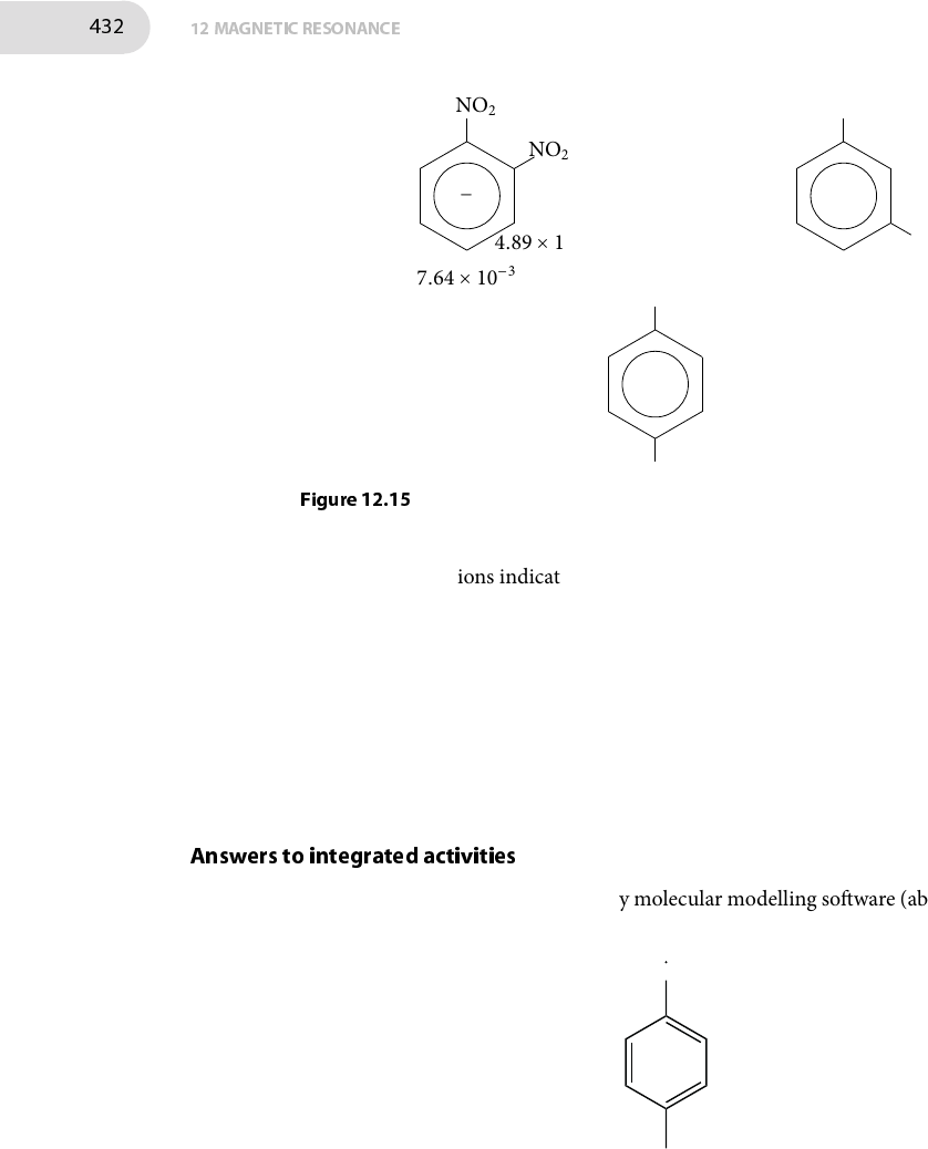 432 12MAGNETIC RESONANCE NO2 7.64 × 10−3 − NO2 4.89 × 10−3 4.89 × 10−3 7.64 × 10−3 NO2 NO2 − 0.0498 0.0498 0.0498 0.0498 NO2 0.200 − NO2 0.1210.200 0.048 Figure 12.15 P12D.8 Simple considerations indicate that the EPR spectrum of 1 will be a 1:1:1 triplet on account of the coupling of the electron to a single 14N, which has I = 1. Elec- tron exchange, resulting from the physical interaction of two radicals, results in a scrambling of the spin state of the electron because the electron which is exchanged has an equal change of being in the α or β spin states. Such scrambling at �rst causes a broadening of the lines in the hyper�ne multiplet, and if it is at a high enough rate the lines merge. For even faster rates, the merged line narrows. �is is analogous to the e�ect that chemical exchange has on the coupling patterns seen in NMR, Section 12B.4 on page 505. Answers to integrated activities I12.2 (a) �e spin densities, computed by molecular modelling so�ware (ab initio, density functional theory, Gaussian 98), are shown below O CH3 0.409 0.271 − 0.082 − 0.129 0.369 0.299 − 0.135 − 0.024 �e computed spin densities for the the two protons ortho to the oxygen, and to the two protonsmeta to the oxygen are di�erent.�is is undoubt- edly a computational artefact, a result of the minimum-energy structure having one methyl proton in the plane of the ring, which makes the right and le� side of the ring slightly non-equivalent. Fast internal rotation